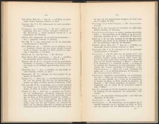 114 Tepe (Erven Wed. B.). — Aan de ontheffing van plaatselijke direkte belasting verleend, 18 April. TERMATEN (Dr. P. J. F.), herbenoemd tot stads geneesheer, 20 December. Teruggave van belasting. — De post — (41) op de begrooting 1864 met f 47,000 verhoogd, 9 Februari. — Zie: Belasting. — Adres, houdende verzoek om — op gedisteleerd; zie: WARNINK. TerwiEL (H.), daghuurder bij de stads bestratingwerken. Aan — gagement verleend, 11 Januarij. Tex (Mr. N. J. DEN), herbenoemd tot lid der plaatselijke schoolkommissie, 6 December. Texel (Beurtveer op). — Adressen van de schippers in het —, houdende verzoek dat geen vierde schipper benoemd worde, in handen van Burg. en Weth. gesteld tot afdoening, 5 September, 8 November. TaiBAuT (A. J.), wed. KLuyvER. — Zie: KLUYVER. Tay (Erven Wed. ALBERDINGK). — Aan de — ontheffing van plaatselijke direkte belasting verleend, 4 Mei. TunssEN (Dr. E. H. G.), benoemd tot lid der gezondheidskommissie, 18 Januarij. — Benoemd tot lid der kommissie van toezigt op de stedelijke geneeskundige dienst, 25 October. TimmMERMANS (W. C.), ontslagen als bouw-opzigter der gemeente, 20 December. TJEBBESs (C.). — Adres van —, verzoekende behoud-der palen voor het perceel XX 594 aan den Buitensingel, in handen van Burg. en Weth. gesteld tot afdoening, 17 Mei. Toe tar (Mr. H. E.), voorgedragen om te worden benoemd tot leeraar aan de hoogere burgerschool met vijfjarigen kursus, 20 Julij, 16 Augustus, 23 Augustus, 5 September. TOEPOEL (A. M.). — Adres van —, aannemer van het leveren van waldeksteenen, verzoekende uitkeering van een hem ingehouden boete wegens te late oplevering, in handen van Burg. en Weth. gesteld tot preadvies, 14 Junij. — Aan — zal worden te kennen gegeven, dat in zijn verzoek, zoo als het daar is liggende, niet kan ie of getreden, maar dat het hem vrijstaat, om, wanneer het debat over de rekening afgeloopen en daarbij van de hem toekomende gelden het bedrag der boete, ad { 630, gekort 115 zal zijn, bij den gemeenteraad teruggave van deze boete aan te vragen, 20 Juli. Toevlugt voor behoeftigen. — Zie: Passeerdergracht. Tomse (F. A. DES), benoemd tot kontròleur der plaatselijke direkte belasting, 16 Februarij. Toorn (A. J. H. vAN DER), benoemd tot lid der plaatselijke kommissie van toezigt op de openbare en bijzondere scholen van middelbaar onderwijs, 20 December. TramPen (Erven Wed. H.). — Aan de — ontheffing van plaatselijke direkte belasting verleend, 13 April. Trottoirs. — Op het adres van VON BOKERN en C°. verzoekende het maken van — op de Reguliersbreestraat, afwijzend beschikt. Eenige bewoners dezer straat hebben in een ander adres hunne bezwaren tegen de inwilliging van dit verzoek uiteengezet, 8 Maart. — Adres van K. M. SPIJKERMAN ce. s., houdende verzoek — te maken in een gedeelte der Vijzelstraat, ter visie nedergelegd, 22 November. Het verzoek ingewilligd, 20 December. — Zie: Vijzelstraaat. — Adres van J. KOK, betreffende het maken van — in de Oude-Doelenstraat, 22 November. — Zie: Doelenstraat (Oude-). Tuinbouw (Algemeene tentoonstelling van voortbrengselen van). — Adres van het bestuur der —, houdende verzoek om eene subsidie van f 3,000 uit de gemeentekas, in handen van Burg. en Weth. gesteld tot preadvies, 18 Januarij. — Dit verzoek toegestaan, 25 Januarij. — De toegekende som te vinden uit de onvoorziene uitgaven 1865, 8 Maart. Turfschuur. — De behandeling van het rapport der financiële kommissie, op de voordragt van Burg. en Weth. om van regenten van het Huiszittenhuis eene — op de 8% THoMAssENn (C.). — Aan — ontheffing van plaatselijke direkte belasting verleend, 13 April. Tooneelvertooningen en andere openbare vermakelijkheden. — Verordeningen op de heffing en op de invordering eener belasting op de — vastgesteld, 27 September. TRAVAGLINO (Mr. J. A. N.), benoemd tot lid der plaatselijke schoolkommissie, 6 December. Tuk (L.), benoemd tot lid der kommissie van bestuur over de inrigting tot het examineren van varenslieden, 6 December. Turf. — De plaatselijke belasting op den — met 1 Mei 1866 afgeschaft, 20 December. Turfmolm. — Zie: Brandstoffen.