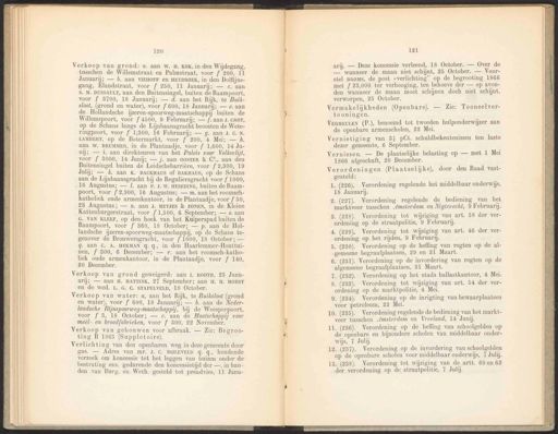 120 Verkoop van grond: a. aan W. H. KOK, in den Wijdegang, tusschen de Willemstraat en Palmstraat, voor f 200, 11 Januarij; — b. aan VIEHOFF en HEYBROEK, in den Dolfijns- gang, Élandstraat, voor f 250, 11 Januarij; — c. aan S. M. DUSSAULT, aan den Buitensingel, buiten de Raampoort, voor f 3700, 18 Januarij; — d. aan het Rijk, te Buik- sloot, (grond en water), voor f 600, 18 Januarij; — e. aan de Hollandsche ijzeren-spoorweg-maatschappij buiten de Willemspoort, voor f 4500, 9 Februarij; — {. aan J. CROT, op de Schans langs de Lijnbaansgracht beoosten de Wete- ringpoort, voor f 1;800, 16 Februarij; — g. aan J. C. N. LAMBERT, op de Botermarkt, voor f 200, 4 Mei; — h. aan W. BRUMMER, in de Plantaadje, voor f 1,600, 14 Ju- nij; — #. aan direkteuren van het Paleis voor Volksvlijt, voor f 3000, 14 Junij; — j. aan OOsTER & C°, aan den Buitensingel buiten de Leidschebarrière, voor f 2,800, 19 Julij; — 4. aan K. BACKHAUS of BAKHAUS, op de Schans aan de Lijnbaansgracht bij de Reguliersgracht voor f 1000, -16 Augustus; — J. aan P. J. w. HESEDING, buiten de Raam- poort, voor f 2,900, 16 Augustus; — m. aan het roomsch- katholiek oude armenkantoor, in de Plantaadje, voor f 50, 23 Augustus; — mn. aan J. MEYJES & ZONEN, in de Kleine Kattenburgerstraat, voor f 1,500, 6 September; — 0. aan G. VAN KLEEF, op den hoek van het Kuiperspad buiten de Raampoort, voor f 360, 18 October; — p. aan de Hol- landsche ijzeren-spoorweg-maatschappij, op de Schans te- genover de Brouwersgracht, voor f 1000, 18 October; — q- aan C. A. HEKMAN q. q., in den Haarlemmer-Houttui- nen, f 300, 6 December; — 7. aan het roomsch-katho- liek oude armenkantoor, in de Plantaadje, voor f 140, 20 December. Verkoop van grond geweigerd: aan 1. ROOTH, 25 Janu- ari; — aan H. HATTINK, 27 September; aan H. H. HORST en de wed. L.G. C. STAPELVELD, 18 October. Verkoop van water: a, aan het Rijk, te Buiksloot (grond en water), voor f 600, 18 Jannarij; — b. aan de Neder- landsche Rijnspoorweg-maatschappij, bij de Weesperpoort, voor f 3, 18 October; — ce. aan de Maatschappij voor meèl- en brood[abrieken, voor f 300, 22 November. Verkoop van gebouwen voor afbraak. — Zie: Begroo- ting B 1865 (Suppletoire). 121 arj. — Deze koncessie verleend, 18 October. — Over de — wanneer de maan niet schijnt, 25 October. — Voor- stel BROMS, de post verlichting” op de begrooting 1866 met { 23,000 ter verhooging, ten behoeve der — op avon- den wanneer de maan moet schijnen doch niet schijnt, verworpen, 25 October. Verlichting van den openbaren weg in deze gemeente door gas. — Adres van mr. J. C. BIJLEVELD q. q., houdende verzoek om koncessie tot het leggen van buizen onder de bestrating enz. gedurende den koneessietijd der —, in han- den van Burg. en Weth. gesteld tot preadvies, 11 Janu- Vermakelijkheden (Openbare). — Zie: Tooneelver- tooningen. VERMEULEN (P.), benoemd tot tweeden hulponderwijzer aan de openbare armenscholen, 22 Mei. Vernietiging van 34 pCt. schuldbekentenissen ten laste dezer gemeente, 6 September. Vernissen. — De plaatselijke belasting op — met 1 Mei 1866 afgeschaft, 20 December. Verordeningen (Plaatselijke), door den Raad vast- gesteld: 1. (226). Verordening regelende het middelbaar onderwijs, 18 Januarij. 2. (227). Verordening regelende de bediening van het marktveer tusschen Amsterdam en Nigtevecht, 9 Februarij. 3. (228). Verordening tot wijziging van art. 58 der ver- ordening op de straatpolitie, 9 Februarij. 4. (229). Verordening tot wijziging van art. 46 der ver- ordening op het rijden, 9 Februarij. 5. (230). Verordening op de heffing van regten op de al- gemeene begraafplaatsen, 29 en 31 Maart. 6. (231). Verordening op de invordering van regten op de algemeene begraafplaatsen, 31 Maart. 7. (232). Verordening op het stads ballastkantoor, 4 Mei. 8. (233). Verordening tot wijziging van art. 54 der ver- ordening op de marktpolitie, 4 Mei. 9. (234). Verordening op de inrigting van bewaarplaatsen voor petroleum, 22 Mei. 10. (285). Verordening regelende de bediening van het markt- veer tusschen Amsterdam en Vreeland, 14 Junij. 11. (286). Verordening op de hefling van schoolgelden op de openbare en bijzondere scholen van middelbaar onder- wijs, 7 Julij. 12. (287). Verordening op de invordering van schoolgelden op de openbare scholen voor middelbaar onderwijs, 7 Juli. 18. (238). Verordening tot wijziging van de artt. 60 en 62 der verordening op de straatpolitie, 7 Juli.
