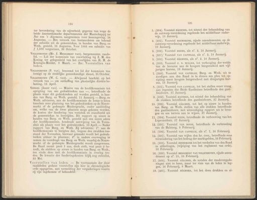 124 ter bevordering van de nijverheid, gegeven van wege de beide Amsterdamsche departementen der Maatschappij tot Nut van ’t Algemeen, aangenomen voor kennisgeving, 16 Augustus. — Het verzoek van bestuurderen om behoud der subsidie uit de gemeentekas, in handen van Burg. en Weth. gesteld, 16 Augustus. Voor 1866 een subsidie van f 1,500 toegestaan, 26 October. VOLLENHOVEN (Mr. J. MESSCHERT VAN), burgemeester, raads- lid. — Lid der kommissie van rouwbeklag bij Z. M. den Koning ter gelegenheid van het overlijden van H. M. de Mein nele 8 Maart. — Zie: Voorstellen van eden. VOLLENHOVEN (P. vAn), benoemd tot lid der kommissie van toezigt op de stedelijke geneeskundige dienst, 25 October, VOLLENHOVEN (W. C. VAN). — Afwijzend beschikt op het verzoek van — om ontheffing van plaatselijke direkte be- lasting, 13 April. 125 1. (384). Voorstel BÜCHNER, tot uitstel der behandeling van de ontwerp-verordening regelende het middelbaar onder- wijs, 18 Januarij. 18. (896). Voorstel VAN CAPPELIE, als n°. 7, 16 Februarij. 14. (897). Voorstel van wijlen den hr. co0L, betreffende eene vermindering van het bedrag der marktgelden, 16 Februarij. 18. (401). Voorstel BüCHNER, tot het doen drukken en al- ES ESES VoNpEL (Joost vAn). — Missive van de hoofdkommissie tot oprigting van een gedenkteeken aan —, betreffende de plaats waar dit gedenkteeken zal worden gesteld, in han- den van Burg. en Weth. gesteld, 11 Januarij. — Burg. en Weth. adviseren, aan de hoofdkommissie de keuze te laten tusschen eene plaatsing van het gedenkteeken op de Nieuw- markt of de gedempte Muidergracht, onder aanbieding om, welke van de twee plaatsen moge gekozen worden, de kosten der fundering van voetstuk en standbeeld uit de gemeentekas te bestrijden. Dit rapport op nieuw in handen van Burg. en Weth. gesteld met een nieuw adres der hoofdkommissie, houdende aanwijzing van de Toren- sluis als plaats voor het gedenkteeken, 13 April. — Nader rapport van Burg. en Weth. Zij adviseren: 1°. aan de hoofdkommissie te berigten dat, wegens den zwakken toe- stand der Torensluis, bezwaar gemaakt wordt het gedenk- teeken aldaar te plaatsen; 2°. in nadere overweging te nemen de voordragt van Burg. en Weth. waarbij de Nieuw- markt of de gedempte Muidergracht wordt aangewezen. De Raad neemt punt 1 aan, doch stelt, wat punt 2 be- treft, de stukken op nieuw in handen van Burg. en Weth. ten einde deze met de hoofdkommissie in overleg tre- den. De kwestie der fanderingskosten blijft nog onbeslist, 22 Mei. 2. (385). Voorstel HEEMSKERK, zijnde amendementen op de ontwerp-verordening regelende het middelbaar onderwijs, 18 Januarij. 15. (398). Voorstel HEEMSKERK tot het verdeelen van den Raad in afdeelingen, (wijziging van het reglement van orde), 16 Februarij. Voorstellen van leden. — De voornaamste der door raadsleden gedane voorstellen zijn hier in chronologische orde opgegeven, met vermelding der vergaderingen waarin zij zijn ingekomen of behandeld: 3. (386). Voorstel BROMS, als n°. 2, 18 Januarij. 16. (399). Voorstel MESSCHERT VAN VOLLENHOVEN, zijnde amen- dement op n°. 15, 16 Februarij. 4. (387). Voorstel VAN CAPPELLE, als n°. 2, 18 Januari. 17. (400). Voorstel GürcHER, de notulen der raadsvergade- ringen niet te lezen, maar ter visie van de leden te leg- gen, 16 Februari, 8 Maart. 5. (388). Voorstel BÜCHNER, als n°. 2, 18 Januarij. 6. (389). Voorstel P. N. MULLER, tot verhooging der wedde van de leeraren aan de hoogere burgerschool met vijf jarigen kursus, 18 Januari. 7. (390). Voorstel vAN CAPPELLE, Burg. en Weth. uit te noodigen aan den Raad in te dienen een plan tot op- rigting eener hoogere burgerschool met driejarigen kur- sus, 18 Januarij. 8. (891). Voorstel VAN CAPPELLE, tot het stellen eener vraag aan regenten der Beide Gasthuizen betreffende den gast- huisbouw, 27 Januarij. 9. (392). Voorstel MATTHES, tot uitstel der behandeling van de stukken betreffende den gasthuisbouw, 27 Januarij. 10. (393). Voorstel GÜLCHER, tot het op nieuw in handen van Burg. en Weth. stellen van alle stukken betreffende den gasthuisbouw, met uitnoodiging rapport uit te bren- gen en een terrein aan te wijzen, 27 Januarij. 11, (394). Voorstel rErra, betreffende de verbouwing van het Leprozenhuis, 27 Januarij. 12. (895). Voorstel VAN BOSSE, betreffende de verbreeding van de Halsteeg, 9 Februarij.