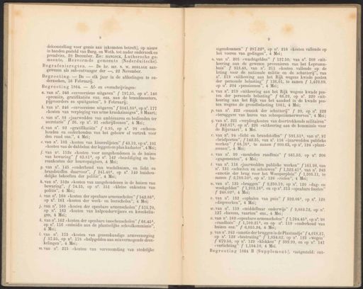 ETEN 8 deloosstelling voor gemis aan inkomsten betreft), op nieuw in handen gesteld van Burg. en Weth. tot nader onderzoek en preadvies, 20 December. Zie: mancock, Luthersche ge- meente, Hervormde gemeente (Nederduitsche). Begrafenisregten. — De hr. mr. N. W. BERLAGE aan- gewezen als sub-ontvanger der —, 22 November. Begrooting. — De — elk jaar in de afdeelingen te on- derzoeken, 16 Februarij. Begrooting 1864. — Af- en overschrijvingen: c‚ van n°. 88 „jaarwedden van ambtenaren en bedienden ter secretarie” f 26, op n°. 91 zsschrijfloonen”, 4 Mei; „van n°. 92 ogratifikatiën” f 0.95, op n°. 98 >schoon- houden en onderhouden van het gebouw of vertrek voor den raad enz.”, 4 Mei; ‚van n°. 103 „kosten van kiezerslijsten” f 483.19, op n°. 101 "kosten van de dubbelen der leggers en plan kadaster”, 4 Mei; - van m9. 152a «kosten voor aangehoudenen in de huizen van bewaring” f 68.815, op n°. 149 “bezoldiging en bu- reaukosten der bouwopzigters, 4 Mei; . van n°. 145 „onderhoud van wachthuizen, en licht en brandstoffen daarvoor”, f 241.405, op n°. 149 huishou- delijke behoeften der politie”, 4 Mei; .van n°. 1524 „kosten van aangehoudenen in de huizen van bewaring”, f 74.15, op n°. 151 »Kkleine onkosten van politie”, 4 Mei; j. van n°. 160 „kosten der openbare armenscholen” { 575.70, op n°. 163 „kosten van hulponderwijzers en kweekelin: gen, 4 Mei; m.van n°. 215 kosten van vervreemding van stedelijke 9 eigendommen” f 287.225, op n°. 216 zkosten vallende op het voeren van gedingen”, 4 Mei; ‚van n°. 205 swachtgelden” f 187.50, van n°. 208 vuit- keering aan de gewezen provenieren van het Leprozen- huis” f 918.48, van n°. 211 »kosten vallende op de loting voor de nationale militie en de schutterij’, van n°. 219 suitkeering aan het Rijk wegens kwade posten der personele belasting” f 136,01, te zamen f 1,429.89, op n°. 204 pensioenen”, 4 Mei; van n°. 219 zuitkeering aan het Rijk wegens kwade pos- ten der personele belasting” { 66.39, op n°. 220 zuit- keering aan het Rijk van het aandeel in de kwade pos- ten wegens de grondbelasting 1861, 4 Mei; p. van n°, 2922 „muziek der schutterij” f 20, op n°. 293 “teruggave van huren van scheepstimmerwerven”, 4 Mei; van n°. 221 „verpleegkosten van doortrekkende militairen” Í 242.875, op n°. 226 suitkeering aan de kommissie voor de Rijnvaart”, 4 Mei. van n°. 94 zslicht en brandstoffen” f 591.515, van n°. 97 ”briefporten”, f 149.35, van n°. 116 sjaarwedden publieke werken”’ f 66.765, te zamen f 800.63, op n°, 124 >plant- soenen”, 4 Mei; s. van n’. 99 „meubelen raadhuis” f 561.53, op n°. 206 „gagementen”, 4 Mei; - van n°. 116 sjaarwedden publieke werken” f 161.98, van n°. 181 zschuiten en schouwen” f 1,822.415, van n°. 243 vamotie der brug voor het Weesperplein” f 1,305.11, te zamen f 2,789.505, op n°. 126 sriolen”, 4 Mei; . van mn’. 125 „bruggen” f 2,230.19, op n°. 120 “dag- en weekgelden” {1,982.165, en op n°. 213 „openbare feesten” f 248.025, 4 Mei; .van n°. 1382 ophalen van puin” f 392.065, op n°. 128 „diepwerken”, 4 Mei; ‚van n°. 159 „middelbaar onderwijs” f 9,889.72, op n°. 127 havens, vaarten” enz., 4 Mei; . van n°. 160 „openbare armenscholen” f 7,764.455, op n°. 98 “raadhuis” f 1,709.215, en op n°. 119 zonderhoud van huizen enz.” f 6,055.24, 4 Mei; y. van n’. 242 „amotie der bruggen in de Plantaadje” f 4,018.27, op n°. 122 bestrating” f 1,834.62, op n°. 193 wegen” f 679.56, op n°. 129 »klokken” f 399.99, en op n°. 147 “verlichting” f 1,104.10, 4 Mei. Begrooting 1864 B (Supplemen t-), vastgesteld: ont- a. van n°, 246 zonvoorziene uitgaven” f 797,55, op n°. 140 “premiën, gratifikatiën enz. enz. aan de brandmeesters, pijpvoerders en spuitgasten”, 9 Februarij; t. van n°, 160 „kosten der openbare armenscholen” { 542.865, op n°. 161 „kosten der werk- en leerscholen”, 4 Mei; kf. van n°. 169 „kosten der openbare tusschenscholen”’ f 66.455, op n°. 116 „subsidie aan de plaatselijke schoolkommissie” 4 Mei; . van n°. 246 „onvoorziene uitgaven” f 041.805, op n°. 177 kosten van verpleging van arme krankzinnigen”, 8 Maart; - van n°. 173 „kosten van geneeskundige armverzorging { 37.55, op n°. 178 „hulpgelden aan minvermogende dren- kelingen”, 4 Mei;