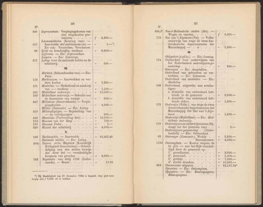eN Mg EE 26 Leprozenhuis. Verplegingskosten van niet uitgekochte TE) venieren . 4 Levensmiddelen (Keuring van): _ Jaarwedde der ambtenaren enz. — Zie ook: Vacatieloon, Verschotten. Licht en brandstoffen, stadhuis Lijfrente. — Zie: Leprozenhuis. Loopers. — Zie: Concierge. Loting voor de nationale militie en de schutterij . M. Markten (Schoonhouden van). — Zie: Puin. Muntsluis (Verbreeding der) . Museum van der Hoop . Museum Fodor. N. Nachtwachts. — Jaarwedde Nationale militie. — Zie: Loting. Natura Artis Magistra (Koninklijk Zoölogisch Genootschap). —Schuld- delging met den zesden termijn der door het — verschuldigde koopsom van gronden . Negotiatie van Julij 1795 (Gelor- ceerde). — Rente . í 7,230. 1,500. — 12,500.— 300. 4,000. 200. 12,000.— 100. 4,000.— 62,461.45 Ns 224,2° 178 27 Noord-Hollandsche steden ee - Wegen en vaarten. Obligatiën (4 püts.). — Zie: Leening. Oefenschool voor onderwijzers van het Nederlandsch onderwijzers-ge- nootschap . 5 2,800. 5,400. 7,000. — 10,900.— 58,187.135 *) Bij Raadsbesluit van 21 December 1864 is bepaald, deze post voor- | Bouwopzigters. loopig met f 6,235 uit te trekken. Marktwezen. — Jaarwedden en ver- dere kosten . Muziek der schutterij Nut van ’t Algemeen (Tot). — Volks- onderwijs van wege de twee Am- sterdamsche departementen der Maatschappij — . 3 Omroepen. — Zie: Aanplakken. Meubelen. — Onderhoud en ‚ aankoop van —; stadhuis . {ueg5l, Onderhoud van gebouwen en ver- trekken. — Zie: Gebouwen. Middelbaar onderwijs. í Onderhoud van meubelen. — Zie: Meubelen. Middelbaar onderwijs. — Subsidie aan de kommissie van toezigt . Onderstand, uitgereikt aan armlas- tigen: Militairen (Doortrekkende). — Verple- gingskosten . . a. domieilie van onderstand heb- bende in de gemeente ‘ Militie (Nationale). — Zie: ‘ Loting. b. domicilie van onderstand heb: bende elders. Militiepligtigen. — Begeleiding van — en verlofgangers” ; … Onderwijs (Volks-), van wege de twee Amsterdamsche departementen der Maatschappij Tot Nut van ee meen … Onderwijs (Middelbaar). — Zie: Mid: delbaar onderwijs. Onderwijzers en onderwijzeressen (Bij- drage tot het pensioen van) . Onderwijzers-genootschap (Neder- landsch). — Zie: Oefenschool. Ontvanger (Gemeente-). Wedde Bureaukosten. ee — Kosten wegens de 4 pCt. — aan het Rijk verschul: digd door de gemeente op: 1. grondlasten . 5 2°. personeel. 3°. geslagt í 4°. sterke dranken. Onvoorziene uitgaven. Opcenten. — Zie: Ontvangloon. Opzigters. — Zie: Beursopzigters,