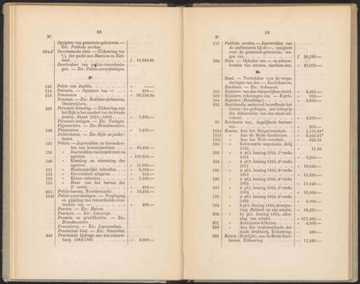 Ee EA 28 Opzigters van gemeente-gebouwen. — Zie: Publieke werken. Pp. Paleis van Justitie. ' Patenten. — Opnemen van — Pensioenen . 10,366.66 250. — 30,124 24 28,400.— 108,350.— 15,000.— 8,000. — 150.— 1,000.— 450.— 19,200.— 200. 29 Publieke werken. — Jaarwedden van de ambtenaren bij de —, opzigters over de gemeente- ‚wdn we- gen enz. Raad. — Vertrekken voor de verga- deringen van den —. Zie: Gebouwen. Raadhuis. — Zie: Gebouwen. Registers van den burgerlijken stand. Registers, rekeningen enz. — Zegels. Registers (Bevolking- ass Regtskundig onderzoek betreffende het voeren van gedingen, met inbegrip der deklaratiën van den stads-ad- vokaal. 7 0 ES ee Reiskosten enz., dagelijksch bestuur enz. Renten, Aan het Burgerweeshuis. Aan de Beide Gasthuizen Aan het Wale-weeshuis . Geforceerde negotiatie, Julij 1795554. 4 pCt. leening 1855, 1e reeks 15568 +. 4 pCt. lening 1855, ge reeks Ei 4 pCt. leening 1855, 3e reeks 1853 som 4 pCt. lening 1855, 4° reeks 1863 4 pCt. leening 1855, 5e reeks 1864 . 4 pCt. leening 1855, 6e reeks 1865: 2. 3 pCt. lening 1860, doorgra: ving Holland op zijn smalst. £ pCt. leening 1861, aflos- sing van schuld , Anticipatie-billetten Aan het weduwenfonds der stads drukkerij. Uitkeering. Renten (Erfelijke), aan de Beide Gast- huizen, Uitkeering. ! ! 2,500. — 200.— 1,155.625 2,442.975 238.10 17.50 8,900.— 10,040.— 15,920.— 15,840.— 16,000.— 6,000.— 86,950.— 617,435.— 4,000.— 480.— 17,220.— Overtoomsche sluis. — Uitkeering van 2/3 der paas aan Haarlem en Rijn- land. Pensioen. — Zie: Bedelaarskolonisten, Onderwijzers. Puin. — Ophalen’ van —, en schoon- houden van straten, markten enz. Overtreders van pditie- verordenin: gen. — Zie: Politie-verordeningen. Personele belasting. — Uitkeering aan het Rijk in het aandeel van de kwade posten, dienst 1861—1862. Personele toelagen. — Zie: Toelagen. Pijpvoerders. — Zie: Brandmeesters. Plantsoenen . Polderlasten. — Zie: Dijk en polder: tasten. Politie. — Jaarwedden en bureaukos- ten van kommissarissen Jaarwedden vaninspekteurs en agenten. Kleeding en ‘uitrusting der agenten . : ' Huishoudelijke behoeften Onvoorziene uitgaven . Kleine onkosten . Huur van het bureau der 3° sectie Politie-bureau, Noor dermarkt . Politie-verordeningen. — Verpleging en gijzeling van veroordeelde over- treders van —. Poorten. — Zie: Huizen. Poortiers. — Zie: Concierge. Premiën en gratifikatiën. — Zie: Brandmeesters. Provenieren. — Zie: Leprozenhuis, Provinciaal blad. — Zie: Staatsblad. Provinciale bijdrage aan den schouw- burg, 1864/1865