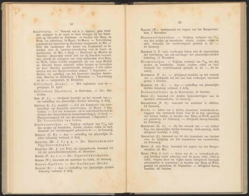 A EN 36 Beurtveren. — Verzoek van R. G. EISINGA, geen twee- den schipper in de vaart te doen brengen bij het beurt- veer op Gorredijk en Oldeboom; in handen van Burg. en Weth. tot afdoening, 16 Maart, 30 Maart. — Verordening regelende het beurtveer op Zwartsluis vastgesteld, 25 Mei. — Over het raadplegen der kamer van koophandel en fa- brieken over de ontwerp-verordening voor de beurt- en marktveren, 25 Mei, 1 Junij. — Beurtveer op Muiden en Naarden: Amsterdam treedt’ niet toe bij Naardens voorstel, dat, terwijl de schippers van wege Amsterdam door Burg. en Weth. ‘zullen worden aangesteld, die van wege Muiden en Naarden hunne admissie zullen koopen en bovendien de door Naarden geadmitteerde schippers f 200 zullen betalen aan het Burgerweeshuis aldaar, 7 September. — Besluit tot opheffing van het beurtveer tusschen Amster- dam, Haarlem en Middelburg, 7 December. — Verordening op de — vastgesteld, 21 December. BLaauw (E.). — Aan — ontheffing van plaatselijke direkte belasting verleend, 6 Julij. 37 Braauw (W.). herbenoemd tot regent van het Burgerwees- huis, 7 December. Blaauwsel-fabrieken. — Vrijdom verleend van 19/4, van den accijns op steenkolen, sintels, cinders, cokes en turf, dienende tot voortbrengend gebruik in de —, 29 Januarij. BLARKOM (J. P. vn), voorloopig belast met de waarneming der betrekking van sub-ontvanger der plaatselijke direkte belasting, 17 November. Bloemisterijen. — Vrijdom verleend van 19/9 van den accijns op steenkolen, sintels, cinders, cokes en turf, dienende tot voortbrengend gebruik in de —, 29 Ja- nuarij. BLokgums Wz. (G.). — Aan — ontheffing van plaatselijke direkte belasting verleend, 6 Julij. Boekenstalletjes op de Botermarkt, 28 October. BoELE (J.), benoemd tot derden hulponderwijzer aan de openbare armenscholen, 14 Januarij. BoELaouwER (F. O.), benoemd tot makelaar in effekten, 14 Januarij. Boete. — Adres van G. DUYNS, aannemer, verzoekende te- ruggave van verbeurde boete voor de te late oplevering van houten wallen, in handen van Burg. en Weth. gesteld tot preadvies, 10 Februarij. — Afwijzend hierop beschikt, 24 Februarij. Bont (J. DEN Tex), benoemd tot regent van het Burger- weeshuis, 25 Mei. Boxca (Wed. J. van). — Adres van de —, verzoekende als- nog betaling eener rekening over de jaren 1861, 1862 en 1863, wegens door nu wijlen haren echtgenoot bezorgde advertentiën in couranten; in handen van Burg. en Weth. gesteld tot preadvies, 21 September. — Afwijzend hierop beschikt, 26 October. Bibliotheek (Stads-). — Het reglement voor de — gewijzigd, 27 April. BLOEMKOLK (P. A.). — Afwijzend beschikt op het verzoek van —, strekkende tot het aan hem verkoopen van stads grond, 5 October. Bossen (G. J.). — Op het verzoek van — om onthef- fing van plaatselijke direkte belasting, deels gunstig, deels afwijzend beschikt, 6 Juli. Bibliotheek (Openbare), te Rotterdam. — Zie: Rot- terdam. BoissEvAIN (J.), benoemd tot lid der kommissie van bestuur over de inrigting tot het examineren van varenslieden, 24 Februarij. Brek (F. A.). — Afwijzend beschikt op het verzoek van —, om ontheffing van plaatselijke direkte belasting, 6 Juli. BiesrarT (L. A.), raadslid. — Lid der kommissie van voor- bereiding van financiële onderwerpen, 16 Maart, 7 Sep- tember. — Lid der kommissie om te onderhandelen met de direktie der Amsterdamsche kanaalmaatschappij, 23 Junij. — Plaatsvervangend lid van den brandraad, 7 September. — Zie: Voorstellen van leden. Bierbrouwerijen. — Vrijdom verleend van 19/99 van den accijns op steenkolen, sintels, cinders, cokes en turf, dienende tot voortbrengend gebruik in de —, 29 Januarij, Bierman (G. H). — Aan — ontheffing van plaatselijke di- rekte belasting verleend, 6 Julij. Butevenn (Mr. J. C.), q. q. — Zie: Amsterdamsche Piijjp-Gascompagnie. BijLEvELD (Mr, A. VAN Eyk), als regtsgeleerde, benoemd tot lid der gezondheidskommissie, 21 December. BinGer (F. A), c.s. — Zie: Sigarenfabriekanten. Biner (W.), benoemd tot makelaar in tabak, 14 Januari. Binnen-Gasthuis. — Zie: Gasthuizen (Beide).