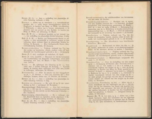 38 BosGer (H. C.). — Aan — ontheffing van plaatselijke di- rekte belasting verleend, 6 Julij. 8 p ijke di Boomen. — Adres van W. FERNHOUT Cc. s., verzoekende het snoeijen der — nabij hunne houtzaagmolens buiten de Zaagpoort; in handen van Burg. en Weth. tot afdoening, 10 Februarij. — Adres van A. SWART, verzoekende — te plaatsen voor een perceel op den Kadijk; in handen van Burg. en Weth. tot afdoening, 16 Maart. Boon (H. W. J.). — Afwijzend beschikt op het verzoek van —, om ontheffing van plaatselijke direkte belasting, 6 Julij. Bodr (J. G. H.). — Besluit aan Gedeputeerde Staten te ad- viseren, — niet ontvankelijk te verklaren, wegens te late indiening zijner reclame tegen de plaatselijke direkte be- lasting, 14 Januarij. — Door Gedeputeerde Staten dien- overeenkomstig beschikt, 29 Januari]. Borax-stokeriijen. — Vrijdom verleend van 19/94 van den accijns op steenkolen, sintels, cinders, cokes en turf, dienende tot voortbrengend gebruik in de —, 29 Januari. Bosca (N. J. TEN), ontslagen als makelaar, 27 April. Bosse (A. VAN), raadslid. — Benoemd tot lid der kommissie van voorbereiding van financiële onderwerpen, neemt deze benoeming niet aan, 16 Maart. — Zie: Voorstellen van leden. Boter. — De opbrengst der belasting op de —, voor 1863 met f 12,000 verhoogd, 29 Januarij. — Voorstel BROMS, de raming dezer opbrengst voor 1865 met f 2,000 te verhoogen, verworpen, 28 October. Botermarkt. — Over de amotie van het waaggebouw op de —, 37 October. — Over het ontsieren der — door stalletjes, kramen, kisten enz., 27 October, 28 October. Bouman (A. C.). — Aan — ontheffing van plaatselijke di- rekte belasting verleend, 6 Juli. Bouwen en sloopen. — De artt. 68 en 78 der veror- dening op het — gewijzigd, 28 November. Brak JR. (A. H.). — Aan — ontheffing van plaatselijke direkte belasting verleend, 6 Julij. 39 Brand-assurantie der schilderstukken van het museum VAN DER HOOP, 28 October. Brandbluschmiddelen. — Brochure van W. HOVEN, over den slechten toestand der — in Nederland, den Raad aangeboden, voor kennisgeving aangenomen, 30 Maart. — Over de — hier ter stede, 30 Maart. — Deelneming door Amsterdam aan de te Middelburg te houden internationale tentoonstelling van —, 30 Maart. — Over de verbetering der bestaande en de invoering van nieuwe —, 27 October. Branderiijjen. — Vrijdom verleend van 1/9 van den accijns op steenkolen, sintels, cinders, cokes en turf, die- nende tot voortbrengend gebruik in de —, 29 Januari. Brandgevaar. — Zie: Akademie van beeldende kunsten, Museum. Brandraad. — Herbenoemd tot leden van den —: de hh. MoMMA, HESHUYSEN en LUDEN, en tot plaatsvervangende leden: de hh. BIENFAIT, MENDES en BEELOO, 7 September. Brandspuitmakeriijjen. — Vrijdom verleend van 1°/% van den accijns op steenkolen, sintels, einders, cokes en turf, dienende tót voortbrengend gebruik in de —, 29 Januarij. Brandspuitwinkel. — Mededeelingen aangaande den stads —, 27 October. Bouwmaatschappij (Nederlandsche). — Over het overdragen aan üe — der aan dr. s. SARPHATI verleende koncessie tot bebouwing van den omtrek van het Paleis voor Volksvlijt. — Zie: SARPHATI. Brandstoffen. — Over de afschaffing van den accijns opde —, 29 Januarij, 27 October. (Zie: Steenkolen). — Adressen van P. VAN KLEEF C.S. en J. D. ALTINK C. $, verzoekende vrijdom van accijns op de — voor de brood- bakkerijen, in handen van Burg. en Weth. gesteld tot af- doening, 18 April. — Adressen van M. BADE €. S., schippers te Hoogeveen en van C. W. E. KYMMEL C. S., verveeners te Smilde, verzoekende behoud van den accijns op de —, ter zijde gelegd, ten gevolge van het den 27 October ge- nomen besluit tot behoud van den accijns op de steen- kolen, 17 November. Bouwvereeniging (Amsterdamsche). — De — verlangt, dat het Amstelveld haar in eigendom worde afgestaan, 7 De- cember. — Afwijzend hierop beschikt, 21 December. Brandwezen (Verordening op het). — Adres van H. J. zoLFF, betreffende een der bepalingen van de —; (hij ver- langt, dat bij het blusschen van brand ook kaartjes wor- den uitgereikt aan personen, die niet tot het personeel der spuiten behooren); in handen van den brandraad ge- steld tot preadvies, 4 October. — Afwijzend hierop be- schikt, 17 November. BREGGEN (Mr. W. K. VAN DER), q. q- — Adres van — hou- dende bezwaren tegen het voornemen om van Ei een centraal-spoorwegstation te plaatsen aan de Nieuwe- brug bij het open havenfront, en beschouwingen over een