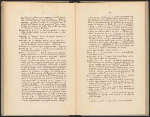 ie IAA Ae ZN 40 gordelbaan en andere spoorwegplannen, waarbij Amster- dam belang heeft; ter visie, 17 November. — Aangeno- men voor kennisgeving. Mogt de adressant het noodig oordeelen, wijziging te brengen in zijn ten jare 1862 in- gediend plan (namens den hr. PORTMAN te Parijs) tot uit- breiding der stad aan de Y-zijde, dan kan hij zich nader tot den Raad wenden, 7 December. BrEUGEL (A. C. K. VAN). — Aan — ontheffing van plaat- selijke direkte belasting verleend, 17 November. — Zie: Officieren. Breukelen en Ouderkerk (Zand- en jaagpad tusschen). — Zie: Zand- en jaagpad. BROEK (A. TEN), dienaar van politie, gepensioneerd, 24 Augustus. Broer (N. P.). — Aan — ontheffing van plaatselijke di- rekte belasting verleend, 6 Julij. Bros (J. F.), raadslid. — Lid der kommissie voor het bur- gerlijk armbestuur, en lid en voorzitter der kommissie voor de aanvragen om pensioen of wachtgeld, 7 Septem- ber, — Zie: Voorstellen van leden. Bruggen. — Over het dempen van een deel der Linden- gracht, bij het eventueel wegnemen der brug over deze gracht bij de Noorder-Kerkstraat, 24 Februarij. — Besluit tot het maken van aarden dammen, in plaats van de weg te nemen bruggen over de Prinsengracht voor de Plan- taadje Middellaan en Plantaadje Rapenburgergracht of Doklaan, 24 Februarij. — Besluit tot vernieuwing der brug over de Keizersgracht bij de Leliegracht, 16 Maart. — Handhaving van het besluit van 17 Augustus 1859, tot wegneming der brug N°. 135 over de Lindengracht, 380 Maart (na verwerping van het voorstel tot het maken van twee loopbruggen). — Adressen van H. J. BAGGELAAR, H. SIEMONS en J. DE WOLFF. tegen deze brug-amotie; ter visie, 13 April, 27 April. — Op voorstel van den hr. BROMS, ingetrokken het besluit tot wegneming van de brug N°. 135, 27 April. — Adres van H.J. BAGGELAAR €. s., verzoekende behoud der brug N°. 137 over de Lindengracht tusschen de Derde Goudsbloemdwarsstraat en de Tweede Linden- dwarsstraat, met aanbod tevens, f 500 bij te dragen tot de kosten van het maken eener nieuwe loopbrug aldaar; ter visie, 4 Mei. — Voorstel COOL, tot het terugkomen van het besluit tot amotie der brug N°. 187, verworpen en op het adres van BAGGELAAR afwijzend beschikt, 1 Junij. — 4] Adres van wW. WINKEL €.s., andermaal aandringende op het leggen van eene loopbrug over de Lindengracht, ed plaatse waar de onlangs afgebroken brug N°, 137 lag. Over het voorstel BROMS, tot het inwilligen van dit verzoek, staken de stemmen, 23 Junij; dit voorstel aangenomen, 6 Julij. — Adres van V. J, VORSTELMAN c. , houdende verzoek, om aan de te bouwen bruggen over de Linden- gracht de hoogte te geven welke de vorigen hadden; hieraan zal worden voldaan, 27 Julij. — Afwijzend be- schikt op het adres van 0. M. VISSER C. s., tot het leggen van eene brug over de Lijnbaansgracht vóór de Gieter- straat, 27 April. — Besluit tot het wegnemen der brug N°. 174 over de vest bij de Leidschepoort en ze te ver- vangen door ijzeren leggers met verwaulven; het plan aan den Raad te Onderwerpen, 27 October. — Besluit tot het veranderen der ophaalbrug N°. 297 over Regtboomsloot in een ijzeren draaibrug met steenen landhoofden; het plan aan den Raad te onderwerpen, 27 October. Brums Lica (Dr. H.). — Zie: Grachten. Bruyn (P. A. VAN OOSTERWIJK). — Zie: Amstelveld, Bouwvereeniging. *) Op blz. 3, regel 10 van onderen, bij te voegen: 7 September. BRrINKBOER (M.). — Afwijzend beschikt op het adres van —, doodgraver van het St.-Pieters-kerkhof, verzoekende wacht- geld bij de sluiting van dit kerkhof, 10 Februarij. BeuvsestEmn (W. H. J.), kassier bij de stads bank van lee- ning, gepensioneerd, 21 September. pa BücuNer (Dr. E. C.), raadslid. — Lid der kommissie om den kontrôleurs der personele belasting behulpzaam te zijn bij het opmaken der beschrijvingsbilletten, 27 April. — Wenscht ontslag als lid der kommissie betreffende de re- organisatie van het geneeskundig onderwijs alhier, doch trekt zijn daartoe strekkend verzoek in, 23 Junij. — Als raadslid, benoemd tot lid der gezondheidskommissie, 21 December. — Zie: Voorstellen van leden. Buitensingel. — Slechte toestand van den — tusschen de Utrechtsche en Weteringpoorten, 27 October. Burgemeester. — Tot — herbenoemd de hr. mr. J. MES- SCHERT VAN VOLLENHOVEN, 27 April. — Aan den — eene maand verlof verleend wegens ongesteldheid, 27 Julij; nog eene maand, 24 Augustus. ie vemeester (Waarnemend), de hr. J. BROUWER AN- ie peen 4 rn 6 Julij, 27 Julij, 24 Augustus, 7 September *). Burgerlijken stand. — Over de kosten van het ver- vaardigen der tienjarige tafels van den —, als rijks uit- gave, 13 April.
