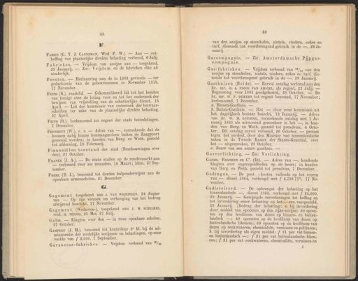 48 F. eel nt. Fagus (G. T. J. Canneman, Wed. F. W.). Aan ont Ee van plaatselijke direkte belasting verleend, 6 Julij. rieken. — Vrijdom van accijns aan — toegekend, en _ Zie. Vrijdom en de fabrieken elke af- zonderlijk. el sten. — Herinnering aan de in 1863 gevierde — ter ee van de gebeurtenissen in November 1813, 17 November. | ik p (R.), raadslid. — Gekommitteerd lid tot het houden ge wo over de loting voor en tot het onderzoek der bewijzen van vrijstelling van de schutterlijke dienst, 13 April. — Lid der kommissie van onderzoek der bezwaar- schriften ter zake van de plaatselijke direkte belasting, 27 April. Feira (R.), herbenoemd tot regent der stads bestedelingen. 7 December. WE FrrNHour (W.), c. s. — Adres van —, verzoekende dat de boomen (NE hunne houtzaagmolens buiten de Zaagpoort gesnoeid worden; in handen van Burg. en Weth. gesteld tot afdoening, 10 Februarij. | Financiëlen toestand der stad (Beschouwingen over den), 27 October. e ANKE (J. A). — De stads stallen op de rundermarkt aan Bin ee voor zes maanden, 16 Maart; idem, 21 Sep- tember. jl Freek (B. J.), benoemd tot derden hulponderwijzer aan de openbare armenscholen, 21 December. G. g aan J. VAN WIERINGEN, 24 Augus- 49 van den accijns op steenkolen, sintels, cinders, cokes en turf, dienende tot voortbrengend gebruik in de —, 29 Ja- nuarij. Gascompagnie. — Zie: Amsterdamsche Pijpgas- compagnie. Gas-fabrieken. — Vrijdom verleend van 19/,, van den accijns op steenkolen, sintels, cinders, cokes en turf, die- nende tot voortbrengend gebruik in de —, 29 Januarij. Gasthuizen (Beide). — Eervol ontslag verleend aan den hr. mr. B. J. PLOOS VAN AMSTEL, als regent, 27 Julij. — Begrooting voor 1865 goedgekeurd, 28 October. — De hr. mr. W. F. DIJKERS tot regent benoemd, 17 November; herbenoemd, 7 December. Gasverlichting. — Zie: Verlichting. GAZAR, FRANKEN en C°. (Dr). — Adres van —, houdende klagten over ongeregeldheden op de beurs; in handen van Burg. en Weth. gesteld tot preadvies, 7 December. Gedingen. — De post :kosten vallende op het voeren van — dienst 1864, verhoogd met f 2,708.775, 17 No- vember. Gedisteleerd. — De opbrengst der belasting op het binnenlandsch —, dienst 1863, verhoogd met { 35,000, 29 Januarij. — Gewijzigde verordeningen tot heffing en tot invordering eener belasting op het — enz. vastgesteld, 29 Januarij. (Bedrag der belasting: a. bij invordering door middel van opcenten op den rijks-accijns: 60 opcen- ten op den hoofdsom van dezen op binnen- en buiten- landsch —; 40 opcenten op de hoofdsom van dezen op buitenlandsche likeuren; 60 opcenten op de hoofdsom van dezen op reukwateren, chemicaliën, vernissen en polituren; b. bij invordering als eigen middel: f 21 per vat binnen- en buitenlandsch —; f 21 per vat buitenlandsche likeu- ren; f 21 per vat reukwateren, chemicaliën, vernissen en 4 ii pT. om verhooging van het bedrag afwijzend beschikt, 17 November. a. Binnen-Gasthuis. — Gagement, (Weduwen-), toegekend aan J. M. SCHELKES, wed. H. VERNIJ, 25 Mei, 27 Julij. b. Buiten-Gasthuis. — Het — door eene kommissie uit het dagelijksch bestuur bezocht, 13 Januarij. — Adres van dr. W. M. GUNNING, verzoekende ontslag met 1 Ja- nuarij 1865 als uitwonend geneesheer in het —, in han- den van Burg. en Weth. gesteld tot preadvies, 4 Octo ber. Dit ontslag eervol verleend, 26 Ôctober. — protest tegen het oordeel, door den Minister van binnenlandsche zaken in de Tweede Kamer der Staten-Generaal, over het — uitgesproken, 28 October. Galm. — Klagten over den — in twee openbare scholen, 21 October. el teen ), benoemd tot kontrôleur 2° KL. - c. Bouw van een nieuw gasthuis. — ee 0 stedelijke accijnsen en belastingen, op eene wedde van f 2,500, 7 September. Garancine-fabrieken. — Vrijdom verleend van 19/%