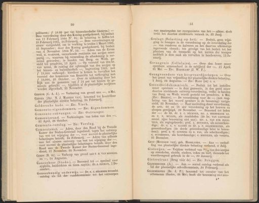 50 51 f likeuren: — van maatregelen ter reorganisatie van het — alhier, doch olituren ; l ee ee] bij DE trekt het daartoe strekkende verzoek in, 23 Junij. : Di nuarij. partij —, waarvan | ì Bure. en Weth. ge- h ars anden van £ , ; : at, WOR TT iN April. — Op voorstel van den br. Gevangenis (Cellulaire). — Over den bouw eener steld to Pe de Ting der opbrengst van den accijns op openbare armenschool in de nabijheid der —, 27 April, VAN TOS, ee begrooting 1865, me 25 Mei. — Zie: Hantkame (J. W. F.). het binnen- en buitenlandsch —, 8 8 rellen’ het | : ve- 1 Junij, 24 Augustus. — Zie: HAAS (DE) €. s. voor zooveel de plaatselijke der Staten-Generaal inge- fing van plaatselijke direkte belasting verleend, 6 Julij. Raad aan de Tweede Kamer N ber Gieterijen. — Vrijdom verleend van 1/54 van den accijns de (Te 2 Verkoop Van gron AN MOORSEL op steenkolen, sintels, cinders, cokes en turf, dienende tot Geuer (B. TE). — Verkoop van grond aan F. H. V: op wenken, it cnders kes en Gr en —, 24 Augustus. aal voor Gieterstraat (Brug vóór de) ie Degen ), — Benoemd tot — speciaa Geneesheer (Stads), Ns : tis: dr.J. ZEEMAN, 7 De- GILDEMEESTER (A). — Aan — eervol ontslag verleend als syphilis, huidziekten en tinea capitis: id lid der plaatselijke schoolkommissie, 24 Februarij. TA AEN EN AE A SAN Re cember. Geneeskundig onderw tele als lid der raad s Dr. E. C. BÜCHNER wenscht GILDEMEESTER Je J. P.), benoemd tot curator van het skommissie tot het ontwerpen athenaeum illustre, 25 Mei; heeft die benoeming niet aan- 4* 5 dening door D : ; : Ee deg 1864 N°. 85; de belasting ie Vo Geslagt (Belasting op het). — Besluit, geen wijzi 28 Februarij 1865, 24 Februarij. — Deze ge ging te brengen in de verordening op de invordering der ieuw vastgesteld, om in werking ee bij beslait et NBI, en en het daarvan afkomstige 21 September; door den Koning goedg Ien ingevoerde vleesch; ten gevolge van het besluit tot het van 4 November 1864 N°. 52. Ee Pe eener ee ‚van de veemarkt op het terrein der weesper wed. H. WARNINK, verzoekende ns 1 de afteekening is ver- aschbelt is deze zaak als vervallen te beschouwen, 18 Ja- ï verzending 18,000 verhoogd; Nieren PAN met Gezagvoerders ‚van koopvaardijschepen. — Over BE Over de uitkeering door het het genot van vrijstelling der plaatselijke direkte belasting, Rijk aan de gemeente van f 14 per vat ER G a kl “> : Besl 4 & het ‘instell sruikt —, bijaldien al de plaatselijke acc1 ezondneidskommissie. — Besluit tot het instellen meente gebrui ft 28 November. eener openbare — in deze gemeente, in den geest eener worden afgeschaft, 4 Mei daartoe strekkende ontwerp-verordening, welke in handen Geesink (C. A. JJ). — Verhuring van grond aan berrtttlkur van Burg. en Weth. wordt gesteld tot preadvies, 4 Mei. T]hr. N. J. Mart VAN), benoemd tot, kon (Zie: DEGENS). — De verordening voor de — (met weg- GEFFEN (Jhr. 2 direkte belasting, 24 Februari. lating van het woord openbare in de benaming) vastge- der plaatselijke dire a \ steld, 23 November, — Naar aanleiding dezer verordening, Geldersche kade. — Zie: Visch. A oant en de artt. 68 en 78 der verordening op het bouwen en Gemeente-eigendommen. — Ds Eigendom : CN gewijzigd, 23 November. — Benoemd tot leden — Zie: Ontvanger. er —: de hh. dr. E. C. BÜCHNER, Mr. J. HEEMSKERK AZ. Gemeente-ontvanger. : Ei van leden van den —, en P, N. MULLER, als raadsleden (de hr. VAN CAPPELLE Gemeenteraad. — Verkiezmgen neemt zijne benoeming niet aan); mr. A. VAN EYK BIJLE- 27 April, 26 October. VELD, als regtsgeleerde; prof, A. HEYNsIUs, als natuorkun- te-verslag. — Zie: Verslag. j dige; dr. G. A. N. ALLEBÉ en dr. J. P. GILDEMEESTER, als Uem door den Raad bij de Tweede geneeskundigen (de derde geneeskundige later te benoe- Gemeentewet. — Adres, 609: diend, tegen het ontwerp men); prof. 3. W. GUNNING en D. PAS, als scheikundigen ; Kamer der Staten-Generaal ingecier zooveel de plaatselijke C. OUTSHOORN, als bouwkundige: C. KRITZLER, als veearts, an De Re ij Di Adres van adhesie 21 December. in | elastingen betreft, ss ijziging der —. ve het nieuwe ontwerp Rt 1 Gen Geyr (Mevrouw VAN), geb. HooGLAnDT. — Aan — onthef: