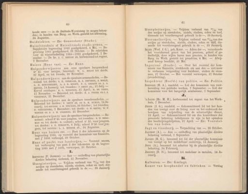OSE) 3 | 4 60 kende eene — in de Dubbele-Worststeeg te mogen behou- in handen van Burg. en Weth. gesteld tot afdoening, 24 Augustus. Huidziekten. — Zie: Geneesheer (Stads). Huiszittenhuis of Huiszittende stads-armen. — Suppletoire begrooting 1868 goedgekeurd, 4 Mei. — Be- grooting 1865 goedgekeurd, 28 October. — De rubrieken voor de winterbedeeling 18641865 goedgekeurd, 7 De- cember. — De hr. J. C. REESSE JR. herbenoemd tot regent, 1 December. Hulponderwijzeres aan eene openbare burgerschool 4e kl. voor meisjes, benoemd: W. C. HOLST tot derde, 27 April, en tot tweede, 23 November. Hulponderwijzers aan de openbare armenscholen. — Be- noemd tot derde: s. E. VERHAAR, H. J. DEFEREE, J. BOELE, C. H. HORSTMEIJER, A. J. E. KRAFT, F. C. GROOTE en J. A. HIJNER, 14 Januarij; tot tweeden: P. SMITT JR., 21 Juli — Eervol ontslagen: H. C. WISSINGH, 27 April; M. DE VRIES, 17 November. — Benoemd tot derde: B. J. FREEK en C.J. VOORTMAN, 21 December. Hulponderwiijjzers aan de openbare tusschenscholen. — Benoemd tot derden: P. SMITT JR. en D. M. NUMAN, 14 Ja- nuarij; tot eersten: J. H. sTRÖKER, 26 October; tot tweeden: F. VREUGENHIL, 7 December; tot derde: G.W. SKENE, W.F. WINTER en D. J. H. SNIJDERS, 21 December. Hulponderwijzers aan de openbare burgerscholen. — Be- noemd: school 8° kl. voor jongens, tot tweeden: N. W. BERG- MAN en tot derde: D. LANGEN; school 4° kl. voor Jongens, tot derden: J. E. TERGOUW, 6 Julij; school 8: kl. voor Jon- gens, tot eersten: L. A. HISSINK JR, 24 Augustus. u. InengurG (F. Jonker). — Aan — ontheffing van plaatselijke direkte JD verleend, 17 November. i Ïïij rij f 19/,9 van den Uzergieteriijen. — Vrijdom verleend van 19/% 6 61 Izerpletteriijjen. — Vriijdom verleend van 19/4 van den accijns op steenkolen, sintels, cinders, cokes en turf, dienende tot voortbrengend gebruik in de —, 29 Januari. IJzersmelteriijen. — Vrijdom verleend van 19/9 van den accijns op steenkolen, sintels, cinders, cokes en turf, die- nende tot voortbrengend gebruik in de —, 29 Januarij. Iker (Wed. J.G.), geb. KNoP. — Adres der —, verzoekende het voortdurend genot van het pensioen, geheel of ge- deeltelijk, door wijlen haren man genoten, in handen van Burg. en Weth. gesteld tot preadvies, 4 Mei. — Afwij- zend hierop beschikt, 25 Mei. Ingenieur (Stads-). — Over het voorstel der kom- missie van financiën, strekkende om aan den — niet meer te verleenen vergoeding voor huishuur, staken de stem- men, 27 October. — Het voorstel verworpen, 27 October (avondzitting). JaLTHOF (A.). — Aan — ontheffing van plaatselijke direkte belasting verleend, 7 September. JonG (A.), benoemd tot schatter bij de plaatselijke direkte belasting, 24 Februarij. JoosTEN (D. H.), benoemd tot makelaar in metalen, 14 Ja- nuarij. K. Kalveren. — Zie: Geslagt. Kamer van koophandel en fabrieken. — Verslag Huizen (Huur van). — Zie: Huur. Huur van huizen enz. — Post 2 der inkomsten op de begrooting 1865, op voorstel der kommissie van financiën, met f{ 1000 verhoogd, 28 October. is op sintels, cinders, cokes en turf, die- Inspekteur (Hoofd-) van politie. — Zie: Politie. JANSEN (H. G.), benoemd tot lid der plaatselijke kommissie van toezigt op het middelbaar onderwijs, 14 Jannarij. Huur of pacht van landerijen, — Voorstel BROMS, tot verhooging van post 3 der inkomsten op de begroo- ting 1865 met f 1000, verworpen, 28 October. nende tot voortbrengend gebruik in de —, 29 Januarj. INsiNGER (H. A.), raadslid. — Lid der kommissie van voor- bereiding van publieke werken, 7 September. — Lid der kommissie voor het burgerlijk armbestuur, 7 September. J. 's JacoB (Mr. M. H.), herbenoemd tot regent van het Werk- huis, 7 December. Jäcer (J. G.), raadslid. — Gekommitteerd lid tot het hou- den van toezigt over de loting voor en het onderzoek der bewijzen van vrijstelling van de schutterlijke dienst, 18 April. — Gekommitteerd lid om den kontrôleurs der personele belasting behulpzaam te zijn in het opmaken der er iele 27 April. — Zie: Voorstel- len van leden. Jagt en visscherij. — Verpachting van —, 26 October.