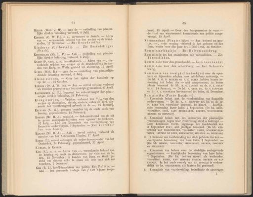 SN Wa AS 64 Kuzer (Wed. J. M). — Aan de — ontheffing van plaatse- lijke direkte belasting verleend, 6 Julij. * Kinderen (Uitbestede). — Zie: Bestedelingen (Stads). Kistemaker (Mr. L. P.) — Aan — ontheffing van plaatse- lijke direkte belasting verleend, 6 1 £ JAN), c. s., broodbakkers. — Adres van —, ver- ji ge accijns op de brandstoffen; in han- den van Burg. en Weth. gesteld tot afdoening, 13 April. Kiers (Wed. R.) — Aan de — ontheffing van plaatselijke direkte belasting verleend, 6 Julij. Kleine steenen. — Over het rijden der kavalerie op op de —, 27 October. Kreeck (Dr. A. W. DE). — Aan — eervol ontslag verleend als tweeden praceptor aan het stedelijk gymnasium, 27 April. KimkuaMEer (J. P.), benoemd tot sub-ontvanger der plaat- selijke direkte belasting, 24 VR 7 | i ien. — Vrijdom verleend van 1/99 van den We IE, NAE cinders, cokes en turf, die- nende tot voortbrengend gebruik in de —, 29 Januari]. Kuuyver (A. W.), gewezen beambte bij de stads bank van leening, gepensioneerd, 10 Februari. KoErT (C.), eervol ontslagen als onder-havenmeester van het Oosterdok, 24 Februarij; gepensioneerd, 27 April. KöÖHLER, ie KUELER. 65 kend, 13 April. — Door den burgemeester is voor — de titel van waarnemend kommissaris van politie aange- vraagd, 13 April. Kommissarishuisje. — Zie: Halvemaansbrug. Kommissie tot het examineren van varenslieden. — Zie: Varenslieden. Kommissie voor den graarhandel. — Zie: Graan handel. Kommissie voor den schouwburg. — Zie: Schouw- burg. Kommissie van toezigt (Plaatselijke) over de open- bare en bijzondere scholen voor middelbaar onderwijs. — De hh. J. M. B. BEUKER en F. C. QUIEN hebben hunne be- noeming tot leden der — niet aangenomen; in hunne plaats benoemd de hh. H. G. JANSEN en dr. F. J. STAM- KART, 14 Januarij. — De hh. P. KEEP JR., dr. S. SARPHATI en dr. F. J. STAMKART herbenoemd tot leden, 21 December. Kommissie belast met het ontwerpen der plaatselijke verordeningen tegen wier overtreding straf is bedreigd. — Deze kommissie wordt, ingevolge het raadsbesluit van 3 September 1857, niet jaarlijks benoemd. (De hh. MEs- SCHERT VAN VOLLENHOVEN, voorzitter, ASSER, SCHIMMELPEN- NINCK, LINTELO DE GEER, HEEMSKERK, MOLSTER en BÜCHNER). Kommissie van voorbereiding van stáds publieke werken. — Jaarlijksche benoeming van hare leden, 7 September. — (De hh. MOMMA, voorzitter, HESHUYSEN, BEUKER, INSINGER en RIJNDERS). Kommissie van beheer over de stedelijke rentegevende eigendommen. — Jaarlijksche benoeming van hare leden, 7 September. (De hh. CORVER HOOFT, als wethouder, voorzitter, ASSER, VAN LIMBURG STIRUM, BEUKER en VAN LENNEP. Jn het zesde vervolg van dit overzigt is verkeer- delijk de hr. SPLITGERBER als laatste lid genoemd). 5. Kommissie van voorbereiding, betreffende de aanvragen B) Kyme (C. W. F.), €. s., verveeners te Smilde. — Adres van —, verzoekende behoud van den accijns op de brand- stoffen, 17 November. — Zie: Brandstoffen. KoEsEeN (Mr. H. J.), raadslid. — Gekommitteerd om de uit te geven anticipatie-biljetten voor -gezien te, [eskenen, 27 Julij. — Lid der kommissie van voorbereiding van financiële onderwerpen, 7 September. — (Zie: Voorstel- len van leden). Koi (A) 0 77 Adres van —, verzoekende behoud van de keuring op melk en drinkwater, ter visie van de le- den, 23 November; in handen van Burg. en Weth. ge- steld om daarop acht te slaan als deze zaak zich zal voordoen, 7 December. ea Kommandant (Plaatselijke). — Aan kolonel DE Mou- LIN, —, vrije woning verleend in het gebouw op den Dam, weder voor één jaar tet 1 Mei 1866, 26 October. Kommissiën (Vaste Raads —): Koenen (Mr. H. J.) — Aan — eervol ontslag verleend als curator van het Athenaeum Tllustre, 27 April. Kox (R. J.), hoofd-inspekteur van politie. Zie: Politie. — — ee personele toelage van f 500 sJaars toege- 1. Kommissie belast met de voorbereiding van financiële onderwerpen. — De hr. L. A. BIENFAIT tot lid en de hr. P. KEER tot voorzitter benoemd, 16 Maart. — Jaarlijk- sche benoeming harer leden, 7 September. (De hh. KEER, voorzitter, COOL, CATS BUSSEMAKER, KOENEN, WOLTERBEEK, MENDES en BIENFAIT).