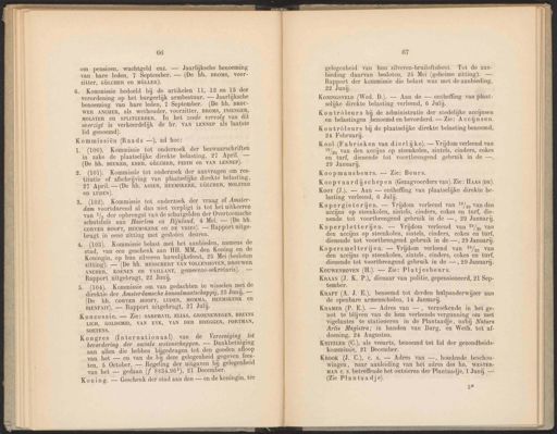 EL il 66 om pensioen, wachtgeld enz. — Jaarlijksche benoeming van hare leden, 7 September. — (De hh. BROMS, voor- zitter, GÜLCHER en MÜLLER). Kommissie bedoeld bij de artikelen 11, 12 en 13 der verordening op het burgerlijk armbestuur. — Jaarlijksche benoeming van hare leden, 7 September. (De hh. BROU- WER ANCHER, als wethouder, voorzitter, BROMS, INSINGER, MOLSTER en SPLITGERBER. In het zesde vervolg van dit overzigt is verkeerdelijk de hr. VAN LENNEP als laatste lid genoemd). Kommissiën (Raads —), ad hoc: 1. (100). Kommissie tot onderzoek der bezwaarschriften in zake de plaatselijke direkte belasting, 27 April. — (De hh. BEUKER, KEER, GÜLCHER, FEITH en VAN LENNEP). (102). Kommissie tot onderzoek der vraag of Amster- dam voortdurend al dan niet verpligt is tot het uitkeeren van 1/3 der opbrengst van de schutgelden der Overtoomsche schutsluis aan Haarlem en Rijnland, 4 Mei. — (De hh. CORVER HOOFT, HEEMSKERK en DE VRIES). — Rapport uitge- bragt in eene zitting met gesloten deuren. (103). Kommissie belast met het aanbieden, namens de stad, van een geschenk aan HH. MM. den Koning en de Koningin, op hun zilveren huwelijksfeest, 25 Mei (besloten zitting). — (De hh. MESSCHERT VAN VOLLENHOVEN, BROUWER ANCHER, KOENEN en VAILLANT, gemeente-sekretaris). — Rapport uitgebragt, 22 Junij. (104). Kommissie om van gedachten te wisselen met de direktie der Amsterdamsche kanaalmaatschappij, 23 Junij. — (De hh. CORVER HOOFT, LUDEN, MOMMA, HEEMSKERK Cn BIENFAIT). — Rapport uitgebragt, 27 Juli. Koncessie. — Zie: SARPHATI, ELIAS, GROENEWEGEN, BRUINS LICH, GOLDSMID, VAN EYK, VAN DER BREGGEN, PORTMAN, SOETENS. Koning. — Geschenk der stad aan den — en de koningin, ter 67 gelegenheid van hun zilveren-bruilofisfeest. Tot de aan- bieding daarvan besloten, 25 Mei (geheime zitting). — Rapport der kommissie die belast was met de aanbieding, 22 Junij. KonmgsveLn (Wed. D.). — Aan de — ontheffing van plaat- selijke direkte belasting verleend, 6 Julij. Kontrôleurs bij de plaatselijke direkte belasting benoemd, 24 Februarij. en turf, dienende tot voortbrengend gebruik in de —, 29 Januarij. Koopmansbeurs. — Zie: Beurs. Koperpletterijen. — Vrijdom verleend van 19/4 van den accijns op steenkolen, sintels, cinders, cokes en turf, dienende tot voortbrengend gebruik in de —, 29 Januari. Krarr (A. J. E.), benoemd tot derden hulponderwijzer aan de openbare armenscholen, 14 Januari. KRAMER (P. E.). — Adres van —, Verzoekende in het ge- not te blijven van de hem verleende vergunning om met vigelantes te stationeren in de Plantaadje, nabij Natura Artis Magistra; in handen van Burg. en Weth. tot af- doening, 24 Augustus. KRITZLER (C.), als veearts, benoemd tot lid der gezondheids- kommissie, 21 December. MAN €. s. betreffende het ontsieren der Plantaadje, 1 Junij. — (Zie Plantaadje). 5%* (101). Kommissie tot onderzoek der aanvragen om Tes- titutie of afschrijving van plaatselijke direkte belasting, 27 April. — (De hh. ASSER, HEEMSKERK, GÜLCHER, MOLSTER en LUDEN). Kongres (Internationaal) van de Vereeniging tot bevordering der sociale wetenschappen. — Dankbetuiging aan allen die hebben bijgedragen tot den goeden afloop van het — en van de bij deze gelegenheid gegeven fees- ten, 5 October, — Regeling der uitgaven bij gelegenheid van het — gedaan (f 8834.965), 21 December. Kontrôleurs bij de administratie der stedelijke accijnsen en belastingen benoemd en bevorderd. — Zie: Accijnsen. Kool (Fabrieken van dierlijke). — Vrijdom verleend van 19/99 van den accijns op steenkolen, sintels, cinders, cokes Koopvaardijschepen (Gezagvoerders van). Zie: HAAs (DE). Kopersmelterijen. — Vrijdom verleend van 19/9 van den accijns op steenkolen, sintels, cinders, cokes en turf, dienende tot voortbrengend gebruik in de —, 29 Januarij. Krook (J. C.), €. s. — Adres van —, houdende beschou- wingen, naar aanleiding van het adres des hn. WESTER- Kooy (J.). — Aan — ontheffing van plaatselijke direkte be- lasting verleend, 6 Julij. KouwENHOVEN (H.). — Zie: Platjesbeurs. Kopergieterijen. — Vrijdom verleend van 19/99 van den accijns op steenkolen, sintels, cinders, cokes en turf, die- nende tot voortbrengend gebruik in de —, 29 Januarij. Kraan (J. K. P.), dienaar van politie, gepensioneerd, 21 Sep- tember.
