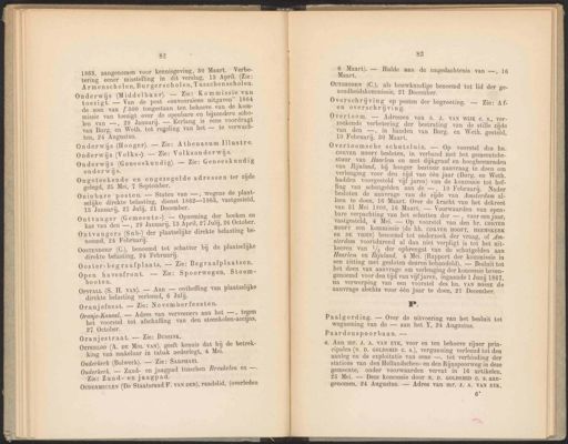 82 1863, aangenomen voor Ne 30 pe Ï eener misstelling in dit verslag, ; : DE olen Burgerscholen, Tusschenscholen. Onderwijs Oda _ Nt zigt. — Van de post -onvo 8 uitg t Ie van {300 toegestaan ten Veen pe a pe issi i er de bare en bijzondere scho- missie van toezigt over de open B ja arij Berle eene voordrag van —, 29 Januarij. — Eerlang is € dragt WN Burg. en Weth. tot regeling van het — te verwach ten, 24 Augustus. Onderwijs (Hooger). — Zie: I Onderwijs (Volks-). — Zie: Volksonderwijs. Onderwijs (Geneeskundig). — Zie: Geneeskundig onderwijs. T Ongeteekende en ongezegelde adressen ter zijde gelegd, 25 Mei, 7 September. on Oninbare posten. — Staten van —, wegens de plaat- Athenaeum Illustre. selijke direkte belasting, dienst 1862—1863, vastgesteld, 18 Januarij, 27 Julij, 21 December. Ontvanger (Gemeente-). — Opneming der boeken en kas van den —, 29 Januarij, 13 April, 27 Julij, 26 October. OuDERMEULEN (De Staatsraad F. vaN DER), raadslid, (overleden 83 6 Maart). Maart. OuTsH0oRN (C.), als bouwkundige benoemd tot lid der ge- zondheidskommissie, 21 December. Overschrijving op posten der begrooting. — Zie: Af- en overschrijving. — Hulde aan de nagedachtenis van —, 16 Overtoom. — Adressen van s. |. VAN WIJK C. 8, ver- zoekende verbetering der bestrating van de stille zijde van den —, in handen van Burg. en Weth. gesteld, 10 Februarij, 80 Maart. Overtoomsche schutsluis, — Op voorstel des hn. CORVER HOOFT besloten, in verband met het gemeentebe- stuur van Haarlem en met dijkgraaf en hoogheemraden van Rijnland, bij hooger bestuur aanvraag te doen om verlenging voor den tijd van één jaar (Burg. en Weth. hadden voorgesteld vijf jaren) van de koncessie tot hef- fing van schutgelden ‘aan de —, 10 Februarij. Nader besloten de aanvrage van de zijde van Amsterdam al- leen te doen, 16 Maart. Over de’ kracht van het dekreet van 31 Mei 1808, 16 Maart. — Voorwaarden van open- bare verpachting van het schutten der — , voor een jaar, vastgesteld, 4 Mei. — Op voorstel van den hr. CORVER HOOFT een kommissie (de hh. CORVER HOOFT, HEEMSKERK en DE VRIES) benoemd tot onderzoek der vraag, of Am- sterdam voortdurend al dan niet verpligt is tot het uit- keeren van 1/4 der opbrengst van de schutgelden aan Haarlem en Rijnland, 4 Mel. (Rapport der kommissie in een zitting met gesloten deuren behandeld). — Besluit tot het doen van aanvrage om verlenging der koncessie boven- genoemd voor den tijd van vijf jaren, ingaande 1 Junij 1867, na verwerping van een voorstel des hn. VAN BOSsE de aanvrage slechts voor één jaar te doen, 21 December. P. Paalgording. — Over de uitvoering van het besluit tot wegneming van de — aan het Y, 24 Augustus. Paardenspoorbaan. — a. Aan MT. J. A. VAN EYK, voor en ten behoeve zijner prin- cipalen (N. D. GOLDSMID €. s.), vergunning verleend tot den aanleg en de exploitatie van eene —, tot verbinding der stations van den Hollandschen- en den Rijnspoorweg in deze gemeente, onder voorwaarden vervat in 16 artikelen, 25 Mei. — Deze koncessie door N. D. GOLDSMID Cc. s. aan- genomen, 24 Augustus. — Adres van mr. J. A. VAN EYK, e° Ontvangers (Sub-) der plaatselijke direkte belasting be- noemd, 24 Februarij. j fl Oostenporp (C.), benoemd tot schatter bij de plaatselijke direkte belasting, 24 Februarij. Ooster-begraafplaats. — Zie: Begraafplaatsen. Open havenfront. — Zie: Spoorwegen, sioom booten. pi Opsratt (S. H. vAn). — Aan — ontheffing van plaatselijke direkte belasting verleend, 6 Julij. Oranjefeest. — Zie: Novemberfeesten. ie-Kan — Adres van verveeners aan het — , tegen ie ee tot afschaffing van den steenkolen-aceijns, 27 October. Oranjestraat. — Zie: BUSsINK. EIN (A. DE MOL VAN). geeft kennis dat hij de betrek- king van makelaar in tabak nederlegt, 4 Mel. kerk (Bolwerk). — Zie: SARPHATI Ei 7 Zand- en jaagpad tusschen Breukelen en —. Zie: Zand- en jaagpad.