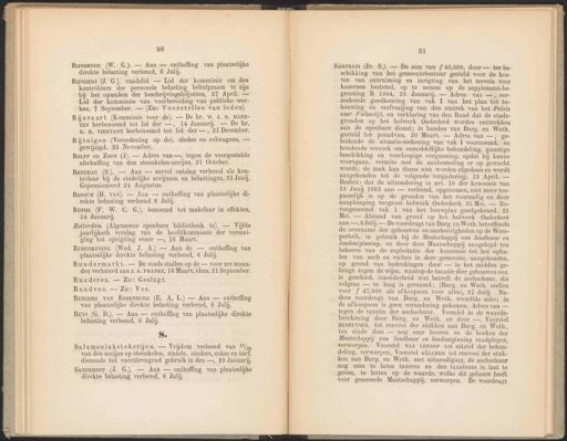 90 RIJNBENDE (W. G.). — Aan — ontheffing van plaatselijke direkte belasting verleend, 6 Julij. Runderen. — Zie: Geslagt. s. Salamoniakstokerijen. — Vrijdom verleend van 19/% van den accijns op steenkolen, sintels, cinders, cokes en turf, dienende tot voortbrengend gebruik in den —, 29 Januari. 91 SARPHATI (Dr. S.). — De som van {f 40,000, door — ter be- schikking van het gemeentebestuur gesteld voor de kos- ten van ontruiming en inrigting van het terrein voor kazernen bestemd, op te nemen op de supplement-be- grooting B 1864, 29 Januarij. — Adres van —, ver- zoekende goedkeuring van vak I van het plan tot be- bouwing en verfraaijing van den omtrek van het Paleis voor Volksvlijt, en verklaring van den Raad dat de stads- gronden op het bolwerk Ouderkerk worden onttrokken aan de openbare dienst; in handen van Burg. en Weth. gesteld tot preadvies, 30 Maart. — Adres van —, ge- leidende de situatie-teekening van vak I voornoemd, en houdende verzoek om onmiddellijke behandeling, gunstige beschikking en voorloopige vergunning, opdat hij kunne voortgaan, vermits met de aanbesteding er op gewacht wordt; de zaak kan thans niet worden afgedaan en wordt aangehouden tot de volgende vergadering, 13 April. — Besluit: dat de uitzondering in art. 10 der koncessie van 18 Junij 1862 aan — verleend, opgenomen, niet meer toe- passelijk is op de gronden van het voormalig en door aanplemping Vergroot bolwerk Ouderkerk, 25 Mei. — Bo- vengenoemd vak 1 van het bouwplan goedgekeurd, 25 Mei. — Afstand van grond op het bolwerk Ouderkerk aan —, 6 Julij. — De voordragt van Burg. en Weth. betreffende de overname der gebouwen en aanhoorigheden op de Wees- perbelt, in gebruik bij de Maatschappij van landbouw en landontginning, en door deze Maatschappij aangelegd ten behoeve van de exploitatie der koncessie tot het opha- len van asch en vuilnis in deze gemeente, aangehouden, op grond van bedenkingen door — in het midden ge- bragt tegen de wijze, waarop de taxatie dier gebouwen enz. is geschied, inzonderheid wat betreft de aschschuur, die volgens — te laag is geraamd; (Burg. en Weth. stellen voor f 47,000 als afkoopsom voor alles), 27 Julij. Na- dere voordragt van Burg. en Weth. terzelfde zake; in de afkoopsom is geen verandering gekomen. Adres van — tegen de taxatie der aschschuur. Verschil in de waarde- berekening door Burg. en Weth. en door —, Voorstel HESHUYSEN, tot renvooi der stukken aan Burg. en Weth, ten einde deze — nog eens hooren en de boeken der Maatschappij van landbouw en landontginning raadplegen, verworpen. Voorstel VAN LENNEP tot uitstel der behan- deling, verworpen, Voorstel GÜLCHER tot renvooi der stuk- ken aan Burg. en Weth. met uitnoodiging, de aschschuur nog eens te laten taxeren en den taxateurs in last te geven, te letten op de waarde, welke dit gebouw heeft voor genoemde Maatschappij, verworpen. De voordragt RijNDERs (J. G.), raadslid. — Lid der kommissie om den kontrôleurs der personele belasting behulpzaam te zijn bij het opmaken der beschrijvingsbiljetten, 27 April. — Lid der kommissie van voorbereiding van publieke wer- ken, 7 September. — (Zie: Voorstellen van leden). Rundvee. — Zie: Vee. SANDERSON (J. G.). — Aan — ontheffing van plaatselijke direkte belasting verleend, 6 Julij. Rijnvaart (Kommissie voor de). — De hr. W. J. R. HAER- TEN herbenoemd tot lid der —, 14 Januari. — De hr. R. R. VIERVANT herbenoemd tot lid der —, 21 December. RuTGErs van RozenBurG (E. A. L.) — Aan — ontheffing van plaatselijke direkte belasting verleend, 6 Julij. Rijtuigen (Verordening op de), sleden en rolwagens, — gewijzigd, 23 November. Ruys (G. D.). — Aan — ontheffing van plaatselijke direkte belasting verleend, 6 Julij. RoLFF en Zoon (J). — Adres van —, tegen de voorgestelde afschaffing van den steenkolen-accijns, 27 October. RonpEau (S.). — Aan — eervol ontslag verleend als kon- tròleur bij de stedelijke accijnsen en belastingen, 23 Junij, Gepensioneerd 24 Augustus. Rossum (H. van). — Aan — ontheffing van plaatselijke di- rekte belasting verleend 6 Julij. Rorue (F. W. C. G.), benoemd tot makelaar in effekten, 14 Januarij. Rotterdam (Algemeene openbare bibliotheek te). — Vijfde jaarlijksch verslag van de hoofdkommissie der vereeni- ging tot oprigting eener —, 16 Maart. RUBENKONING (Wed. J. A.) — Aan de — ontheffing van plaatselijke direkte belasting verleend, 6 Julij. Rundermarkt. — De stads stallen op de — voor zes maan- den verhuurd aan J. A. FRANKE, 16 Maart; idem, 21 September.