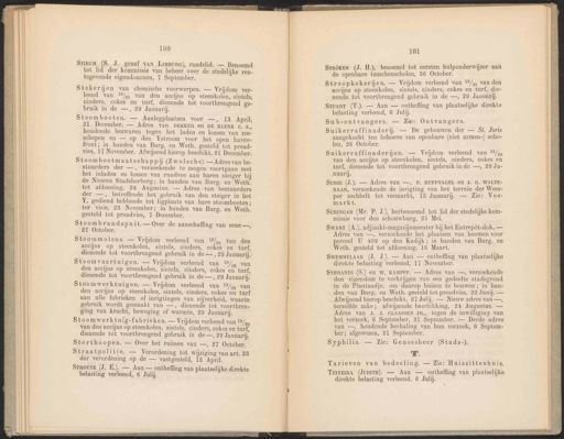100 STIRUM (S. J. graaf van LimBur6), raadslid. — Benoemd tot lid der kommissie van beheer over de stedelijke ren- tegevende eigendommen, 7 September. Stokerijen van chemische voorwerpen. — Vrijdom ver- leend van 19/,, van den accijns op steenkolen, sintels, cinders, cokes en turf, dienende tot voortbrengend ge- bruik in de —, 29 Januarij. Stoombooten. — Aanlegplaatsen voor —, 18 April, 21 December. — Adres van DEKKER en DE KLERK C. S,, houdende bezwaren tegen het laden en lossen van zee- schepen en — op den Ystroom voor het open haven- front; in handen van Burg. en Weth. gesteld tot pread- vies, 17 November. Afwijzend hierop beschikt, 21 December. Stoombootmaatschappij (Zwolsche). — Adres van be- stuurders der —, verzoekende te mogen voortgaan met het inladen en lossen van rundvee aan haren steiger bij de Nieuwe Stadsherberg; in handen van Burg. en Weth. tot afdoening, 24 Augustus. — Adres van bestuurders der —, betreffende het gebruik van den steiger in het V; gediend hebbende tot ligplaats van hare stoombooten; ter visie, 23 November; in handen van Burg. en Weth. gesteld tot preadvies, 7 December. ® Stoombrandspuit. — Over de aanschaffing van eene —, 27 October. Stoommolens. — Vrijdom verleend van 19/9 Van den acens op steenkolen, sintels, cinders, cokes en turf, dienende tot voortbrengend gebruik in de —, 29 Januarij. Stoomwerktuigen. — Vrijdom verleend van 19/0 van den accijns op steenkolen, sintels, cinders, cokes en turf aan alle fabrieken of inrigtingen van nijverheid, waarin gebruik wordt gemaakt van —, dienende tot voortbren- ging van kracht, beweging of warmte, 29 Januarij. Stoomwerktuig-fabrieken. — Vrijdom verleend van 19/5, van den accijns op steenkolen, sintels, cinders, cokes en turf, dienende tot voortbrengend gebruik in de —, 29 Januarij. STROEVE (J. E.). — Aan — ontheffing van plaatselijke direkt belasting verleend, 6 Julij. a) We 101 STRöKER (J. H.), benoemd tot eersten hulponderwijzer aan de openbare tusschenscholen, 26 October. Suikerraffinaderij. — De gebouwen der — St. Joris aangekocht ten behoeve van openbare (niet armen-) scho- len, 26 October. SurINGAR (Mr. P. J.), herbenoemd tot lid der stedelijke kom- missie voor den schouwburg, 25 Mei. Swart (A.), adjunkt-magazijnmeester bij het Entrepòt-dok. — Adres van —, verzoekende het plaatsen van boomen voor erceel U 499 op den Kadijk; in handen van Burg. en Weth. gesteld tot afdoening, 16 Maart. SwEMMELAAR (J. J.). — Aan — ontheffing van plaatselijke direkte belasting verleend, 17 November. Syphilis. — Zie: Geneesheer (Stads-). Tw. Tarieven van bedeeling. — Zie: Huiszittenhuis. TEIXEIRA (JuDITa). — Aan — ontheffing van plaatselijke direkte belasting verleend, 6 Julij. Stoomvaartuigen. — Vrijdom verleend van 19/50 van den accijns op steenkolen, sintels, cinders, cokes en turf, dienende tot voortbrengend gebruik in de —, 29 Januarij. Storthoopen. — Over het ruimen van —, 27 October. Stroopkokerijen. — Vrijdom verleend van 19/% van den accijns op steenkolen, sintels, cinders, cokes en turf, die- nende tot voortbrengend gebruik in de —, 29 Januari. Suikerraffinaderiijjen. — Vriijdom verleend van 1°%/% van den accijns op steenkolen, sintels, cinders, cokes en turf, dienende tot voortbrengend gebruik in de —, 29 Ja- nuarij. SYBRANTS (S.) en W. KAMPFF. — Adres van —, verzoekende den eigendom te verkrijgen van een gedeelte stadsgrond in de Plantaadje, om daarop huizen te bouwen; in ban- den van Burg. en Weth. gesteld tot preadvies, 22 Junij. — Afwijzend hierop beschikt, 27 Julij. — Nieuw adres van —, terzelfde zake; afwijzende beschikking, 24 Augustus. — Adres van J. J. CLAASSEN JR., tegen de inwilliging van het verzoek, 6 September, 21 September. — Derde adres van —, houdende herhaling van hun verzoek, 6 Septem- ber; afgewezen, 21 September. Straatpolitie. — Verordening tot Wijziging van art. 83 der verordening op de — vastgesteld, 13 April. Stuart (T.). — Aan — ontheffing van plaatselijke direkte belasting verleend, 6 Julij. SuRIE (J.). — Adres van —, P. HUFFNAGEL en J. G. WALTE- NAAR, verzoekende de inrigting van het terrein der Wees- per aschbelt tot veemarkt, 13 Januarij. — Zie: Vee- markt. Sub-ontvangers. — Zie: Ontvangers.