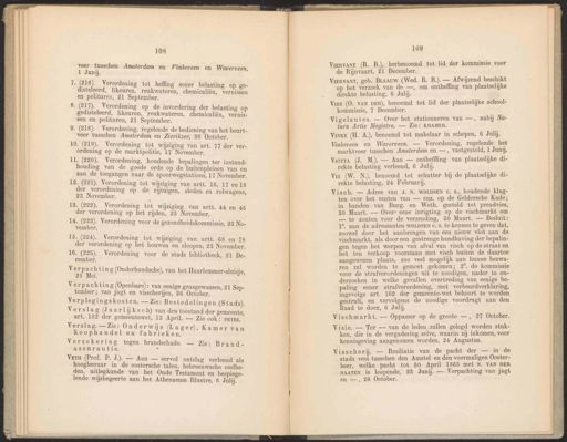 Ee OA 108 veer tusschen Amsterdam en Vinkeveen en Waverveen 1 Junij. 7. (216). Verordening tot heffing eener belasting op ge- disteleerd, likeuren, reukwateren, chemicaliën, vernissen en polituren, 21 September. 8. (217). Verordening op de invordering der belasting op gedisteleerd, likeuren, reukwateren, chemicaliën, vernis- sen en politnren, 21 September. 9. (218). Verordening, regelende de bediening van het beurt- veer tusschen Amsterdam en Zierikzee, 26 October. 11. (220). Verordening, houdende bepalingen ter instand- houding van de goede orde op de buitenpleinen van en aan de toegangen naar de spoorwegstations, 17 November. 14. (223). Verordening voor de gezondheidskommissie, 23 No- vember, 15. (224). Verordening tot wijziging van artt. 68 en 78 der verordening op het bouwen en sloopen, 23 November. 16. (225). Verordening voor de stads bibliotheek, 21 De cember. Verpachting (Onderhandsche), van het Haarlemmer-sluisje 25 Mei. Verpachting (Openbare): van eenige grasgewassen, 21 Sep- tember; van jagt en visscherijen, 26 October. Verplegingskosten. — Zie: Bestedelingen (Stads). Verslag (Jaarliijksch) van den toestand der gemeente, art. 182 der gemeentewet, 13 April. — Zie ook: PETRI Verslag. — Zie: Onderwijs (Lager), K koophandel en Rees Ge Verzekering tegen brandschade. — Zie: Brand- assurantie. VETa (Prof. P. J.). — Aan — eervol ontslag verleend als hoogleraar in de oostersche talen, hebreeuwsche ondhe- den, uitlegkunde van het Oude Testament en bespiege- lende wijsbegeerte aan het Athenaeum Mllustre, 6 Julij. 109 ViervanTt (R. R.), herbenoemd tot lid der kommissie voor de Rijnvaart, 21 December. ViervaNt, geb. Braauw (Wed. R. R.). — Afwijzend beschikt op het verzoek van de —, om ontheffing van plaatselijke direkte belasting, 6 Julij. Vies (O. vAN DER), benoemd tot lid der plaatselijke school- kommissie, 7 December. Vigelantes. — Over het stationneren van —, nabij Na- tura Artis Magistra. — Zie: KRAMER. Visxe (H. A.), benoemd tot makelaar in schepen, 6 Juli. Vinkeveen en Waverveen. — Verordening, regelende het marktveer tusschen Amsterdam en — , vastgesteld, 1 Junij. Viorta (J. M.). — Aan — ontheffing van plaatselijke di- rekte belasting verleend, 6 Julij. Vis (W. N.), benoemd tot schatter bij de plaatselijke di- rekte belasting, 24 Februarij. Visch. — Adres van J. N. WOLDSEN c. s., houdende klag- ten over het venten van — enz. op de Geldersche Kade; in banden van Burg. en Weth. gesteld tot preadvies, 80 Maart. — Overs eene inrigting op de vischmarkt om — te zouten voor de verzending, 30 Maart. — Besluit: 1°, aan de adressanten WOLDSEN c. s. te kennen te geven dat, zoowel door het aanbrengen van een nieuw vlot aan de vischmarkt, als door een gestrenge handhaving der bepalin- gen tegen het werpen van afval van visch op de straat en het ten verkoop voorstaan met visch buiten de daartoe aangewezen plaats, zoo veel mogelijk aan hunne bezwa- ren zal worden te gemoet gekomen; 2°. de kommissie voor de strafverordeningen uit te noodigen, nader te on- derzoeken in welke gevallen overtreding van eenige be- paling eener strafverordening, met verbeurdverklaring, ingevolge art. 162 der gemeente-wet behoort te worden Vischmarkt. — Oppasser op de groote —, 27 October. Visie. — Ter — van de leden zullen gelegd worden stuk- ken, die in de vergadering zelve, waarin zij inkomen, voor kennisgeving aangenomen worden, 24 Augustus. Visscherij. — Resiliatie van de pacht der — in de stads vest tusschen den Amstel en den voormaligen Ooster- beer, welke pacht tot 30 April 1865 met N. VAN DER NAATEN is loopende, 28 Junij. — Verpachting van jagt en =— , 26 October. 10. (219). Verordening tot wijziging van art. 77 der ver- ordening op de marktpolitie, 17 November. 4 (221). eee tot wijziging van artt. 16, 17 en 18 er verordening op de rijtuigen, sleden en rolw 23 November. ° Ai ien estraft, en vervolgens de noodige voordragt aan den Raad te doen, 6 Julij. 13. (222). Verordening tot wijziging van artt. 44 en 45 der verordening op het rijden, 23 November.