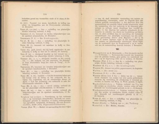 114 bedoelden grond ten voormelden einde af te staan, 21 De- cember. 52. (381). Voorstel VAN BOSSE, betreffende de heffing van schut- en bruggelden aan de Overtoomsche schutsluis, 21 December. VorsTELMAN (V. J.) — Zie: Lindengracht. Vos (C. H. DE). — Aan — ontheffing van plaatselijke di- rekte belasting verleend, 6 Julij. Vrouik (Prof. W.). — Besluit tot aanvaarding der door wijlen 115 — aan de stad vermaakte verzameling van natuur- en geneeskundige voorwerpen, onder de volgende door den erflater gestelde voorwaarden: a. dat daarvoor door den gemeenteraad een geschikt lokaal worde aangewezen, waar die verzameling voor het onderwijs in de anatomie, phy- siologie en zoölogie meest dienstbaar kan worden ge- maakt; ò. dat daarvan het gedeelte uitmakende de ge- raamten en schedels van dieren ter beschikking zal blijven van en alzoo strekken kan tot aanvulling der bestaande verzamelingen van dergelijke voorwerpen van het zoölo- gisch genootschap Natura Artis Magistra; c. dat op de eene of andere zigtbare wijze in het stedelijk museum van natuur- en geneeskundige voorwerpen steeds blijke van de verdiensten door de hoogleeraren G. en W. VROLIK ook aan de zamenstelling daarvan bewezen, 7 December. ww. Waaggebouw op de Botermarkt. — Over de amotie van het —, 27 October. — Verworpen het voorstel der kommissie voor de publieke werken, geen gelden tot onderhoud van het — op de begrooting 1865 uit te trekken, 27 October. WARNINK (Erven wed. J. K.) — Adres van de —, verzoe- kende restitutie van accijns van eene partij gedisteleerd, waarvan bij verzending de afteekening is verzuimd ge- worden; in handen van Burg. en Weth. gesteld, 13 April. WATER (G. TEN). — Aan — ontheffing van plaatselijke di- rekte belasting verleend, 6 Julij. Water (Stads). — Verkoop van —, zie: Verkoop. Watertol. — Zie: Muiden, Naarden. s* Voort (G. VAN DER). — Aan — ontheffing van plaatselijke direkte belasting verleend, 6 Julij. Voûte (H. J.), benoemd tot makelaar in koffij en thee, 14 Januarij. WäcuTEr (Wed. J. C.). — Aan de — ontheffing van plaat- selijke direkte belasting verleend, 6 Julij. Wasdoekfabrieken. — Vrijdom verleend van 19/4 van den accijns op steenkolen, sintels, cinders, cokes en turf. dienende tot voortbrengend gebruik in de —, 29 Januari, VooRTMAN (C. J.), benoemd tot derden hulponderwijzer aan de openbare armenscholen, 21 December. Voûte (S.), geeft kennis dat hij heeft opgehouden de ma- kelaardij in koffij en thee uit te oefenen, 29 Januari. Voys (P. DE). — Afwijzend beschikt op het verzoek van — om ontheffing van plaatselijke direkte belasting, 6 Juli. VREEKEN (D.), €. s. — Afwijzend beschikt op het verzoek van —, het trekpad van het vaarwater »de Schinkel te doen doortrekken langs het huis de Vraag”, 10 Fe- Wacuwitz (E. F.), c.s. — Zie: Lindengracht. Waskaarsenfabrieken. — Vrijdom verleend van 19/% van den accijns op steenkolen, sintels, cinders, cokes en turf, dienende tot voortbrengend gebruik in de — 29 Januarij. bruarij. WaLpeck (H.), dienaar van politie, gepensioneerd, 24 Augustus. VrEuGENHIL (F), benoemd tot tweeden hulponderwijzer aan de openbare tusschenscholen, 7 December. Wallen. — Zie: puYNs (6). Vries (M.). — Aan — ontheffing van plaatselijke direkte belasting verleend, 17 November. WALTENAAR (J. G.). — Zie: SUPIE. Vries (Mr. A. DE), raadslid. — Lid der kommissie belast met bet toezigt over de loting en het onderzoek der be- wijzen van vrijstelling van de schutterlijke dienst, 13 April. — Lid der kommissie van onderzoek in zake der Overtoomsche schutsluis, 4 Mei. Vries (Mr. A. DE). — Aan — eervol ontslag verleend als lid der plaatselijke schoolkommissie, 17 November. Vries (M. DE), — Aan — eervol ontslag verleend als hulponderwijzer aan de openbare armenscholen, 17 No- vember. Vrijdom van accijns. — Verordening op het verleenen van — op voorwerpen (brandstoffen), dienende tot voort- brengend gebruik in fabrieken of andere ondernemingen van nijverheid, vastgesteld, 29 Januarij. (Zie ook: Brand- stoffen, KLEEF (VAN), Sigarenfabriekanten).