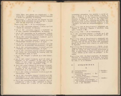 EE LIN $ zetten lijken; geen gebouw voor schijndooden). — Het ontwerp der — goedgekeurd; kosten f 160,680, waaronder f 40,000 voor gebouwen, 10 Februarij. Begrooting. — Over het doen van uitgaven voor iets, waartoe bij de onderdeelen van een post der —, de mid- delen niet zijn aangewezen, 16 Maart. Begrooting 1863. — Af- en overschrijvingen: a. van n°. 240 „onvoorziene uitgaven” f 134.10, op u. 217 “muziek der schutterij”, 29 Januarij; b. van n°. 240 „onvoorziene uitgaven” f 15,214.385, op n. 20890. » openbare vermakelijkheden”, 29 Januarij; c. van n°. 188 ” jaarwedden van de nachtwachts” f 838.65, op n. 151 ronvoorziene uitgaven der politie”, 29 Januarij; d. van n”. 240 » onvoorziene uitgaven” f 2,224.155, op n°. 9 ” bevolking-registers”, 24 Februarij; > van n°. 240 » onvoorziene uitgaven” f 1,072.385, op n°. 163 “subsidie aan de plaatselijke schoolkommissie”, 13 April; van n°. 240 > onvoorziene uitgaven” f 1,109.365, op n°, 174 „verpleging van arme krankzinnigen”, 13 April; î. van n°. 126 »bruggen” f 8,384,99, op n’. 1204 » huizen”, 4 Mei; n. van n°. 240 „onvoorziene uitgaven” { 2,069.535, op n’. 92 „schrijlloonen” f 424, n°. 99a. onderhoud en schoon- houden raadzaal enz.” f 84.60, n°. 111 „aan het Rijk 9 verschuldigd ontvangloon, voor opcenten: a. op het ge- slagt f 467.53, b. op de sterke dranken f 816.05, te zamen f 1,283.58, n°. 116 «kosten van onderscheidene inkomsten en heffingen” f 79.42, n°. 143 sstads bouw- opzigters” f 6.42, n°. 214 « uitkeering aan het Rijk, aan- deel kwade posten personele belasting” f 91.515, n°. 218 „teruggave van huren aan scheepstimmerwerven” f 100, 4 Mei. N°, INKOMSTEN. A. Anticipatie-billetten . . - | f 500,000.- Armengelden. 4; 40,000.- Armenscholen (Openbare). — Zie: Scholen, Renten. . van n°, 240 „onvoorziene uitgaven” f 282.14, op n°. 150 „huishoudelijke behoeften der politie”, 18 ey . van n°, 240 » onvoorziene uitgaven” f 980.625, toegestaan voor kosten van vervaardiging der tienjarige tafels van den burgerlijken stand, 18 April; |. van n°. 127 riolen” f 2,245.16, op n°. 97 »druk- en bindwerk”, n°. 99 »raadhuis”, n°. 121 »„dag- en week- gelden”, n°. 124 „wegen en wandelplaatsen”, n°. 125 “plantsoenen” en n°. 129 »diepwerken”, 4 Mei; Begrooting 1863 B (Supplement-), vastgesteld; ont- vangsten f 152,114.76; uitgaven f 145,389.97; batig saldo f 6,724.79, 4 Mei. Armenscholen (Openbare). — Verkoop van kapitalen van — . . | 7 69,000.- . van n°, 127 » riolen” { 393.325, n°. 198 havens” f 7,146.825, n°. 182 zschuiten” f 1,389.535 en n°. 237 » verhoogde voetpaden op den Nieuwendijk” f 1,241.31, te zamen f 10,170.995, op n°. 123 » bestrating”, 4 Mei; Begrooting 1864. — Af en overschrijving : Armverzorging (Geneeskundige). — Zie: Kerkgenootschappen, Bewijzen. . van n°. 229 „wallen en kaaimuren” f 5,787.14, op n°. 231 „schoollokalen”, 4 Mei; van n°. 246 » onvoorziene uitgaven” f 1,597.62, op n°. 216 „kosten vallende op het voeren van gedingen”, 17 No- vember. Asch. — Zie: Haardasch. ‚ van n°. 240 »onvoorziene uitgaven” {8,532.57, op n°. 231 “schoollokalen”, n°. 89 jaarwedden secretarie” en n°. 90 „jaarwedden concierge, boden, poortiers en loopers”’, 4 Mei; Begrooting 1864 A (Supplement-), vastgesteld: ont- vangsten f 183,520.185 (waaronder f 154,238.225 van het batig saldo der kas van de dienst 1863, beschikbaar gesteld voor de dienst 1864); uitgaven een gelijk bedrag, 21 September. Begrooting 1864 B (Supplement-).— Op de — in ont- vangst te brengen de onvoorziene ontvangst van VLIES, zijnde het bedrag van terug ontvangen proeces-kosten in 1864, en gelijk bedrag in uitgaaf te brengen op n°, 216 „kosten vallende op het voeren van gedingen”, 17 No- vember. Begrooting 1865, den Raad aangeboden, 24 Augustus; behandeld en vastgesteld 27 en 28 October; door Gede- puteerde Staten goedgekeurd, bij resolutie van 21 Decem- ber 1864, n°. 15, 21 December.