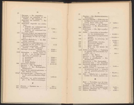 ni % ee ss 26 Omroepen. — Zie: Aanplakken. Onderhoud van gebouwen en ver- trekken. — Zie: Gebouwen. Onderhoud van meubelen. — Zie: Meubelen. Onderstand, uitgereikt aan armlas- tigen: a. domicilie van onderstand heb- bende in de gemeente, EE b. domicilie van onderstand heb- bende elders. ee Onderwijs (Volks-), van wege de twee Amsterdamsche departementen der Maatschappij Tot Nut van ’t Alge- Meen ae me Onderwijs (Middelbaar). — Zie: Mid- delbaar onderwijs. Onderwijzers en onderwijzeressen. — Bijdrage tot het pensioen van —. Onderwijzers-genootschap (Neder- landsch). — Zie: Oefenschool. Ontvanger (Gemeente-). Wedde. Bureaukosten. Ontvangloon. — Kosten wegens de 24 pCt. — aan het Rijk verschul- digd door de gemeente op: 1°. grondlasten . 2°. personeel. 3 goslag 4°. sterke dranken. Onvoorziene uitgaven . ee Opcenten. — Zie: Ontvangloon. Opzigters. — Zie: Beursopzigters, Bouwopzigters. Opzigters van gemeente-gebouwen. — 218,4 108 204 | | | | | Zie: Publieke werken. Overtoomsche sluis. — Uitkeering van 2/3 der pacht aan Haarlem en Rijn- a Overtreders van politie-verordenin- gen. — Zie: Politie-verordeningen. Pp. Patenten. — Opnemen van — Pensioenen | 2,800. — 5,275. — 6,950.— 9,650. — 41,161.98 9,333.34 250. 29,880.36 27 Pensioen. — Zie: Bedelaarskolonisten, Onderwijzers. R. Raad. — Vertrekken voor de verga- 21,600.— 110,250.— 15,000.— 3,000. — 150.— 1,000.— 450. 500.— 36,188.— 21,070.— Personele belasting. — Uitkeering aan het Rijk in het aandeel van de kwade posten, dienst 1860—1861 . deringen van den —. Zie: Gebouwen. Raadhuis. — Zie: Gebouwen. Registers van den burgerlijken stand. Registers, rekeningen enz. — Zegels. Register (Bevolking-) Personele toelagen. — Zie: Toelagen. Pijpvoerders. — Zie: Brandmeesters. Dusoenen ass Polderlasten. — Zie: Dijk- en polder- lasten. Politie. — Jaarwedden en bureaukos- ten van kommissarissen. Jaarwedden van inspekteursen agenten . OV, Kleeding en uitrusting der agenten: 2,5. Ln Huishoudelijke behoeften . Onvoorziene uitgaven . Kleine onkosten . is, Huur van het bureau der 3e sectie a Politie-verordeningen. — Verpleging en gijzeling van veroordeelde over- treders van —. Poorten. — Zie: Huizen. Poortiers. — Zie: Concierge. Premiën en gratifikatiën. — Zie: Brandmeesters. Provenieren. — Zie: Leprozenhuis. Provinciaal blad. — Zie: Staatsblad. Provinciale bijdrage aan den schouw- burg, 1883/1864; Publieke werken. — Jaarwedde van de ambtenaren bij de —, opzigters over de gemeente-gebouwen, we- Benen Lt Zan hae Oena Puin. — Ophalen van —, en schoon- houden van straten, markten enz.