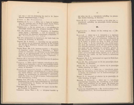 40 gen van — over de deelneming der stad in de Amster- damsche kanaalmaatschappij, 3 Junij. Cokes. — Zie: Steenkolen. COMERELL (J. J.), €. s. — Adres van — tegen de verplaat- sing der veemarkt naar de Nieuwe Vaart bij het Funen, 25 Februari, 1 September. — Zie: Veemarkt. Coor (S.), herbenoemd tot kommissaris der stads bank van leening, 25 Februarij, 16 December. CORONEL (Dr. S. SENI0R). — Inzending van zijn geschrift: De regeling van het industriëël onderwijs in den vreemde, met het oog op Nederland, bestemd voor de stads biblio- theek, 18 Maart. CorvER Hoort (Mr. J. R.), herkozen raadslid. — Toegelaten, 19 Augustus; neemt zitting, 1 September. — Herbe- noemd tot wethouder, tot ambtenaar van den burgerlijken stand en tot gekommitteerde voor de wegen en vaarten tusschen de zes Noord-Hollandsche steden, 1 September. — Zie: Voorstellen van leden. CossAAR (H. J.), benoemd tot hulponderwijzer aan de openbare armenscholen, 29 Julij. Coupon. — Adres van E. J. STEGEMA, verzoekende de uitbe- taling van een verjaarden —, ad { 25, eener stedelijke schuld- bekentenis; in handen van Burg. en Weth. gesteld tot pre- advies, 16 December. Gredit-en deposito-bank. — Adressen van de —, verzoekende openbare uitschrijving der te sluiten leening van zestien millioen voor de Amsterdamsche kanaalmaat- schappij, ter mededinging; en aanbod der — deze leening tegen den koers van 88 pCt. te nemen; beide aangenomen voor kennisgeving, 3 Junij. CROMMELIN (Mr. J. P.), herbenoemd tot regent van het Bur- ger-Weeshuis, 16 December. CROMMELIN (Erven Wed. C. D.). — Afwijzend beschikt op 41 het adres van de —, verzoekende ontheffing van plaatse- lijke direkte belasting, 16 December. Cruys (H. P.). — Afwijzend beschikt op het adres van —, verzoekende ontheffing van plaatselijke direkte belasting, 16 December. B. Dagbladen. — Huizen tot den verkoop van —. Zie: KAUFMANN. Damrak. — Adres van A. D. VERSCHUUR C. s., eigenaars van perceelen op het —, verzoekende de straat voor die perceelen drie tot vijf el te verbreeden, verklarende zij zich dan bereid, afstand te doen van hunnen eigendom op de wallen; in handen van Burg. en Weth. tot pread- vies, 3 Junij. — In het verzoek kan niet worden getre- den, doch van stadswege zal in het onderhoud der wallen voor bedoelde perceelen voorzien worden, zoodra het blij- ken mogt, dat alle eigenaren van perceelen, gelegen op het Damrak tusschen de Oude- en de Nieuwe-Brug, van alle aanspraken op de voor hunne perceelen liggende wallen onvoorwaardelijk hebben afgezien, en in geval van verbreeding der wallen, zal hun verzoek in aanmerking komen, 29 Julij. COMMELIN (C.). — Op het verzoek van — om ontheffing van plaatselijke direkte belasting, afwijzend beschikt, 13 Mei. CROESEN VINK (Wed. E.). — Adres van de —, verzoekende bescherming der politie tegen baldadigheid van hare buren in de Laurierstraat; in handen van den Burgemeester, ter afdoening, 18 Maart. DANcKERTS (Dr. J. J.), herbenoemd tot regent der Beide Gast- huizen, 16 December. Coo (S.), herkozen raadslid. — Toegelaten, 19 Augustus; neemt zitting, 1 September. — Lid der kommissie van voorbereiding van financiële onderwerpen, 1 September. — Zie: Voorstellen van leden. DAvms (Dr. Th.), herbenoemd tot lid der plaatselijke school- kommissie, 16 December, Dees (W. F.), benoemd tot schatter bij de plaatselijke direkte belasting, 29 April. Degens (F. A), c. s. — Adres van —, verzoekende intrek- king der verordening op de keuring van levensmiddelen; in handen der kommissie voor de strafverordeningen ge- steld, 1 September. DEGENs (P. J.), benoemd tot schatter bij de plaatselijke di- rekte belasting, 29 April. Deuscée (J. Toussaint). — Adres van —, verzoekende naauwkeurige toepassing der verordening op de markt- politie, met betrekking tot het leggen der schepen aan de turfmarkten; in handen van Burg. en Weth. tot afdoe- ning, 16 December. Demping van grachten enz. — Zie: Achterburgwal, Bagijnensloot, Rotterdammersloot.