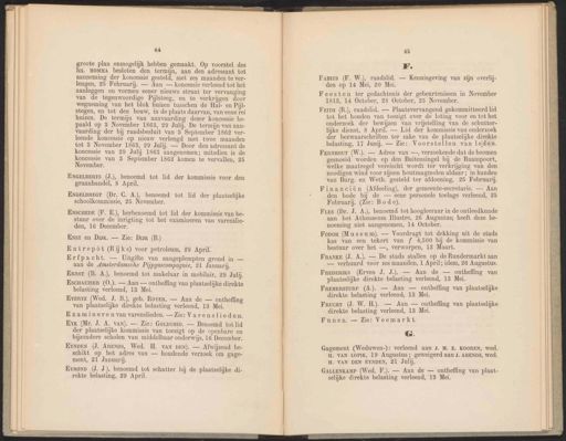 44 groote plan onmogelijk hebben gemaakt. Op voorstel des hn. MOMMA besloten den termijn, aan den adressant tot aanneming der koncessie gesteld, met zes maanden te ver- lengen, 25 Februarij. — Aan — koncessie verleend tot het aanleggen en vormen eener nieuwe straat ter vervanging van de tegenwoordige Pijlsteeg, en te verkrijgen door wegneming van het blok huizen tusschen de Hal- en Pijl- stegen, en tot den bouw, in de plaats daarvan, van eene rei huizen. De termijn van aanvaarding dezer koncessie be- paald op 3 November 1863, 29 Julij. De termijn van aan- vaarding der bij raadsbesluit van 3 September 1862 ver- leende koncessie op nieuw verlengd met twee maanden tot 3 November 1863, 29 Julij. — Door den adressant de konecessie van 29 Julij 1863 aangenomen; mitsdien is de koncessie van 3 September 1862 komen te vervallen, 25 November. ENGELBERTS (J.), benoemd tot lid der kommissie voor den graanhandel, 8 April. ENGELBREGT (Dr. C. A.), benoemd tot lid der plaatselijke schoolkommissie, 25 November. ENSCHEDE (F. E.), herbenoemd tot lid der kommissie van be- stuur over de inrigting tot het examineren van varenslie- den, 16 December. ENst en Dok. — Zie: Dijk (B.) Entrepôt (Rijks) voor petroleum, 29 April. Eyk (Mr. J. A. van). —- Zie: GoLDsMID. — Benoemd tot lid der plaatselijke kommissie van toezigt op de openbare en bijzondere scholen van middelbaar onderwijs, 16 December. schikt op het adres van — houdende verzoek om gage- ment, 21 Januari. EyroND (J. J), benoemd tot schatter bij de plaatselijke di- rekte belasting, 29 April. 45 F. Fagus (F. W.), raadslid. — Kennisgeving van zijn overlij- den op 14 Mei, 20 Mei, FRANKE (J. A.). — De stads stallen op de Rundermarkt aan — verhuurd voor zes maanden, 1 April; idem, 26 Augustus. FREDERIKS (Erven J. J.). — Aan de — ontheffing van plaatselijke direkte belasting verleend, 13 Mei. FrEMERsTURP (A.). — Aan — ontheffing van plaatselijke direkte belasting verleend, 13 Mei. Frucur (J. W. H.). — Aan — ontheffing van plaatselijke direkte belasting verleend, 13 Mei. Funen. — Zie: Veemarkt. G. Gagement (Weduwen-): verleend aan J. M. E. KOOREN, wed. H. VAN LOPIK, 19 Augustus; geweigerd aan J. ARENDS, wed. H. VAN DEN EYNDEN, 21 Julij, GALLENKAMP (Wed. F.). — Aan de — ontheffing van plaat- selijke direkte belasting verleend, 18 Mei. Erfpacht. — Uitgifte van aangeplempten grond in — aan de Amsterdamsche Pijpgascompagnie, 21 Januarij. EYNDEN (J. ArENDs, Wed. H. VAN DEN). — Afwijzend be- Feesten ter gedachtenis der gebeurtenissen in November 1813, 14 October, 28 October, 25 November. ErNst (B. A.), benoemd tot makelaar in mobilair, 29 Julij. Fern (R.), raadslid. — Plaatsvervangend gekommitteerd lid tot het houden van toezigt over de loting voor en tot het onderzoek der bewijzen van vrijstelling van de schutter- lijke dienst, 8 April. — Lid der kommissie van onderzoek der bezwaarschriften ter zake van de plaatselijke direkte belasting, 17 Junij. — Zie: Voorstellen van leden. EscHAUzIER (O.). — Aan — ontheffing van plaatselijke direkte belasting verleend, 18 Mei. FERNHOUT (W.). Adres van —, verzoekende dat de boomen gesnoeid worden op den Buitensingel bij de Raampoort, welke maatregel vereischt wordt ter verkrijging van den noodigen wind voor zijnen houtzaagmolen aldaar; in handen van Burg. en Weth. gesteld ter afdoening, 25 Februari]. Everrz (Wed. J. B.), geb. Royer. — Aan de — ontheffing van plaatselijke direkte belasting verleend, 13 Mei. Financiën (Afdeeling), der gemeente-secretarie. — Aan den bode bij de — eene personele toelage verleend, 25 Februarij. (Zie: Bode). Examineren van varenslieden. — Zie: Varenslieden. Fies (Dr. J. A.), benoemd tot hoogleeraar in de ontleedkunde aan het Athenaeum Illustre, 26 Augustus; heeft deze be- noeming niet aangenomen, 14 October. Fopor (Museum). — Voordragt tot dekking uit de stads kas van een tekort van f 4,500 bij de kommissie van bestuur over het —, verworpen, 13 Maart.