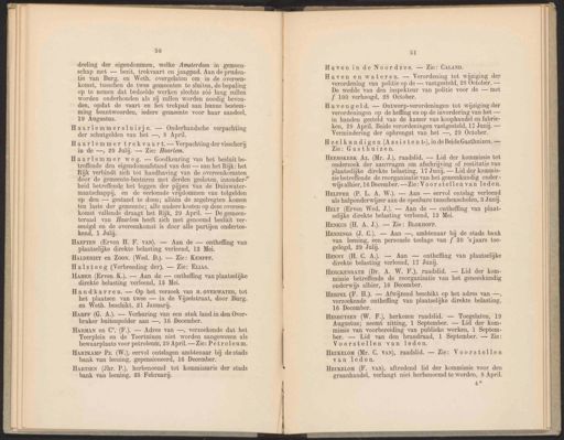 50 deeling der eigendommen, welke Amsterdam in gemeen- schap met — bezit, trekvaart en jaagpad. Aan de pruden- tie van Burg. en Weth. overgelaten om in de overeen- komst, tusschen de twee gemeenten te sluiten, de bepaling op te nemen dat bedoelde werken slechts zóó lang zullen worden onderhouden als zij zullen worden noodig bevon- den, opdat de vaart en het trekpad aan hunne bestem- ming beantwoorden, iedere gemeente voor haar aandeel, 19 Augustus. Haarlemmersluisje. — Onderhandsche verpachting der schutgelden van het —, 8 April. Haarlemmer trekvaart. — Verpachting der visscherij in de —, 29 Julij. — Zie: Haarlem. Haarlemmer weg. — Goedkeuring van het besluit be- treffende den eigendomsafstand van den — aan het Rijk: het Rijk verbindt zich tot handhaving van de overeenkomsten door de gemeente-besturen met derden gesloten, inzonder” heid betreffende het leggen der pijpen van de Duinwater- maatschappij, en de verleende vrijdommen van tolgelden op den — gestand te doen; alléén de zegelregten komen ten laste der gemeente; alle andere kosten op deze overeen- komst vallende draagt het Rijk, 29 April. — De gemeen- teraad van Haarlem heeft zich met genoemd besluit ver- eeuigd en de overeenkomst is door alle partijen ondertee- kend, 1 Juli. HAEFTEN (Erven H. F. van). — Aan de — ontheffing van plaatselijke direkte belasting verleend, 18 Mei. HALDERIET en Zoon. (Wed. D.). — Zie: KEMPFF. Halsteeg (Verbreeding der). — Zie: ELias. HAMER (Erven K.). — Aan de — ontheffing van plaatselijke direkte belasting verleend, 13 Mei. Handkarren. — Op het verzoek van H. OVERWATER, tot het plaatsen van twee — in de Vijzelstraat, door Burg. en Weth. beschikt, 21 Januari. HARFF (G. A.). — Verhuring van een stuk land in den Over- braker buitenpolder aan —, 16 December. HARMAN en C°. (F.). — Adres van —, verzoekende dat het Teerplein en de Teertuinen niet worden aangewezen als bewaarplaats voor petroleum, 29 April. — Zie: Petroleum. Hartkanp Pz. (W.), eervol ontslagen ambtenaar bij de stads bank van leening, gepensioneerd, 16 December. HarTsEN (Jhr. P.), herbenoemd tot kommissaris der stads bank van leening, 25 Februarij. 51 Havenin de Noordzee. — Zie: CALAND. Haven en wateren. — Verordening tot wijziging der verordening van politie op de — vastgesteld, 28 October. — De wedde van den inspekteur van politie voor de — met f 100 verhoogd, 28 October. Havengeld. — Ontwerp-verordeningen tot wijziging der verordeningen op de heffing en op de invordering van het — in handen gesteld van de kamer van koophandel en fabrie- ken, 29 April. Beide verordeningen vastgesteld, 17 Junij. — Vermindering der opbrengst van het —, 29 October. Heelkundigen (Assistent-), inde Beide Gasthuizen. — Zie: Gasthuizen. HEemsKERK Az. (Mr. J.), raadslid. — Lid der kommissie tot onderzoek der aanvragen om afschrijving of restitutie van plaatselijke direkte belasting, 17 Junij. — Lid der kommis- sie betreffende de reorganisatie van het geneeskundig onder - wijs alhier, 16 December. — Zie: Voorstellen van leden. HeurrER (P. L. A. W). — Aan — eervol ontslag verleend als hulponderwijzer aan de openbare tusschenscholen, 3 Junij. Hert (Erven Wed. J.). — Aan de — ontheffing van plaat- selijke direkte belasting verleend, 13 Mei. Hesxus (H. A. J.). — Zie: BLOKHOFF. Hennes (J. C.). — Aan —, ambtenaar bij de stads bank van leening, een personele toelage van f 30 ’s jaars toe- gelegd, 29 Juli. HERCKENRATH (Dr. A. W. F.), raadslid. — Lid der kom- missie betreffende de reorganisatie van het geneeskundig onderwijs alhier, 16 December. Herper (F. H.). — Afwijzend beschikt op het adres van —, verzoekende ontheffing van plaatselijke direkte belasting, 16 December. Hesauysen (W. F.), herkozen raadslid. — Toegelaten, 19 Augustus; neemt zitting, 1 September. — Lid der kom- missie van voorbereiding van publieke werken, 1 Septem- ber. — Lid van den brandraad, 1 September. — Zie: Voorstellen van leden. HeuKELoM (Mr. C. van), raadslid. — Zie: Voorstellen van leden. HeukELom (F. van), aftredend lid der kommissie voor den graanhandel, verlangt niet herbenoemd te worden, 8 April. 4* Hessy (H. C. A.). — Aan — ontheffing van plaatselijke direkte belasting verleend, 17 Junij.