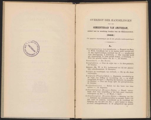 Stadsarchief Amsterdam, archieftoegang 31375, Archief van de Gemeente Amsterdam: Gemeenteblad, inventarisnummer 7, Indexen, Overzicht der handelingen van de gemeenteraad over de jaren 1851-1890, 1863