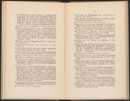 54 de betaling der som van f 5,000.000, in gemeen overleg en in geval van verschil, door Gedeputeerde Staten van Noord-Holland aangewezen; de overeenkomst wordt niet aangenomen, dan 0. a. nadat de Raad de overtuiging ver- kregen heeft, dat een bedrag van achttien millioen gulden, voldoende verzekerd voor de onderneming, beschikbaar is, buiten en behalve de bijdrage der gemeente Amsterdam). HoLTZMANN (A.) en C. OUTSHOORN. — Zie: Waterleiding. Honden (Belasting op de). — Beraadslaging over het voorstel HEEMSKERK, tot renvoi van het voorstel COOL, betreffende de invoering eener —, aan de kommissie van financiën, verdaagd tot de volgende vergadering, 21 Ja- nuarij. — Nieuw voorstel COOL met ontwerp-verordeningen op de heffing en invordering der —, in handen der kom- missie van financiën gesteld, 4 Februarij. — Het voorstel verworpen, 1 April. Hoofden voor de aanlegplaatsen in het Y. — Zie: Aan- legplaatsen. Hoofd-kommissaris van politie. — Zie: Politie. Hoofdonderwiijjzer aan eene openbare burgerschool der 1° klasse, benoemd: H. HINSE, 3 Junij. Hoofdonderwiijzeres aan eene openbare burgerschool der 4e klasse, voor meisjes, benoemd: A. HEYNIS, 3 Janij, Hooger onderwijs. — Zie: Athenaeum Illustre. HooeLaNp (J.), nachtwacht, gepensioneerd, 14 October. Hoogleeraren, eerste geneesheeren der Beide Gasthui- zen, benoemen voortaan de inwonende assistent-genees- en heelkundigen, 4 Februarij. (Van dit besluit teruggekomen; zie: Gasthuizen). Hoogleeraren aan het Athenaeum Illustre. — Eervol ont- slag verleend aan prof. W. vROLIK, 1 April. — In zijne plaats benoemd dr, J. A. FLES, 26 Augustus; die deze benoeming niet heeft aangenomen, 14 October. — Dr. F. ZAANER alleen voorgedragen. Voorstel BÜCHNER, tot aanhouding der benoeming, verworpen. Voorstel VAN CAPPELLE, tot uitnoodiging van Burg. en Weth. de voordragt aan te vullen, aangenomen, 29 October; (nadat op 28 October de stemmen gestaakt hebben). — Uit de aangevulde voordragt benoemd dr. W. BERLIN, 25 November. Hoogst aangeslagenen inde provincie Noord-Holland. Aanmerking op de lijst der —. Zie: VLIssINGEN (PAUL C. VAN) Hooiland. — Zie: Verhuring. 55 Hoop (Roei- en zeilvereeniging de). — Zie: Roei- en zeilvereeniging. Houtwarenmarkt. — Zie: Afbraak. Hovyack (Dr. E. F.), heeft zijne benoeming tot lid der plaat- selijke schoolkommissie niet aangenomen, 21 Januari. Huer (A.), biedt den Raad zijn ontwerp eener nieuwe ver- binding van Amsterdam met de Noordzee aan, 4 Februarij. Huer (Ca. Busken). — Brief van — aan den Raad over de doorgraving van Holland op zijn smalst, 13 Mei. HumEKoPER (P.). — Ingevolge de beslissing van Gedeputeerde Staten, de aanslag van — in de plaatselijke direkte belas- ting geligt uit het kohier, 1 April. Huiszittenhuis of Huiszittende stads armen. — Suppletoire begrooting 1862 goedgekeurd, 8 April, — Be- grooting 1864 goedgekeurd, 29 October. — De rubrieken voor de winterbedeeling 1863—1864 goedgekeurd, 25 November. — De hr. J. B. BEUKER herbenoemd tot regent van het —, 16 December. Hulpbanken. — Zie: Bank van leening. Hulponderwijzeres aan eene openbare burgerschool der 4e klasse voor meisjes benoemd: C. SEPP‚ 1 Sep- tember. Hulponderwijzers, aan de openbare burgerscholen: school der 1° klasse, benoemd: J. THIJSSEN en H. KROESE, 29 Julij; school der 4° klasse, benoemd: M. A. TERWEN, 17 September. Hulponderwijzers aan de openbare armenscholen. — Benoemd: H. J. COSSAAR, 29 Julij; A. H. VAN HEUSDEN en J. H. EGGELTE PZ., 25 November; L. VAN NOORDEN, F. GLAASER, H. J. PLASMEIJER en C. A. ANDRIESSEN, 16 December. — Eervol ontslag verleend aan: U. F. SCHMIDT, 19 Augustus; D. B. ADRIAN WZ., 17 September. Hulponderwiijzers aan de openbare tusschenscholen. — Eervol ontslag verleend aan: H. C. VAN SOEST, 25 Februarij; P. L. A. W. HELFFER, 8 Junij; J. KROPF, 16 December, — Be- noemd: D. H. VAN ZUYLEN, 29 Julij; J. VAN DIJK, 16 December. HuLsTEDE (G.). — Adres van — betreffende de ontwerp- verordening op het bewaren en verkoopen van petroleum, 29 April. — Zie: Petroleum. Hoorn (Mr. Tu. vAn), hoofdkommies ter sekretarie, waarne= mend gemeente-sekretaris, 26 Augustus. Huisjes voor den verkoop van dagbladen. — Zie: KAUFMANN.