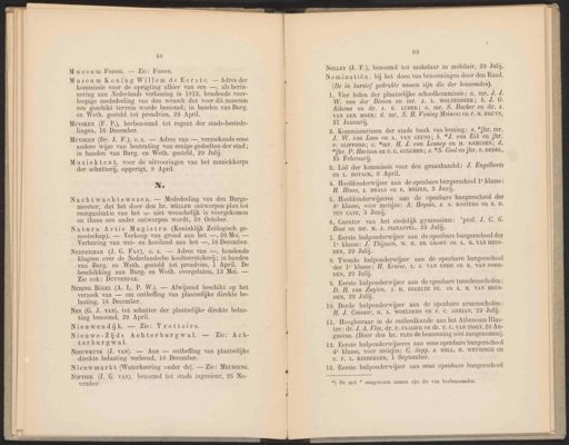 Re 68 Museum Fopor. — Zie: FoDoR. MuysKEN (Dr. J. F‚), €.s. — Adres van —, verzoekende eene andere wijze van bestrating van eenige gedeelten der stad; in handen van Burg. en Weth. gesteld, 29 Julij. Muziektent, voor de uitvoeringen van het muziekkorps der schutterij, opgerigt, 8 April. Ne Nachtwachtswezen. — Mededeeling van den Burge- meester, dat het door den hr. MÜLLER ontworpen plan tot reorganisatie van het — niet wenschelijk is voorgekomen en thans een ander ontworpen wordt, 28 October. NEDDERMAN (J. G. Fay), €. s. — Adres van —, houdende klagten over de Nederlandsche koolteerstokerij; in handen van Burg. en Weth. gesteld tot preadvies, 1 April. De beschikking aan Burg. en Weth. overgelaten, 13 Mei. — Zie ook: DUYVENDAK. 69 Nouier (J. F.), benoemd tot makelaar in mobilair, 29 Julij. Nominatiën, bij het doen van benoemingen door den Raad. a ee ie DEN, 29 Julij. 10. Derde hulponderwijzer aan de openbare armenscholen : H. J. Cossaar, H. A. WOELDERS €en P. C. ADRIAN, 29 Julij. Nieuwendijk. — Zie: Trottoirs 11. Hoogleeraar in de ontleedkunde aan het Atheneum Îllus- Nieuwe-Zids Achtorburawal f tre: dr, J. A. Fles, dr. F. ZAAIJER en dr. N. C. VAN TRIGT, 26 Au- ee ce ehterburgwal — Zie: Ach gustus. (Door den hr. FLEs de benoeming niet aangenomen). terburgwal. | È onder Dd ie : , si 12. Eerste hulponderwijzeres aan eene openbare burgerschoo NE ie GN . Ae DE van plaatselijke 4e klasse, voor meisjes: C. Sepp, J. BOLL, H. WEYTINGI en 1 img verleend, ecember. Cc. F. L. KIRBERGER, l September. I < # rj * 2 a Yi . 3 …. Nieuwmarkt (Waterkeering onder ‘de). Zie: MEURSING. 13. Eerste hulponderwijzer aan eene openbare burgerschool NiFTRrik (J. G. VAN), benoemd tot stads ingenieur, 25 No- vember. *) De met * aangewezen namen zijn die van herbenoemden. lasting, 16 December. Nes (G. J. VAN), tot schatter der plaatselijke direkte belas- ting benoemd, 29 April. A da We ——_— es NL 42 _ Museum Koning Willem de Eerste. — Adres der kommissie voor de oprigting alhier van een —, als herin- nering aan Nederlands verlossing in 1813, houdende voor- loopige mededeeling van den wensch dat voor dit museum een geschikt terrein worde bestemd; in handen van Burg. en Weth. gesteld tot preadvies, 29 April. Natura Artis Magistra (Koninklijk Zoölogisch ge- nootschap). — Verkoop van grond aan het —, 20 Mei. — Verhuring van wei- en hooiland aan het —, 16 December. NERING BöGEL (A. L. P. W.). — Afwijzend beschikt op het verzoek van — om ontheffing van plaatselijke direkte be- (De in kursief gedrukte namen zijn die der benoemden). Muysken (F. P.), herbenoemd tot regent der stads-bestede- lingen, 16 December. 1. Vier leden der plaatselijke schoolkommissie: a. mr, J. J. W. van der Biesen en mr. J. L. WOLTERBEEK; b. J.G. Aikema en dr. 3. E. LUBER; c. mr. S. Backer en dr. J. VAN DER MOER; d. mr. S. H. Vening Meiïnesz en P. H. BRUYN, 21 Januarij, 9. Kommissarissen der stads bank van leening: a. *jhr. mr. J. W. van Loon en A. VAN GEUNs; b. *J. van Eik en jhr. pP. CLIFFORD; c. *mr. H. J. van Lennep en H. RAHUSEN; d. *ihr, P, Hartsen en P. C, GULCHER; e. *S. Cool en jhr. S. DEDEL, J u 25 Februari. 3, Lid der kommissie voor den graanhandel: J. Engelberts en L. HOYACK, 8 April. 4. Hoofdonderwijzer aan de openbare burgerschool t° klasse: H. Hinse, 3. BRALS en E. MEIJER, 3 Junij. 5. Hoofdonderwijzeres aan de openbare burgerschool der 4e klasse, voor meisjes: A. Heynis, J. A. KOSTERS en S. D. TEN CATE, 3 Junij. 6. Curator van het stedelijk gymnasium: ‘prof. J. C. G. Boot en mr. M. J. PIJNAPPEL, 29 Juli. 7. Eerste hulponderwijzer aan de openbare burgerschool der 1e klasse: J. Thijssen, W. H. DE GROOT en A, H. VAN HEUS- DEN, 29 Julij. 8. Tweede hulponderwijzer aan de openbare burgerschool der 1e Klasse: H. Kroese, A. J. VAN ENDE en R. VAN NOOR- DEN, 29 Julij. 9. Eerste hulponderwijzer aan de openbare tusschenscholen : D. H. van Zuylen, 3. HM. EGGELTE PZ. en A. H. VAN HEUS-