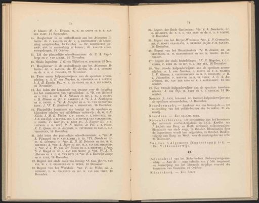 Gebruik tekstcoördinaten Transcriptie 70 4: klasse: M. A. Terwen, W. H. DE GROOT en B. T. VAN DER VLIET, 17 September. 15. Lid der plaatselijke schoolkommissie: dr. C. A. EÉngel- bregt en P. VAN LIMMIK, 25 November. 16. Stads ingenieur: J. G. van Niftrik en W. SPRINGER, 25 Nov. 17. Hoogleeraar in de ontleedkunde aan het Atheneum Il- lustre: dr. F. ZAAUER, dr. W. Berlin, dr. 3. L. DUSSEAU en dr. E. H. G. THIJSSEN, 25 November. 18. Twee eerste hulponderwijzers aan de openbare armen- scholen: a. A. H. van Heusden, U. STROEKER en J. MEEWIS; b. J. H. Eggelte Pz., W. H. DE GROOT en M. N. TEN SELDAM, 25 November. 19. Zes leden der kommissie van bestuur over de inrigting tot het examineren van varenslieden: a. *D. van Ketwich en L. TUK; ©. mr. E. N. Rahusen en mr. J. W, A. DOEFF; c. Q. Blaauw en jhr. P. HARTSEN; d. *J. J. A. Santhagens en R. BARGE; e. *[. A. Bienfait en G. W. VAN BARNEVELD Kooy; f. *F. E. Enschedé en J. BOISSEVAIN, 16 December. 11 24. Regent der Beide Gasthuizen: *dr. J. J. Danckerts, dr. G. HULSHOFF, dr. N. C. C. VAN HEES en dr. G. A. N. ALLEBE, 16 December. 25. Regert van het Burger-Weeshuis: *mr. J. P. Crommelin, mr. F. HOOFT GRAAFLAND, S. RENDORP en jhr. F. H. VAN EYS, 16 December. 26. Regent van het Huiszittenhuis: *J. B. Beuker, CH. LE CHEVALIER, H. M. GILDEMEESTER en mr. D. VISSER, 16 De- cember. 28. Vier tweede hulponderwijzers aan de openbare armen- scholen: a. L. van Noorden, 0. BLINTS en F. D. WATJES; b. F.' Glaaser, J. YSERINKHUYSEN en H. F. KILSDONK; C. H. J. Plasmeijer, P. MOUWER en M. DE VRIES; d. C. A. An- driessen, TH. VAN DER LOOS en A. J. DIEKERHOFF, 16 De- cember. NoorDEN (L. vAn), benoemd tot tweeden hulponderwijzer aan de openbare armenscholen, 16 December. ©. Oefenschool van het Nederlandsch Onderwijzersgenoot- schap. — Aan de — eene subsidie van { 500 toegekend, na verwerping van het hiermede strijdige voorstel der kommissie van financiën, 29 October. 14. Hoogleeraar in de ontleedkunde aan het Atheneum Il- lustre: dr. F. ZAAIJER en dr. P. Q. BRONDGEEST; de benoe- ming aangehouden, 14 October. — Dr. BRONDGEEST ver- zoekt niet in aanmerking te komen; dr. ZAAUER alleen voorgedragen, 28 October. 20. Plaatselijke kommissie van toezigt op de openbare en bijzondere scholen van middelbaar onderwijs: dr. G.A. N. Allebé, J. M. B. Beuker, J. F. BROMS, P. L. DUBOURCQ, mr. J. A. van Eyk, 3. H. FOCK, mr. C. P. HOYNCK VAN PAPENDRECHT, 3. JüGer, P. Keer jr., 3. Kooy JR, J. Kuyper Hz. J.F. LIOTARD, J. H. LUGT, P. N. Muller, D. Pas, 3. 3. POSNO, F. C. Quien, dr. S. Sarphati, N. TETTERODE en PAUL C. VAN VLISSINGEN, 16 December. 27. Regent der stads bestedelingen: *F. P. Muysken, J. C.C. MEIJER, P. KEER JR. en MT. N. J. DEN TEX, 16 December. 29. Een tweede hulponderwijzer aan de openbare tusschen- scholen: J. van Dijk, H. PADT en H. J. COSSAAR, 16 De- cember. Noordermarkt. — Aankoop van een huis op de —, ter uitbreiding van het politie-bureau der 5e sektie, 21 Ja- nuarij. Oliestokerij. — Zie: ROLF. 21. Acht leden der plaatselijke schoolkommissie: a. *mr. M. J. Pijnappel en P. VAN LIMMIK; b. dr. *Th. Davids en dr. W. M. GUNNING; c. *mr. B. H. M. Driessen en mr. H. E. MOLTZER; d. *mr. J. Jäger en mr. M. A. VAN EYK BIJLEVELD; e. *mr. J. J. W. van der Biesen en A. A. BIENFAIT; {. *mr. S. J. Hingst en dr. J. VAN DER MOER; g. *mr, W. A. N. Aberson en A. C. G. VAN DUYL; h. *mr. E. J. Everwijn Lange en P. LUGT, 16 December. Noordzee. — Zie: CALAND, HUET. 22. Regent der stads bank van leening: *S. Cool, jhr. TH. VAN EYS, W. J. E. SMISSAERT en H. LUDEN, 16 December. Novemberfeesten, ter herinnering aan het herwinnen der nationale onafhankelijkheid in 1813. Krediet van f 10,000 aan Burg. en Weth. verleend; volksvermaken; illuminatie van stads wege, 14 October. Tlluminatiën door de ingezetenen wordt hun vrijgelaten, 29 October. Dankbe- tuiging aan Burg. en Weth. voor de maatregelen van orde, 25 November. 23. Regent van het Werkhuis: *mr. F. de Wildt, mr. A. RENDORP, E. W. CRAMERUS en Mr. W. VAN DER VLIET, 16 December. Nut van ’t Algemeen (Maatschappij tot). — Zie: Volksonderwjs.