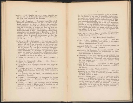 Onderstand (Maximum van den), ingevolge art 25 der wet van 28 Junij 1854 (Staatsblad N°. 100), voor het jaar 1864 vastgesteld, 16 December. Onderwijs (Lager). — Verslag der plaatselijke school- kommissie over den toestand van het — in 1862, bij den Raad ingediend, 29 April. — Missive der plaatselijke schoolkommissie, geleidende het verslag van den toestand van het — in 1862; in handen van Burg. en Weth. ge- steld om ze toe te lichten, 28 October. — Het rapport hierop van Burg. en Weth., houdende eenige aanmerkingen, aangenomen voor kennisgeving, 16 December. — Over de behoefte aan onderwijzend personeel in het Werkhuis, 28 October; hierin is voorzien, 16 December. — Zie: Ar- menscholen, Burgerscholen, Tusschen- scholen. Onderwiijjs (Middelbaar). — De som van f 10,000, als krediet-post, op de begrooting 1864 uitgetrokken 'ten behoeve van het —, na verwerping van het voorstel HES- HUysEN om deze post met f 1 uit te trekken, 29 Octo- ber. — Voorstel VAN CAPPELLE tot benoeming eener raads- kommissie, ter regeling van het —; aangehouden, 29 Oc- tober; verworpen, 25 November. — Plaatselijke kom- missie van toezigt op de openbare en bijzondere ‘scholen van — ingesteld, 25 November; deze kommissie benoemd, 15 December. — Zie: Kommissiën. Onderwiijs (Hooger). — Zie: Athenaeum Il! lustre. en kas van den —, 4 Februarij, 13 Mei, 19 Augustus, 28 October. Ontvangers (Sub-) der plaatselijke direkte belasting benoemd, 29 April. — Klagten over de inrigting van het kantoor van een hunner. Zie: MERENS. Openbaarheid. — Voorstel BUCHNER C. $, strekkende 13 tot het geven van meer voorafgaande — aan de voordrag- ten betreffende in den Raad te behandelen onderwerpen, ten einde voor belanghebbenden de gelegenheid te openen, hunne belangen vooraf aan het gemeentebestuur te kun- nen mededeelen; in handen eener kommissie gesteld, 4 Fe- bruarij. — Overeenkomstig het advies dezer kommissie, besloten: a. tot eene drieledige openbaarmaking : algemeene kennisgeving van de ingekomen stukken; openbaarmaking van de voorstellen zelven; ter lezing legging en verkrijg- baarstelling; b. tot het wijzigen van het reglement van orde in dien zin, 8 April. Opstau (H. J. van). — Aan — ontheffing van plaatselijke direkte belasting verleend, 13 Mei. Oranjefeest. — Zie: November-feesten. Oud-lid der Staten-Generaal. — Brief van een — over de deelneming door de stad in de A4mster- damsche kanaalmaatschappij, 3 Jani. Ouderkerk (Bolwerk). — Over den bouw van kazernen op het —. Zie: Kazernen, SARPHATI. OuDERMEULEN (De Staatsraad F. VAN DER), raadslid. — Lid en voorzitter der kommissie van voorbereiding van finan- ciële onderwerpen, 1 September. Oudeschans. — Adres van mr. A. J. B. STOFFELS C. S., houdende bezwaren tegen het geven van uitvoering aan het raadsbesluit van 2 November 1853, tot het vervangen der twee bruggen over de — door ééne; afwijzend hierop beschikt, 16 December. Onderwiijs (Geneeskundig). — Zie: Genees- kundig onderwijs. Oude-Ziijds Heeren-Logement. — Het — nog voor een jaar verhuurd aan P. L. POSTHUMUS VOOr { 3600, 14 October. Ongeteekend en ongezegeld adres ter zijde gelegd, 21 Januarij. OursHooRN (C.). — Zie: Waterleiding. Oninbare posten. — Staten van — wegens de plaat- selijke direkte belasting, dienst 18611862, vastgesteld, 29 Juli. Overtoom. — Adres van bewoners der — stille zijde, houdende klagten over de bestrating; 1n handen van Burg. en Weth. gesteld, 1 April. Onteigening van een perceel, ter verbreeding van de Muntsluis, 4 Februarij. Overtoomsche schutsluis. — Adres van D. JONK- HEER c. s., te Hillegom, verzoekende des nachts door de _— te kunnen varen, ten einde met hunne bloemen en planten vroegtijdig ter markt te kunnen zijn; in handen van Burg. en Weth. gesteld tot preadvies, 13 Junij. — Overgegaan tot de orde van den dag, daar de adressanten zelven de ongegrondheid hunner klagten erkennen, 14 October. Ontvanger (Gemeente-). — Opneming der boeken