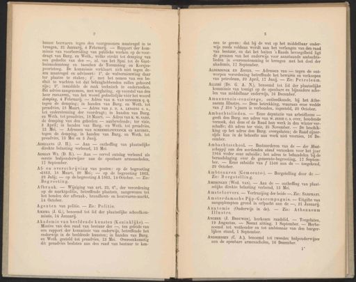 hunne bezwaren tegen den voorgenomen maatregel in te brengen, 21 Januarij, 4 Februarij. — Rapport der kom- missie van voorbereiding van publieke werken op de voor- dragt van Burg. en Weth, welke strekt tot demping van een gedeelte van den —, nl. van het Spui tot de Gast- huismolensteeg en tusschen de Torensteeg en Korsjes- poortsteeg. De kommissie verklaart zich niet tegen ‘de- zen maatregel en adviseert: 1°. de walvernieuwing daar ter plaatse te staken; 2’. met het nemen van een be- sluit te wachten tot dat belanghebbenden zullen gehoord zijn; 38°. inmiddels de zaak technisch te onderzoeken. Dit advies aangenomen, met weglating, op voorstel van den heer PIJNAPPEL, van het woord gedeeltelijke vóór het woord demping, 4 Februarij. — Adres van H. VAN SONSBEEK q.9. tegen de demping; in handen van Burg. en Weth. tot preadvies, 18 Maart. — Adres van J. D. A. LENSING C. s, tot ondersteuning der voordragt; in handen van Burg. en Weth. tot preadvies, 18 Maart. — Adres van K. w. SARS, de demping van den geheelen —- aanbevelende; ter visie, 8 April; in handen van Burg. en Weth. tot preadvies, 13 Mei. — Adressen van SCHIMMELPENNINCK en KRUIMEL, tegen de demping, in handen van Burg. en Weth. tot preadvies, 13 Mei en 3 Junij. nen te geven: dat bij de wet op het middelbaar onder- wijs reeds voldaan wordt aan het verlangen van den raad van bestuur, en dat het buiten 's Raads bevoegdheid ligt de grenzen van het onderwijs voor aanstaande ambachts- lieden in overeenstemming te brengen met het doel der akademie, 17 September. ALBERDINGK EN ZONEN. — Adressen van — tegen de ont- worpen verordening betreffende het bewaren en verkoopen van petroleum, 29 April, 17 Junij. — Zie: Petroleum. ALLEBE (Dr. G. A. N.), benoemd tot lid der plaatselijke kommissie van toezigt op de openbare en bijzondere scho- len van middelbaar onderwijs, 16 December. Amanuensis-concierge, ontleedkunde, bij het Athe- naeum Illustre. — Deze betrekking, waaraan’ eene wedde van f 250 ’sjaars is verbonden, ingesteld, 28 October. Ambachtslieden. — Eene deputatie van arbeidlooze — geeft den Burg. een adres van W. JESSE c. s. over, houdende verzoek, dat deze of de Raad hun werk in den winter ver- schaffe; dit adres ter visie, 25 November. — De beschik- king op het adres den Burg. overgelaten; de Raad zijner- zijds kan in de behoefte aan werk niet voorzien, 16 De- cember. Ambachtsschool. — Bestuurderen van de — der Maat- schappij van den werkenden stand verzoeken voor het jaar 1864 weder eene subsidie; het adres te behandelen bij de beraadslaging over de gemeente-begrooting, 17 Septem- ber. — Eene subsidie van f 1500 aan de — toegekend, 29 October. $ De! EN Af- en overschrijving van posten: op de begrooting : f ET | en 1862, 18 Maart, ‘20 Mei; — op de begrooting 1863, | Ambtenaren (Gemeente). Borgstelling door de à en : : Zie: Borgstelling. 29 Juli; — op de begrooting A 1863, 14 October. — Zie: ie) in : bd p AMERINGEN (Wed. VAN). — Aan de — ontheffing van plaat- selijke direkte belasting verleend, 13 Mei. Amsteloevers. — Verfraaijing der beide —, Zie: SARPHATT, Amsterdamsche Pij p-Gascompagnie. — Uitgifte van aangeplempten grond in erfpacht aan de —, 21 Januarij. Anatomie (Onderwijs in de). — Zie: Athenaeum Illustre. ANCHER (J. Brouwer), herkozen raadslid. — Toegelaten, 19 Augustus. — Neemt zitting, 1 September. — ‘Herbe. noemd tot wethouder en tot ambtenaar van den burger- lijken stand, 1 September. ANDRIESSEN (C. A.), benoemd tot tweeden hulponderwijzer aan de openbare armenscholen, 16 December. Begrooting. 1 „ApriAANs (J. H.). — Aan — ontheffing van plaatselijke direkte belasting verleend, 13 Mei. Afbraak. — Wijziging van art. 23, 6°., der verordening op de marktpolitie, betreffende plaatsen, aangewezen tot het houden der afbraak-, brandhout- en houtwaren-markt, 14 October. ADRIAN Wz. (D. B.). — Aan — eervol ontslag verleend als eerste hulponderwijzer aan de openbare armenscholen, 17 September. Agenten van politie. — Zie: Politie. Aikema (J. G.), benoemd tot lid der plaatselijke schoolkom- missie, 14 Jannarij. Akademie van beeldende kunsten (Koninklijke). — Missive van den raad van bestuur der —, ten geleide van een rapport der kommissie van onderwijs, betreffende het onderwijs in de beeldende kunsten; in handen van Burg. en Weth. gesteld tot preadvies, 13 Mei. Overeenkomstig dit preadvies besloten aan den raad van bestuur te ken-
