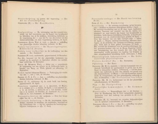 74 Overschriijving op posten der begrooting. Af- en overschrijving. OvVERWATER (H.). — Zie: Handkarren. Pp. Paalgording. — Na verwerping van het voorstel PIJN- APPEL tot het renvoyeren aan de kamer van koophandel en fabrieken van al de stukken, betrekking hebbende op de wegruiming der — aan het Y, van den ooster- tot den wester-afsluitdijk, tot deze wegruiming besloten, 29 April. PARREREN (W. vAn), nachtwacht, gepensioneerd, 16 December. Pas (D.), benoemd tot lid der plaatselijke kommissie van toezigt op de openbare en bijzondere scholen van middel- baar onderwijs, 16 December. Pedel van het Atheneum Illustre. — Verhooging der wedde van den —, met f 100, 28 October. Penis (C. J.), ambtenaar bij de stads bank van leening, gepensioneerd, 29 April. Pensioen toegekend aan: J. E. BELLETIER, 18 Maart; G. S. GERKES en C. J. PENNIS, 29 April; J. VAN LEEUWEN JZ, J. W. DE RUYTER, J. HOOGLAND en L. VAN BUUREN, Vrouw van P. H. ELSMAN, 14 October; W. HARTKAMP PZ. J. G. VAN VEEN en W. VAN PARREREN, 16 December. Perceptie-kosten der accijnsen. — Over het hooge cijfer van de —, 28 October. Personele belasting. — De hh. WOLTERBEEK, JÄGER, MOMMA, BÜCHNER en RIJNDERS, als raadsleden, benoemd om den kontròleurs der — bij het opmaken der beschrijvings- biljetten behulpzaam te zijn, 17 Junij. Ï 15 Personele toelage. — Zie: Bank van leening, Bode. PADDENBURG (Erven Wed. A. van). — Aan de — ontheffing van plaatselijke direkte belasting verleend, 13 Mei. PascaL (M. Mongeym, Wed.). — Adres van — verzoekende de wegneming van een urinoir op de Geldersche kade; in handen van Burg. en Weth. gesteld tot afdoening, 17 September. Peutzer (C. N. A. F.). — Aan — ontheffing van plaatselijke direkte belasting verleend, 13 Mei. Pere (J. C.). — Zie: Raamsteeg. Paleis van justitie. — Zie: Kantongeregten, Bibliotheek (Stads). Petroleum. — De ontwerp-verordening op het bewaren van — drukken en algemeen verkrijgbaar stellen, 8 April. — De ontwerp-verordening met al de daar tegen ingekomen adressen, benevens een voorstel van den hr. TEDING VAN BERKHOUT en eene missive der kamer van koophandel en fabrieken, beide daarop betrekking hebbende, in handen der kommissie voor de strafverordeningen gesteld, 29 April. — Over het bouwen van een rijks entrepòt voor — alhier, 29 April. — Nieuwe ontwerp-verordenimg; adressen daar- tegen; al de artikelen der ontwerp-verordening aangeno- men, doch deze in haar geheel verworpen, 17 Junij. — Het voorstel der kommissie voor de strafverordeningen, dat het gemeente-bestuur zich tot de Hooge Regering wende, met kennisgeving van den wensch dat van wege haar maatregelen worde genomen tot regeling van hetgeen op deze aangelegenheid betrekking heeft, verworpen, 1 Juli. Paleis voor volksvliijt en de verfraaijing van den omtrek. — Zie: SARPHATI. Physiologisch laboratorium. — Zie: Labo: ratorium physiologicum. Pieters-kerkhof (St.). — Zie: BRINKBOER. Pijlsteeg. — Zie: Euas. PinaPprL (Mr. M. J.), raadslid. — Lid der kommissie van on- derzoek betreffende de openbaarheid te geven aan in den Raad te behandelen stukken, 4 Februarij. — Lid der kom- missie van onderzoek in zake den afstand van grond voor den kazernenbouw, 18 Maart. — Lid der kommissie betref- fende de reorganisatie van het geneeskundig onderwijs al- hier, 16 December. — Zie: Voorstellen van leden. PysnaPPEL (Mr. M. J.), herbenoemd tot lid der plaatselijke schoolkommissie, 16 December. Pijp. — Zie: Paalgording. Plaatselijke kommandant. — Zie: Komman- dant. Plantaadje. — Besproeijingen der —, 28 October. — Over de handhaving der in 1858 vastgestelde algemeene beginselen voor den verkoop van gronden in de —, 25 November. Pasveer (H. J.), benoemd tot tweeden hulponderwijzer aan de openbare armenscholen, 16 December. PorstkoKe (Erven J. F.). — Aan de — ontheffing van plaat- selijke direkte belasting verleend, 13 Mei.