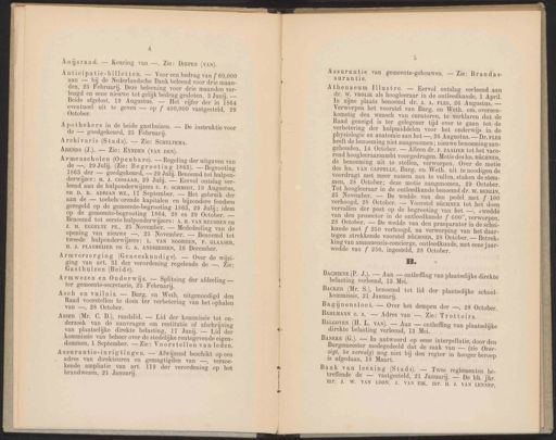 4 2 Aniijszaad. — Keuring van —. Zie: DIEPEN (VAN). Assurantie van gemeente-gebouwen. — Zie: Brandas- Athenaeum Illustre. — Eervol ontslag verleend aan dr. W. VROLIK als hoogleeraar in de ontleedkunde, 1 April. In zijne plaats benoemd dr. 3. A. FLES, 26 Augustus. — Verworpen het voorstel van Burg. en Weth. om, overeen- komstig den wensch van curatoren, te verklaren dat. de Raad geneigd is ter gelegener tjd over te gaan tot de verbetering der hulpmiddelen voor het onderwijs in de physiologie en anatomie aan het —, 26 Augustus. — Dr. FLES heeft de benoeming niet aangenomen ; nieuwe benoeming aan- gehouden, 14 October. — Alleen dr. F. ZAAIJER tot het vaee- rend hoogleeraarsambt voorgedragen. Motie des hn. BÜCHNER, Apothekers in de beide gasthuizen. — De instruktie voor de — goedgekeurd, 25 Februarij. leend’ aan de hulponderwijzers u.’F. scHspr, 19 Augustus, Tot hoogleeraar in de ontleedkunde benoemd dr. w. BERLIN, en D. B. ADRIAN WZ., 17 September. — Het gebruik der aan de — toebehcorende kapitalen en bijzondere fondsen geregeld op de gemeente-begrooting 1863, 29 Julij; idem op de gemeente-begrooting 1864, 28 en 29 October, — Benoemd tot eerste hulponderwijzers: A. H. VAN HEUSDEN en J. H. EGGELTE PZ., 25 November. — Mededeeling van de opening van nieuwe —, 25 November. — Benoemd tot tweede hulponderwijzers: L. VAN NOORDEN, F. GLAASER, H. J. PLASMEIJER en C. A. ANDRIESSEN, 16 December. 25 November. — De wedde van den pedel met f 100 verhoogd, 28 October. — Voorstel BÜCHNER tot het doen vervallen der post op de begrooting van het —, „wedde van den prosector in de ontleedkunde Í 600”, verworpen, 28 October. — De wedde van den praeparator in de schei- kunde met f 250 verhoogd, na verwerping van het daar- tegen strekkende voorstel BÜCHNER, 28 October. — Betrek. king van amanuensis-concierge, ontleedkunde, met eene jaar- wedde van f 250, ingesteld, 28 October. Armverzorging (Geneeskundige). — Over de Wijzi- B. van —, 28 October. BAHLMANN c. s. — Adres van —. Zie: Trottoirs. Asser (Mr. C. D.), raadslid. — Lid der kommissie tot on- BALGOYEN (H. L. VAN). == Aan er ontheffing van plaatselijke derzoek van de aanvragen om restitutie of afschrijving direkte belasting verleend, 13 Mei. van plaatselijke direkte belasting, 17 Junij. — Lid der ij í ' kommissie van beheer over de stedelijke rentegevende eigen- BANEKE (G.). — In antwoord op eene mterpellatie, door den « Burgemeester medegedeeld dat de zaak van —. (zie Over- dommen, 1 September. — Zie: Voorstellen van leden. á ! vc ei Afwij beschik z1gt, be vervolg) nog niet bij den regter in hooger beroep Assurantie-inrigtingen. — wijzend beschikt op een is afgedaan, 18 Maart. adres van direkteuren en gemagtigden van —, verzoe- kende ampliatie van art. 119 der verordening op het brandwezen, 21 Januarij. Bank van leening (Stads). — Twee reglementen be. treffende de — vastgesteld, 21 Januarij. — De hh. Jhr. Mr. J. W. VAN LOON, J. VAN EIK, MF. H. J. VAN LENNEP, Anticipatie-billetten. — Vooreen bedrag van { 60,000 surantie. aan — bij de Nederlandsche Bank beleend voor drie maan- den, 25 Februarij. Deze beleening voor drie maanden ver- lengd en eene nieuwe tot gelijk bedrag gesloten, 3 Junij. — Beide afgelost, 19 Augustus. — Het cijfer der in 1864 eventueel uit te geven — op f 400,000 vastgesteld, 29 October. Armenscholen (Openbare). — Regeling der uitgaven van de benoeming uit te stellen, verworpen. Over de motie de —, 29 Julij. (Zie: Begrooting 1868). — Begrooting des hn. VAN CAPPELLE, Burg. en Weth. uit te noodigen de 1863 der — goedgekeurd, 99 Julij. Benoemd tot hulpon- voordragt met meer namen aan te vullen, staken de stem- derwijzer: H. J. COSSAAR, 29 Julij. — Eervol ontslag ver- men, 28 October; deze motie aangenomen, 29 October. Archivaris (Stads). — Zie: SCHELTEMA. ging van art. 81 der verordening regelende de —. Zie: ARENDS (J.). — Zie: EYNDEN (VAN DEN). Gasthuizen (Beide). | BACHIENE (P. J.). — Aan — ontheffing van plaatselijke direkte Armwezen en Onderwijs. — Splitsing der afdeeling — belasting verleend, 13 Mei. ter gemeente-secretarie, 25 Februarij. BACKER (Mr. S.), benoemd tot lid der plaatselijke school- Asch en vuilnis. — Burg. en Weth. uitgenoodigd den Kommissie, 21 Januari. Raad voorstellen te doen ter verbetering van het ophalen Bagiijnensloot. — Over het dempen der —, 28 October.