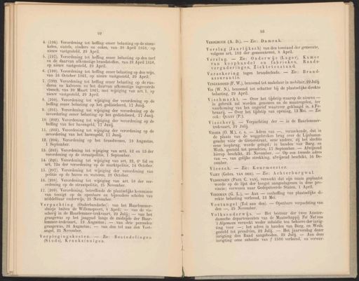 92 4. (196). Verordeni effi i ox jv lening tot heffing eener belasting op de steenolen, sintels, cinders en cokes, van 28 April 1858, « nieuw vastgesteld, 29 April. ® 5. (197). Verordening [ling i (197) ning tot heffing eener belasting op den turf en de daarv an afkon 3 3 NS} 5 € Ot lt 5 d Suge br al d st ff \St1 1 olien, van 28 \ T l 1858 op nieuw vastgesteld, 29 April. . (198). Verordening tot heffin i g eener belasting op den wij van 16 October 1861, op nieuw Vastgesteld an ee” 1. (199). Verordeni i : ning tot ener belasti de Pein | heffing eener belasting op de runINE ) ren en het daarvan afkomstige ingevoerde leesch, van 20 Maart 1861, met wijziging van art. 1, 0 nieuw vastgesteld, 29 April. 2 Ea? (200). Verordening jzigi : ing t 7 r verordeni Nea Ven) ve je fe verordening op de dn Mi g op het gedisteleerd, 17 Junij. : ). Verordening ijzig rordeni ed tot wijziging der verordening op de g eener belasting op het gedisteleerd, 17 Junij 10. (202). Verordeni ijzioi | ; : ening tot wijziging der verordeni Si enias ging der verordening op de fing van het havengeld, °17 Junij. 59 1. (707), Verordening tot wijziging der verordening op de invordering van het havengeld, 17 Junij ? 12, (204). Verordeni ì y : ej dening op het brandwezen, 19 Augustus, BON) Verordening tot wijziging van artt. 52 en 58 der erordening op de straatpolitie, 1 September 14. (206). Verordening ijzig! | N on ie Me tot wijziging van art. 28, 6° lid en : r verordening op de marktpolitie, 14 October 15. (207). Verordening ijzigi . f O 7 = A Ah x a NI tot w yziging der verordening van I p de haven en wateren, 28 October. 16. U) Verordening tot wijziging van art. 58 der verordening op de straatpolitie, 25 November 5 orden 7 A ee ere de plaatselijke kommissie ’zigt op de openbare en bijzondere 7 e 7 3 Sct Ve middelbaar onderwijs, 25 Neber! Pen V o pac hting (Onderhandsche): van het Haarlemmersluisje buiten de Willemspoort, 8 April; — v: i he A6 Ha: ‚ S ApTII; van de visscherij in de Haarlemmer-trekvaart, 29 Julij; — van het 93 Verscauur (A. D.). — Zie: Damrak. Verslag (Jaarlijksch) vanden toestand der gemeente, volgens art. 182 der gemeentewet, 8 April. Verslag. — Zie: Onderwijs (Lager), Kamer van koophandel en fabrieken, Raadsvergaderingen, Ziektetoestand. Voetangel (Tol aan den). — Openbare verpachting van den —, 25 November. WIE AW J 3 1 4 4] grasgewas op het jaagpad langs de zuidzijde der Haarlemmer-trekvaart, 19 Augustus; — van dri Ad g : n drie perceelen grasgewas, í ugustus; — van den tol aan den Voetangel, 25 November. Äë Verzekering tegen brandschade. — Zie: Brandassurantie. Volksonderwijs. — Het bestuur der twee Amsterdamsche departementen van de Maatschappij Tot Nut van ‘t Algemeen verzoekt weder subsidie ten behoeve der inrigting voor —; het adres in handen van Burg. en Weth. gesteld tot preadvies, 29 Julij. — Het jaarverslag dezer inrigting den Raad aangeboden, 29 Julij. — Aan deze inrigting eene subsidie van f 1500 verleend, na verwerVerplegings ste Zi Í mi 4 gskosten. — Zie: Bestedelingen (Stads), Krankzinnigen. VINGERHOED (F. W.), benoemd tot makelaar in mobilair, 29 Juli. Vis (W. N.), benoemd tot schatter bij de plaatselijke direkte belasting, 29 April. Vischmarkt. — Over het tijdstip waarop de nieuwe — in gebruik zal worden genomen en de maatregelen, ter voorkoming van het ongerief waarover geklaagd is, 4 Februarij. — Over het tijdstip van opening, 13 Mei. — Zie ook: QUANT (P.). Visscherij. — Verpachting der — in de Haarlemmertrekvaart, 29 Juli]. Visser (O. M.), ce. s. — Adres van —, verzoekende, dat in de plaats van de weggebroken brug over de Lijnbaansgracht vóór de Gieterstraat, eene andere, zij het slechts eene loopbrug, worde gelegd; in handen van Burg. en Weth, gesteld tot preadvies, 17 September. — Afwijzend hierop beschikt, 25 November. — Op een tweede adres van —, van gelijke strekking, afwijzend beschikt, 16 December. Vleesch. — Zie: Keurmeester, Vuer (Gebrs. VAN DER). — Zie: Ac hterburgwal VussinGEN (PauL C. VAN), verzoekt dat zijn naam geplaatst worde op de lijst der hoogst aangeslagenen in deze provincie; verwezen naar Gedeputeerde Staten, 1 April. Voerman (G. L.), — Aan — ontheffing van plaatselijke direkte belasting verleend, 18 Mei.