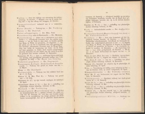 98 Wallen. — Over het tijdstip van uitvoering der walver- nieuwing, 28 October. — Klagten over de te sterke hel- ling der — bij den afloop der bruggen, 28 October. Warmoeziersland verhuurd aan H. G. SCHELTEMA, 29 Juli. Water (Stads). — Verkoop van —. Zie: Verkoop. Water. — Zie: Damrak. Water-aftappingen. — Zie: Maas, Venlo. Waterkeering onder de Nieuwmarkt. — Zie: MEURSING. Waterleiding. — Adres van A. HOLTZMANN en C. OUTS- HOORN Cc. s., verzoekende koncessie voor den aanleg eener nieuwe — uit de Vecht in deze stad; in handen gesteld van Burg. en Weth, tot preadvies, 19 Augustus. — Op dit adres, zoo als het is ingediend, kan niet gunstig wor- den beschikt; adressanten verwezen naar de Hooge Rege- ring, aan welke de vergunning om water uit de Vecht tot deze gemeente te leiden moet worden aangevraagd, alvorens koncessie tot het leiden van dit water in en door de gemeente kan worden verleend, 17 September. 99 berusten, 21 Januari. — Afwijzend beschikt op een adres van kolonisten, houdende verzoek, dat de Raad door gel- delijke bijdragen bewerke dat zij in de kolonie kunnen blijven, 4 Februarij. WeirrER (A. W. J.). — Aan — ontheffing van plaatselijke direkte belasting verleend, 13 Mei. Werk. — Ambachtslieden zonder —. Zie: Ambachts- lieden. Wiet (D. J.). — Aan — ontheffing van plaatselijke direkte belasting verleend, 13 Mei. WINKEL (J. TE). — Aan — ontheffing van plaatselijke direkte belasting verleend, 13 Mei. Wittenburgerstraat (Kleine). — Aankoop van 1 %* Wepprponr (W. T.). — Aan —, ambtenaar bij de stads bank van leening, eene jaarlijksche personele toelage van f 200 toegekend, 29 Jul. — Zie: Bank van leening. Werkenden Stand (Maatschappij van den). — Zie: Ambachtsschool Wirmonpr (P.). — Op het verzoek van —, om ontheffing van plaatselijke direkte belasting, afwijzend beschikt, 17 Junij. Weduwen-gagement. — Zie: Gagement. Werkhuis. — Het — door eene kommissie uit het da- gelijksch bestuur bezocht, 28 October. — Missive der plaatselijke schoolkommissie, betreffende de bestaande be- hoefte aan onderwijzend personeel in het —; in handen van Burg. en Weth. om regenten te hooren en den Raad te dienen tot preadvies, 28 October. — In voormelde be- hoefte is voorzien, 16 December. — De begrooting van het — voor 1864 goedgekeurd, 29 October. — De hr. mr. F. DE WILDT herbenoemd tot regent van het —, 16 December. Weesjongens:Kollegie (Nederlandsch-Israelie- tisch). — Verkoop van grond en water aan het —, 18 Maart. Weser EN zoon (Wed. JAN vAn). — Resiliatie van een huur- kontrakt met de —, wegens een steiger, 14 October. West (Erven F. van). — Aan de ontheffing van plaat- Weesp. — Zie: Zandpad. selijke direkte belasting verleend. 16 December. WieanD (C.), benoemd tot schatter bij de plaatselijke di- rekte belasting, 29 April. Weesperzijde. — Verkoop van vier stukken land aan de —, 17 Jun]. Wijn. — Verordening tot heffing eener belasting op den —, van 16 October 1861, op nieuw vastgesteld, 29 April. Wiijngaardstraatje. — Zie: Publieke vrouwen. WiLpr (Mr. F. DE), herbenoemd tot regent van het Werk- Wreean (C. M. Mey, Wed. G.). — Verkoop van grond aan —, 29 Juli. huis, 16 December. Willemspoort. — Openbare verkoop van stads grond buiten de —, 21 January. WEIJERMAN Jr. (J.), op zijn verzoek ontslagen als makelaar, 29 April. Wreeeraorst (Erven J. L.). — Aan de — ontheffing van plaatselijke direkte belasting verleend, 18 Mei. Weiland — Zie: Verhuring. Weldadigheid (Maatschappij van). — Het door de kommissarissen der — gedane voorstel (zie vijfde ver- volg van dit Overzigt, blz. 112) kan niet worden aange- nomen; is de verwijdering van eenige gezinnen uit de ko- loniën onvermijdelijk, dan zal de gemeente daarin moeten