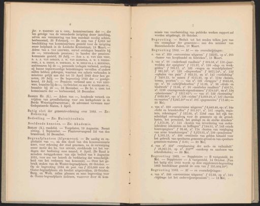 6 jhr. P. HARTSEN en s. COOL, kommissarissen der —, die ten gevolge van de veranderde inrigting dezer instelling, zelven een vernieuwing van hun mandaat noodig achten, herbenoemd, 25 Februari. — De som van f 6,050 ter beschikking van kommissarissen gesteld voor de inrigting eener hulpbank in de Leidsche Kruisstraat, 18 Maart. — Adres van J. VAN LEEUWEN, eervol ontslagen beambte bij de —, verzoekende pensioen; in handen der pensioen- kommissie gesteld, 29 Julij. — Aan A. H. VAN DER VEGT, D. A. A. VAN SORGEN, J. W. VAN GLINSTRA, D. W. T. WEDDE- POHL, J. G. DROST, P. TEEMANS, H. W. ZEELT en J. C. HENNINGS, ambtenaren bij de —, personele toelagen verleend, zoolang zij hunne tegenwoordige betrekkingen vervullen of andere zullen hebben gekregen, waaraan een salaris verbonden is minstens gelijk aan dat tot 15 April 1863 door hen ge- noten, 29 Julij. — De begrooting 1863 der — goedge- keurd, 29 Julij. — Pensioen verleend aan: J. VAN LEEU- WEN, beambte bij de —, 14 October, en aan W. HARTKAMP PZ, beambte bij de —, 16 December. — De hr. s. COOL tot kommissaris der — herbenoemd, 16 December. BARGER Hz. (G.). — Adres van —, houdende verzoek om vrijdom van grondbelasting voor een kerkgebouw in de Derde Weteringdwarsstraat; de adressant verwezen naar Gedeputeerde Staten, 1 April. Batig slot der gemeente-rekening over 1862. — Zie: Rekening. Bedeeling. — Zie: Huiszittenhuis. Beeldende kunsten. — Zie: Akademie. BEEL00 (A.), raadslid. — Toegelaten, 19 Augustus. Neemt zitting, 1 September. — Plaatsvervangend lid van den brandraad, 16 December. Begraafplaatsen (Algemeene). — De aanleg en ex- ploitatie van —, na den dood van den koneessionnaris KOOY, voor rekening der stad genomen, na de verwerping eener motie des hn. VAN LENNEP, strekkende tot het ver- dagen der beslissing eene maand, 8 April. (De Raad is mitsdien teruggekomen van zijn besluit van 8 Augustus 1855, voor zoo ver betreft de verklaring der wenschelijk- heid van het verleenen van koncessie). — Over het ge- bruik maken van de Wester-begraafplaats, 29 October. — Op de begrooting 1864 de post van f 210,000 voor de Ooster-begraafplaats als krediet uitgetrokken, 29 October. Burg. en Weth. zullen plannen en eene begrooting voor de Ooster-begraafplaats indienen, waarover door de kom- 1 missie van voorbereiding van publieke werken rapport zal worden uitgebragt, 29 October. Begrooting 1862. — Af — en- overschrijvingen: a. van n°. 239 „onvoorziene uitgaven” f 738.61, op n°. 205 „kamer van koophandel en fabrieken”, 18 Maart. b. van n°. 98 „onderhoud raadhuis” f 889.56, n°. 116 »jaar- wedden der opzigters” f 171.97, n°. 120 zdag- en week- gelden” f 700.17, n°. 123 „wegen en wandelplaatsen” f 861.165, n°. 128 »diepwerken” f 3077.745, n°. 182 “ophalen van puin” f 958.15, en n°. 147 sverlichting” Í 1458.15, te zamen f 8111.91, op n°. 1194 „huizen, torens, poorten”; — van n°. 195 bruggen” f 256508, op: n°. 95 sschrijfbehoeften” f 51.20, n°. 96 „druk- en bindwerk” f 73.36, n°. 99 „meubelen raadhuis” f 458.78, n°. 119% zrentegevende eigendommen” f 870.525, en n°. 124 ”plantsoenen” {f 1317.615; — van n°. 122 sbestrating” Í 5933.965, op: n°. 126 sriolen” {3,669.28, n°. 127 =havens en vaarten” f 2,247.285 en n°. 201 zgagementen” f 17.40; — 20 Mei; Begrooting 1863. — Suppletoire — B vastgesteld, 20 Mei. — Suppletoire — A vastgesteld, 14 October. (Van het batig slot 1862 wordt op deze supplement-begrooting 1863 beschikbaar gesteld de som van { 155,404.105) J Begrooting 1863. — Af — en overschrijvingen: a. van n°. 240 sonvoorziene uitgaven” f 57.33, op n°. 169 “bijdrage tot het onderwijzerspensioen”; — 18 Mei; Begrooting. — Besluit tot het zenden telken jare van een exnmplaar der gemeente— aan den minister van Binnenlandsche Zaken, 18 Maart. . van n°. 239 zonvoorziene uitgaven” f 6,449.40, op: n°. 94a "licht en brandstoffen” f 385.915, n°. 107 zszegels, regis- ters, rekeningen” f 137.08, n°. 110d zaan het rijk ver- schuldigd ontvangloon voor de gemeente op de ‘grond- lasten, het personeel, het geslagt en de sterke dranken” f 1,373.26, n°. 115 „kosten van invordering van onder- scheidene inkomsten en heffingen” f 144.51, n°. 142 „stads bouwopzigters” f 26.46, n°. 174 „kosten van verpleging van arme krankzinnigen” { 3,279.01, n°. 199 „pensioenen” f 110112, n°. 299 „restitutie van gelden betaald voor het gebruik van openbaren gemeente-grond en van openbare gemeente-wateren f 2.05; — 20 Mei; d. van n°. 232’ „verplaatsing der asch- en vuilnisbelt” f 28,967.78, op n°. 232** „aankoop en aanbouw van schoollokalen; — 20 Mei.