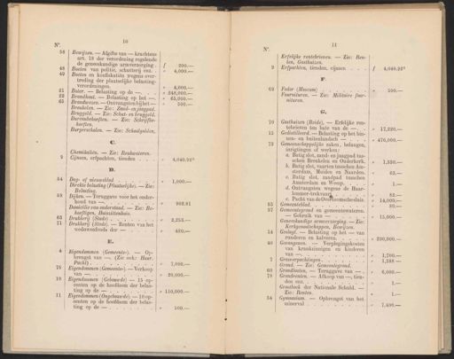 10 Bewijzen. — Afgifte van — krachtens art. 18 der verordening regelende de geneeskundige armverzorging . Boeten en konfiskatiën wegens over- | treding der plaatselijke belasting- | verordeningen. Boter. — Belasting op de —. Brandhout. — Belasting op het — 11 Erfelijke rentebrieven. — Zie: Ren- ten, Gasthuizen. Erfpachten, tienden, cijnsen F. Fodor (Museum) Fournituren. — Zie: Militaire four- mturen. 4,040.925 Brandwezen. — Ontvangsten bijhet— | Breukelen. — Zie: Zand- en jaagpad. | G. | Bruggeld. — Zie: Schut- en bruggeld. | | Bureaubehoeften. — Zie: Schrijfbe- | Gasthuizen (Beide), — Erfelijke ren- | _ hoeften. | tebrieven ten bate van de —.1, 17,220.— | Burgerscholen. — Zie: Schoolgelden, | Gedistilleerd. — Belasting op het bin- SES = ss PB Ä ee | | | | | Chemikaliën. — Zie: Reukwateren. id jnsen, erfpachten, tienden . Dag- of nieuwsblad … sia Direkte belasting (Plaatselijke). — Zie: Belasting. Dijken. — Teruggave voor het onder- houd van —. EN Domicilie van onderstand. — Zie: Be- hoeftigen, Huiszittenhuis. | Drulker Stel) Drukkerij (Stads). — Renten van het | weduwenfonds der — ii | E. | | Eigendommen (Gemeente-). — Op- | brengst van —. (Zie ook: Huur, | ee 4,040.925 7,000.— 20,000.— 110,000.— 500.— | | nen- en buitenlandsch — | C. | Gemeenschappelijke zaken , belangen, | inrigtingen of werken: a. Batig slot, zand- en jaagpad tus- | schen Breukelen en Ouderkerk. b. Batig slot, vaarten tusschen Am- | 416,000.— 1,830.— sterdam, Muiden en Naarden. | , c‚ Batig slot, zandpad tusschen | Amsterdam en Weesp. d. Ontvangsten wegens de Haar- | ele ie e. Pacht van de Overtoomschesluis. Gemeenteblad. Gemeentegrond en gemeentewateren. | — Gebruik van — ie Geneeskundige armverzorging. — Zie: Kerkgenootschappen, Bewijzen. Geslagt. Belasting op het — van runderen en kalveren. sij Gevangenen. — Verplegingskosten van krankzinnigen en kinderen van —. al a Grasverpachtingen . ee Grond. — Zie: Gemeentegrond. Grondlasten, — Teruggave van —. Grondrenten. — A fkoop van —, tien- den enz. EE Grootboek der Nationale Schuld. — Zie: Renten. | Gymnasium. — Opbrengst van het minerval . 290,000.— 1,700.— 1,388 — 6,000.— Boeten van politie, schutterij enz. Eigendommen (Gemeente-). — Verkoop | Van re ee ae Le Eigendommen (Gebouwde) — 15 op- | centen op de hoofdsom der belas- ing op de — 4 1] Eigendommen (Ongebouwde). — 10 0p- | centen op de hoofdsom der belas- ting op de —. :