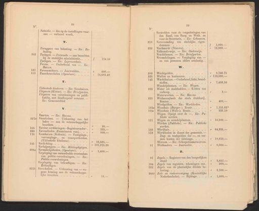 28 Subsidie. — Zie op de instellingen waar- aan — verleend wordt. Te Teruggave van belasting. — Zie: Be- lasting. u. Uitbestede kinderen. — Zie: Veenhuizen. | Uitgaven (Kleine). — Zie: Briefporten. V. Vaarten. — Zie: Havens. Vacatieloon. — Uitkeering van het halve — aan de wetenschappelijke | keurders. Vaccine-verklaringen.-Registrerender-. | Varenslieden (Examineren van). Veenhuizen (Kolonie). — Vestigings-, | vervangings-, en transportkosten. (Uitbestede kinderen). Verlichting. Verlofgangers. — Zie: Militiepligtigen. | Vermakelijkheden. (Openbare). en Verpleging van veroordeelde overtreders van politie-verordeningen, — Zie: | Politie-verordeningen. | Verpleging van behoeftigen, — Zie: | Behoeftigen. 2970) Verschotten. — Uitkeering van — we- | gens keuring aan de wetenschappe lijke keurders. | | | | | | | | 16,685.40 30.— 325. 800. — 16,625.— 101,275.28 1,400, — 97 104 222 2080 29 Vertrekken voor de vergaderingen van | den Raad, van Burg. en Weth. en voor de Secretarie, — Zie: Gebouwen. w. Wachtgelden. TE Wallen en kaaimuren. . . Wachthuizen.— Onderhoud, licht, brand- SOGN. ee | Wandelplaatsen. — Zie: Wegen. Water uit stadsbakken. — Kosten van verkoop. zin eee ne Waterwerken. — Zie: Havens. Weduwenfonds der stads drukkerij. | Benten. see Weekgelden. — Zie: Werklieden. Weeshuis (Burger-). Rente. . . | Weeshuis (Wale-). Rente. mf Wegen. Opzigt over de —. Zie: Pu- | z. Zegels. — Registers van den burgerlijken | stand Ee Zegels van registers, rekeningen enz. asHng ns. ce Zeil- en roeivereeniging (Koninklijke Nederlandsche). — Bijdrage. | | Zegels van de plaatselijke direkte be- | | | 1000 “ 792,000,— ” 8,746.75 „ 113,000.— 1,498.50 -— 64,985.— 10,810.— 8,000. — Toelagen. — Personele — aan beambten Uitgaven van verordeningen en publi- katiën, met doorloopend nommer. — Zie: Gemeenteblad. Vervreemding van stedelijke eigen- dommen. jd blieke werken. | Wegen en wandelplaatsen. . . | Werken (Publieke). — Zie: Publieke | 480.— 1,155.625 283.10 10,300.— ‚ bij de stedelijke administratie. Vischmarkt (Nieuwe). ee werken. | Werkhuis. ae Werklieden in dienst der gemeente. — | Toelagen. — Zie: Leprozenhuis. Volksonderwijs. — Zie: Onderwijs. Dag- en weekgelden der —, en ver- | Torens. — Onderhoud van —. Zie: Huizen. Vrachtloonen. — Zie: Briefporten. dere kosten der fabricage. . . | Werven. — Zie: Scheepstimmerwerven. | Wethouders. — Jaarwedde. | Torenwachters. — Jaarwedden. Vreemdelingen. — Verpleging van — en van personen elders armlastig. Tusschenscholen (Openbare).