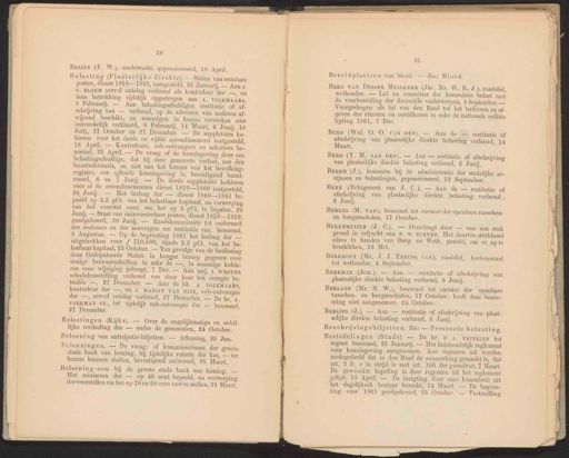30 BEER (F. W‚), nachtwacht, gepensioneerd, 18 April. Belasting (Plaatselijke direkte). — Staten van oninbare posten, dienst 1858— 1859, vastgesteld, 25 Januarij, — Aan j. Cc. BLOEM eervol ontslag verleend als kontroleur ‘der —, en deze betrekking tijdelijk opgedragen aan A. VOLKMAARS. 8 Februarij. — Aan belastingschuldigen restitutie of af. schrijving van — verleend, op de adressen van anderen af- wijzend beschikt, en sommigen in hunne verzoeken niet ontvankelijk verklaard, 8 Februarij, 14 Maart, 6 Junij, 18 Julij, 17 October en 27 December. — De suppletoire ko- hieren voor het derde en vijfde arrondissement vastgesteld, 18 April. — Kontroleurs, sub-ontvangers en schatters be- noemd, 25 April. — De vraag of de kennisgeving door een belastingschuldige, dat hij deze gemeente verlaat, aan den buurtsekretaris, en niet aan het bureau van het bevolking register, een gficiële kennisgeving is, bevestigend beant- woord, 6 en 7 Junij. — De derde suppletoire kohieren voor al de arrondissementen dienst 18591860 vastgesteld, 20 Junij. — Het bedrag der — dienst 1860-1861 be- paald op 3.3 pCt. van het belastbaar kapitaal, na verwerping jan het voorstel coo om het op 3 pCt. te bepalen, 20 Junij, — Staat van oninvorderbare posten, dienst 1858— 1859, goedgekeurd, 20 Junij. — Raadskommissiën tot onderzoek der reclames en der aanvragen om restitutie enz. benoemd, $ Augustus. — Op de begrooting 1861 het bedrag der — uitgetrokken voor f 710,500, zijnde 3.3 pCt. van het be- lastbaar kapitaal, 25 October. — Ten gevolge van de beslissing door Gedeputeerde Staten in hooger beroep gegeven over eenige bezwaarschriften in zake de —. in sommige kohie- ren eene wijziging gebragt, 7 Dec. — Aan mej, J. WEGTER schadeloosstelling verleend van door haar ten onregte be- taalde —, 27 December, — Aan de hh. A. VOLKMAARS, kontroleur der —, en J. MARIJT VAN DIJK, sub-ontvanger der —, eervol ontslag verleend, 27 December, — De hr. 4. VOERMAN CZ, tot tijdelijk sub-ontvanger der — benoemd, 27 December. Belastingen (Rijks). — Over de ongelijkmatige en onbil- lijke verdeeling der — onder de gemeenten, 24 October. Beleening van anticipatie-biljetten. — Aflossing, 25 Jan. Beleeningen. — De vraag: of kommissarissen der groote stads bank van leening, bij tijdelijke ruimte der kas, — ter beurze kunnen sluiten, bevestigend antwoord, 28 Maart, Beleening-som bij de groote stads bank van leening. — Het minimum der — op 40 cent bepaald, na verwerping der voorstellen om het op 70 en 50 cent vast te stellen, 21 Maart, Bereidplaatsen van bloed. Zie; Bloed. BERG VAN Dussen MuILKERK (Jhr. Mr, W, E, J.), raadslid, wethouder. — Lid en voorzitter der kommissie belast met de voorbereiding der financiële onderwerpen, 4 September. — Voorgedragen als lid van den Raad tot het teekenen en af- geven der attesten en certifikaten in zake de nationale militie ligting 1861, 7 Dec. Bere (Wed. O. O. VAN DEN). — Aan de — restitutie of afschrijving van plaatselijke direkte belasting verleend, 14 Maart. BERGH (J.), kommies bij de administratie der stedelijke ac- cijnsen en belastingen, gepensioneerd, 19 September. Bere (Y. M. VAN DEN). — Aan — restitutie of afschrijving van plaatselijke direkte belasting verleend, 6 Junij. BERK (Echtgenoot van J. C.). — Aan de — restitutie of afschrijving van plaatselijke direkte belasting verleend, 6 Junij. BERKEL (M. vAn), benoemd tot curator der openbare tusschen- en burgerscholen, 17 October. BERKEMEIJER (J. C.). — Overdragt door — van een stuk grond in erfpacht aan r. w. srTRrUBE. Het daartoe strekkend adres in handen van Burg. en Weth. gesteld, om er op te beschikken, 16 Mei. BERKHOUT (Mr. J. J. TEDING VAN), raadslid, herbenoemd tot wethouder, 4 September BERKMAN (JoH,). — Aan — restitutie of afschrijving van plaatselijke direkte belasting verleend, 6 Junij. BERLAGE (Mr. N, W‚), benoemd tot curator der openbare tusschen- en burgerscholen, 17 October; heeft deze benoe- ming niet aangenomen, 24 October. BERLIPS (J.). — Aan — restitutie of afschrijving van plaat- selijke direkte belasting verleend, 6 Junij. Beschrijvingsbiljetten. Zie: — Personele belasting. Bestedelingen (Stads). — De hr. Fr. A. FRITZLEN tot regent benoemd, 25 Januarij. — Het huishoudelijk reglement voor kennisgeving aangenomen. Aan regenten zal worden medegedeeld dat in den Raad de aanmerking gemaakt is, dat art, 2 Ir. c in strijd is met art. 166 der grondwet, 7 Maart. De gewraakte bepaling is door regenten uit het reglement geligt, 18 April. — De inrigting door cene kommissie uit het dagelijksch bestuur bezocht, 14 Maart. — De begroo- ting voor 1861 goedgekeurd, 25 October. — Vaststelling