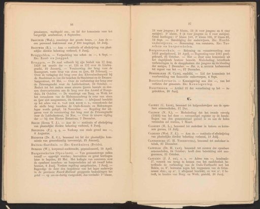 36 pensioenen, wachtgeld enz, en lid der kommissie voor het burgerlijk armbestuur, 4 September. BrouwEr (Wed.), concierge der groote beurs. — Aan de — een personeel traktement van f 200 toegelegd, 18 Julij. Brouwer (B.). — Aan — restitutie of afschrijving van plaat selijke direkte belasting verleend, 6 Junij. 37 18 voor jongens; 2° klasse, 1% (6 voor jongens en 6 voor meisjes); 3° klasse, 6 (4 voor jongens en 2 voor meisjes). Getal leerlingen: 1° klasse 150, 2 klasse 100, 38° klasse 60, 12 Sept. — Bezoldiging der onderwijzers. Zie: Hoofd- onderwijzers. — Benoeming van curatoren, Zie: Tus- schen- en burgerscholen. €. CacHET (C. Lion), benoemd tot hulponderwijzer aan de open- bare armenscholen, 27 Dec. 4 Â ! CALKOEN (H. L.), benoemd tot makelaar in katoen en katoe- nen garens, 18 Julij. CALKOEN (Wed. P. J.). — Aan de — restitutie of afschrijving van plaatselijke direkte belasting verleend, 18 Julij. CANNENBURG (C. H. VoOORBEYTEL), benoemd tot makelaar in tabak, 27 December. CasPARIs (J. J. DE), €. s. — Adres van —, houdende: 1°. verzoek om terug te komen van het raadsbesluit be- treffende de verbinding van de Oude-Turfmarkt met het Rokin, en 2°. bezwaren tegen het wegnemen van de Grim- nesser sluis, op n°. 1 afwijzend beschikt, en wat n°, 2 be- treft, in handen van Burg. en Weth, gesteld, 20 Junij. Bruggelden. — Verpachting van schut- en —, 4 Sept. — Zie: Zand- en jaagpad. Burgerweeshuis. — Rekening en verantwoording over 1859 goedgekeurd, 18 April. — Begrooting voor 1861 goed- gekeurd, 25 October. — Het — door eene kommissie uit het dagelijksch bestuur bezocht. Mededeeling betreffende verbeteringen in de slaapplaatsen der jongens en de kleeding der meisjes, 7 December. — Jhr. P, H. BICKER herbenoemd tot regent van het —, 27 December, CaLiscH (N. S.). — Mededeeling dat het tweede vervolg (1859) van het door — vervaardigd register op de hande- lingen van den gemeenteraad gereed is en aan de leden verzonden zal worden, 7 Maart. CAPPELLE (Dr. H. vAn), benoemd tot curator der openbare armenscholen, 24 October; heeft deze betrekking niet aan- genomen, 31 October. Bruggen. — De raad volhardt bij zijn besluit van 17 Aug. 1859 tot amotie der — no. 185 en 137 over de Linden- gracht, 25 Januarij. — Vernieuwing der brug voor de Raampoort, vaste brug van steen en ijzer, 22 Februari. — Over de verlaging der brug over den Kloveniersburgwal bij de Staalstraat en van die tusschen de Staalstraat en de Zwanen- burgerstraat, 30 Mei. — Over de verbetering der brug over de Prinsengracht voor de Teidschestraat, 24 October. — Besluit tot het maken eener nieuwe ijzeren bascule en stee- nen doorvaartmuren aan de brug over den Amstel of Hooge- sluis, 24 October, — De voordragt van Burg. en Weth. tot het veranderen van de Halvemaansbrug in eene van steen en ijzer niet aangenomen, 24 October. — Afwijzend beschikt op het adres van H. VAN DER BOOM c. s., verzoekende dat de steile brug tusschen de Oude-Kennis- en Molenstegen lager worde gelegd, 14 November. — Regeling der uit- gaven voor de vernieuwing der brug over de Prinsengracht voor de Leidschestraat, 14 Nov. — Over de nieuwe rigting der — bij den Hortus Botanicus, 7 December. BussEMAKER (S. Cars), raadslid. — Lid der kommissie tot voorbereiding van financiële onderwerpen, 4 Sept. Bruin (Erven T. J.). — Aan de — restitutie of afschrijving van plaatselijke direkte belasting verleend, 6 Junij. Buurtsekretaris. — Kennisgeving aan den —, van het verlaten der gemeente. Zie: Kennisgeving. BruiNING (F.), q. q. — Verkoop van stads grond aan —, 8 Augustus. Buurtwezen. — Artikel 25 der verordening op het — in- getrokken, 20 Junij. BÜCHNER (Dr. E. C.), benoemd tot lid der plaatselijke kom- missie van geneeskundig toevoorzigt, 25 Januarij. Buiten-Gasthuis. — Zie: Gasthuizen (Beide). BurGEr (W.), korporaal-nachtwacht, gepensioneerd, 18 April. Burgerscholen (Openbare). — Van gemeentewege zullen twaalf — opgerigt worden; leervakken en getal leerlingen later te bepalen, 23 Mei. Het kollegie van curatoren over de openbare tusschen- en burgerscholen zal uit twaalf leden bestaan, 6 Junij. Verdere regeling aangehouden, 7 Junij. — Ingevolge de door den inspekteur van het lager onderwijs in de provincie Noord-Holland geopperde bedenkingen het getal — op zes-en-dertig vastgesteld, dus verdeeld: 1° klasse,