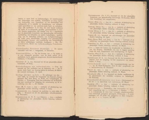 48 heeren, 9 stads heel- en verloskundigen, 18 vroedvrouwen, een deskundige voor syphilis, huidziekten en tinea capitis, een deskundige voor oogziekten, en een deskundige voor orthopaedie; af te schaffen de betrekkingen van assistent- stads geneesheer en van assistent-stads heel- en verloskun- dige; alle apothekers in de stad, die zich bereid verklaren bij nacht en in dringende gevallen geneesmiddelen te leve- ren, daartoe aangewezen; het toezigt over de — opgedragen aan de plaatselijke kommissie van geneeskundig toevoorzigt; inschrijving van bedeelden en andere behoeftigen; inschrij- ving van de behoeftige lidmaten van kerk genootschappen bij welke geen afzonderlijke inrigting voor geneeskundige armverzorging bestaat; niet-inschrijving van vreemdelingen en elders armlastigen; medische verslagen). — Zie: Ge- neesheeren, Heel- en verloskundigen, Vroedvrou- wen enz. Geneeskundig Personeel (Stedelijk). — De nieuwe instruktie voor het — vastgesteld, 12 December. Geneesmiddelen. — Tot het leveren van — bij nacht en in zeer dringende gevallen, voor de stads armen, al de apothekers in de gemeente aangewezen die zich daartoe bereid verklaren, 7 December. GENESTET (P. A, DE), benoemd tot lid der plaatselijke school- kommissie, 20 Junij. Gereedschappen van ambachtslieden, -— Over het voorstel tot het verbieden van de beleening van — bij de groote stads bank van leening staken de stemmen, 28 Maart; dit voorstel verworpen, 18 April. Geslagt (Accijns op het). — De opbrengst van den — voor 1861, op voorstel der kommissie van financiën, hooger geraamd dan door Burg. en Weth. was voorgedragen, 25 October. — Toezegging door den wethouder van de financiën van eene voordragt tot wijziging der verordening op de in- vordering van den —, 25 October. Geyt (M. C. vAn) — Aan — restitutie of afschrijving van plaatselijke direkte belasting verleend, 6 Junij. 49 GILDEMEESTER (Dr. J. P.), benoemd tot lid der plaatselijke kommissie van geneeskundig toevoorzigt, 25 Januarij. (Heeft deze betrekking niet aangenomen). Gisus (Wed. J.). — Aan de — restitutie of afschrijving van plaatselijke direkte belasting verleend, 6 Junij. GIsTEMa (Erven N.). — Aan de restitutie of afschrijving van plaatselijke direkte belasting verleend, 6 Junij. de administratie der stedelijke accijnsen en belastingen, 22 Februarij. GILDEMEESTER (A.), benoemd tot makelaar in ruwe zijde, 18 Julij. — Benoemd tot lid der plaatselijke schoolkommissie, 21 November, GLEIM (Erven J. V.). — Aan de — restitutie of afschrijving van plaatselijke direkte belasting verleend, 6 Junij, Graanhandel (Kommissie voor den).— Herbenoemd tot lid der — H, BROUWER VAN COPPENAAL, 21 Maart, GILDEMEESTER (A. H. D. vAN GHEEL). — Aan — restitutie of afschrijving van plaatselijke direkte belasting verleend, 14 Maart. Gorius (E. A.), benoemd tot sub-ontvanger der plaatselijke direkte belasting, 25 April. GRAMSER (W.). — Aan — restitutie of afschrijving van plaatselijke direkte belasting verleend, 6 Junij. Gors (Erven Wed. vAN DER). — Aan de — restitutie of af- schrijving van plaatselijke direkte belasting verleend, 6 Junij. Grasgewassen, Vaststelling der voorwaarden tot open- bare verpachting van —, 4 September, 5 Oetober. — Aan F‚ G. SCHREUDER de door hem verlangde schadevergoeding voor vernietigd grasgewas geweigerd, 8 Februarij. — J. sEYM ontslagen van de pacht van grasgewas en deze overgedra- gen aan F. A, N, RAGIUS, 23 Mei. GOMPERTZ (A. W‚). — Aan — restitutie of afschrijving van plaatselijke direkte belasting verleend, 14 Maart. Goor. — Adres der kamer van koophandel en fabrieken te — aan den Koning, betreffende een aan te leggen spoorweg langs die stad, aangenomen voor kennisgeving, 18 April. TORTER (Wed. O. G.). — Aan de — restitutie of afschrijving van plaatselijke direkte belasting verleend, 6 Junij. GoupswaarD (P. L. A.), benoemd tot lid der kommissie van bestuur over de inrigting tot het examineren van varens- lieden, 6 Junij. Gorinchemsche veer, — Het kommissarishuisje van het —, op de Oude-Turfmarkt, door de stad aangekocht van G. ROODENBURCH, 27 December. GRAAF (C. DE). — Aan — restitutie of afschrijving van plaatselijke direkte belasting verleend, 14 Maart. GRAAFLAND (Jhr. J. C.), benoemd tot derden verifikateur bij