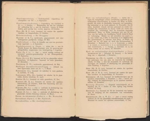 Se Haarlemmersluisje, -— Onderhandsche verpachting der schutgelden van het —, 4 September. Haarlemmertrekvaart. — Verpachting der visscherij in de —, 5 October. — Mededeeling dat aan het verlangen ter verbinding der — met de ringvaart, wegens de hooge kosten, geen gevolg kon worden gegeven, 81 October. Halvemaansbrug. — Zie: Bruggen. Handelssocieteit te Utrecht. — Adres der — aan de Tweede Kamer der Staten-Generaal, over de spoorweg-aan- gelegenheden, aangenomen voor kennisgeving, 8 Augustus. Hanzo (Dr, J. A.) — Aan — eervol ontslag verleend als inwonend assistent-geneeskundige in het Buitengasthuis, 12 September, HANLO (Dr. J.G. M.), benoemd tot lid der plaatselijke school- kommissie, 12 September; benoemd tot stads geneesheer, 21 December. HANVELDER (F. W.), nachtwacht, gepensioneerd, 30 Mei, Harlinger Stoombootmaatschappij. — Afstand van eene oppervlakte water aan de —, 7 Maart, HaARrTGERINK (L.), benoemd tot makelaar in vaste goederen en mobilair, 18 Julij. HarTGERINK RWz. (R.), benoemd tot schatter bij de plaat- selijke direkte belasting, 25 April. Harros (Dr. L.), benoemd tot stads geneesheer, 27 Dec. Harrosu (Mr. H. A.), benoemd tot curator der openbare armenscholen, 31 October; heeft deze benoeming niet aan- genomen, 21 November. HaRrTsEN (Jhr. C.). — Aan — restitutie of afschrijving van plaatselijke direkte belasting verleend, 14 Maart. HassLey (G. L.). — Aan — restitutie of afschrijving van plaatselijke direkte belasting verleend, 14 Maart. Haven- en dokmeester (Onder-). — Zie: Westerdok. Havenfront (Open-). — Zie: Paalwerk. Havenhoofden. — Zie: Aanlegplaatsen. Heel- en verloskundigen (Stads). — Adres der — tegen de voorgedragen nieuwe verordening regelende de ge- neeskundige armverzorging, in handen van Burg. en Weth. gesteld, ten einde de plaatselijke kommissie van geneeskun- dig toevoorzigt er op worde gehoord, 14 November. Op dit adres, houdende verzoek dat hun personeel eer worde ver- minderd dan vermeerderd en hunne wedde eer worde ver- meerderd dan verminderd, door die kommissie ongunstig geadviseerd; Burg. en Weth, vereenigen zich met dit ad- vies; wat het bedrag der bezoldiging betreft besluit de Raad tot verhooging. Besluit tot het aanstellen van negen —, op eene wedde van f 300; te benoemen en te ontslaan door den gemeenteraad, te schorsen door Burg. en Weth. ; zij treden om de vijf jaren af, doch zijn herbenoembaar, 7 December. — Benoemd tot: J. C. T. SCHEFFER, A. BOOM, J, H, KNOOP, C. ELLERMAN, J. F. A. BAUMGARTEN, P. J. A. TEN DOESSCHATE, J. F. PILGER, A. MENSERT en D. DA COSTA GOMEZ DE LA PENHA, 27 December. Heel- en verloskundige (Assistent-Stads). — J.F.A4. BAUMGARTEN tot — benoemd, 25 Januarij. — De betrek- king van — afgeschaft, 7 December. HEeMsKERK Az. (Mr. J.), raadslid. — Lid der kommissie tot het ontwerpen van een plan tot konversie der stedelijke schuld, 18 Julij. — Lid der kommissie tot onderzoek der aanvragen om restitutie of afschrijving van plaatselijke di- rekte belasting, 8 Augustus. Hees (Mr. H. R. van), benoemd tot curator der openbare armenscholen, 24 October. Hau (Mr, M, C. van), benoemd tot curator der openbare tusschen- en burgerscholen, 17 October. HaLvERs (J. R. C.), nachtwacht, gepensioneerd, met eene buitengewone jaarlijksche toelage, 30 Mei. Hers (Mr. P. M, G. van), benoemd tot curator der open- bare tusschen- en burgerscholen, 21 November. Handelschool. — Over de behoefte aan eene van gemeente- wege opgerigte —, 4 September. HripeBrINK (H. L.), benoemd tot hoofdonderwijzer aan de openbare armenscholen, 7 December. — Aan — eervol ont- slag verleend als hulponderwijzer op de openbare tusschen- scholen, 27 December. Heisteeg (Naauwe). — Ongerief voortvloeïijjende uit de bepaling dat de — slechts in ééne rigting mag bereden worden, 20 Junij. HeNnDRricHs (A.), benoemd tot lid der kommissie van bestuur voor de inrigting tot het examineren van varenslieden, 21 Maart. HERCKENRATH (Dr. A. W. F.). — Aan — eervol ontslag verleend als lid der plaatselijke schoolkommissie, 25 April. — Benoemd tot curator der openbare armenscholen, 17 Oct.