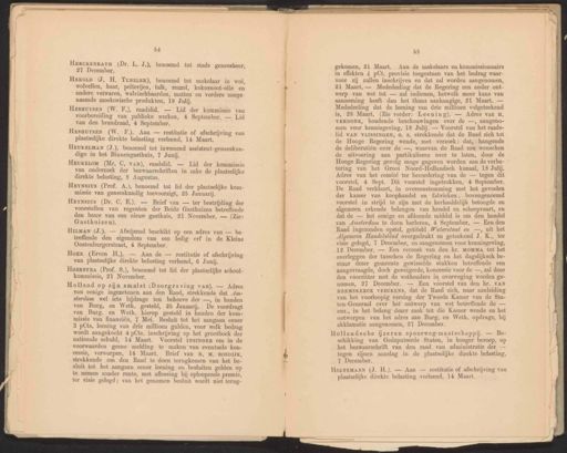 54 HERCKENRATH (Dr. L, J.), benoemd tot stads geneesheer, 21 December, Heynsius (Prof. A.), benoemd tot lid der plaatselijke kom- missie van geneeskundig toevoorzigt, 25 Januarij. HeyNsius (Dr. C. E.). — Brief van — ter bestrijding der voorstellen van regenten der Beide Gasthuizen betreffende den bouw van een nieuw gasthuis, 21 November. — (Zie: Gasthuizen). HiLMAN (J.). Afwijzend beschikt op een adres van — be- treffende den eigendom van een ledig erf in de Kleine Oostenburgerstraat, 4 September. Hoek (Erven H.). — Aan de — restitutie of afschrijving van plaatselijke direkte belasting verleend, 6 Junij. HoEKsTRA (Prof, S.), benoemd tot lid der plaatselijke school- kommissie, 21 November. Holland op zijn smalst (Doorgraving van). — Adres van eenige ingezetenen aan den Raad, strekkende dat Am- sterdam wel iets bijdrage ten behoeve der —, in handen van Burg, en Weth. gesteld, 25 Januarij. De voordragt van Burg. en Weth. hierop gesteld in handen der kom- missie van financiën, 7 Mei. Besluit tot het aangaan eener 3 pCts. leening van drie millioen gulden, voor welk bedrag wordt aangekocht 4 pCts. inschrijving op het grootboek der nationale schuld, 14 Maart. Voorstel INSINGER om in de voorwaarden geene melding te maken van eventuele kon- cessie, verworpen, 14 Maart. Brief van N, M. BOSDIJK, strekkende om den Raad te doen ierugkomen van het be- sluit tot het aangaan eener leening en besluiten gelden op te nemen zonder rente, met aflossing bij oploopende premie, ter visie gelegd; van het genomen besluit wordt niet terug- on on gekomen, 21 Maart. Aan de makelaars en kommissionnairs in effekten 4 pCt. provisie toegestaan van het bedrag waar- voor zij zullen inschrijven en dat zal worden aangenomen, 21 Maart. — Mededeeling dat de Regering een ander ont- werp van wet tot — zal indienen, hetwelk meer kans van aanneming heeft dan het thans aanhangige, 21 Maart. — Mededeeling dat de leening van drie millioen volgeteekend is, 28 Maart. (Zie verder: Leening). — Adres van H. VERDONK, houdende beschouwingen over de —, aangeno- men voor kennisgeving, 18 Julij. — Voorstel van het raads- lid VAN VLISSINGEN, 0, a. strekkende dat de Raad zich tot de Hooge Regering wende, met verzoek: dat, hangende de deliberatiën over de —, waarvan de Raad zou wenschen de uitvoering aan partikulieren over te laten, door de Hooge Regering gevolg moge gegeven worden aan de verbe- tering van het Groot Noord-Hollandsch kanaal, 18 Julij. Adres van het comité ter bevordering van de — tegen dit voorstel, 4 Sept. Dit voorstel ingetrokken, 4 September. De Raad verklaart, in overeenstemming met het gevoelen der kamer van koophandel en fabrieken, bovengenoemd voorstel in strijd te zijn met de herhaaldelijk betoogde en algemeen erkende belangen van handel en scheepvaart, en dat de bet eenige en afdoende middel is om den handel van Amsterdam te doen herleven, 4 September, — Een den Raad ingezonden opstel, getiteld #aterstaat en —, uit het Algemeen Handelsblad overgedrukt en geteekend J. K., ter visie gelegd, 7 December, en aangenomen voor kennisgeving, 12 December. — Een verzoek van den hr. MOMMA tot het overleggen der tusschen de Regering en het dagelijksch be- stuur dezer gemeente gewisselde stukken betreffende een aangevraagde, doch geweigerde, koncessie voor de —, zal door den voorzitter met de wethouders in overweging worden ge- nomen, 27 December. — Een voorstel van den hr. VAN HEEMSKERCK VEECKENS, dat de Raad zich, naar aanleiding van het voorloopig verslag der Tweede Kamer van de Sta- ten-Generaal over het ontwerp van wet betreffende de — enz., in het belang dezer zaak tot’ die Kamer wende en het ontwerpen van het adres aan Burg. en Weth. opdrage, bij akklamatie aangenomen, 27 December. Hollandsche ijzeren spoorweg-maatschappij. — Be- schikking van Gedeputeerde Staten, in hooger beroep, op het bezwaarschrift van den raad van administratie der — tegen zijnen aanslag in de plaatselijke direkte belasting, 7 December, Hero (J. H. TENZLER), benoemd tot makelaar in wol, wolvellen, haar, pelterijen, talk, reuzel, kokosnoot-olie en andere vetwaren, walvischbaarden, matten en verdere zooge- naamde moskovische produkten, 18 Julij. HonrzMANN (J. H.). — Aan — restitutie of afschrijving van plaatselijke direkte belasting verleend, 14 Maart, HesguyseN (W. F.), raadslid. — Lid der kommissie van voorbereiding van publieke werken, 4 September, — Lid van den brandraad, 4 September. HesuuysEN (W. F‚). Aan — restitutie of afschrijving van plaatselijke direkte belasting verleend, 14 Maart, HEUKELMAN (J.), benoemd tot inwonend assistent-geneeskun- dige in het Binnengasthuis, 7 Junij. HEuKELomM (Mr, C, van), raadslid. — Lid der kommissie van onderzoek der bezwaarschriften in zake de plaatselijke direkte belasting, 8 Augustus.