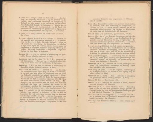 sa 60 Kamer van koophandel en fabrieken te Amster- dam. — Ongunstig advies der — op het voorstel van he raadslid VAN VLISSINGEN betreffende de doorgraving vau Holland op zijn smalst en de verbetering van het Groot- Noordhollandsch kanaal, 4 September. — Missive der — over het rapport der raadskommissie van 29 Junij 1859 betreffende de verordening van politie voor de Rijnhaven en de verdere aangelegenheden der Rijnvaart, 14 November. Kamer van koophandel en fabrieken te Goor. — Zie: Goor. Kanaal (Groot Noord-Hollandsch). — Voorstel van het raadslid vAN vLIssINGEN betreffende o. a. de verbete- ring van het —, 18 Julij. (Zie ook: Holland). Adres van het comité tot bevordering der doorgraving van Holland op zijn smalst tegen dit voorstel; missive van de kamer van koophandel en fabrieken, houdende ongunstig advies op dit voorstel; het wordt ingetrokken, 4 September. Tegen-ver- klaring van den Raad, 4 September. Kansum (A.). — Aan — restitutie of afschrijving van plaat- selijke direkte belasting verleend, 6 Junij. KAPPEYNE VAN DE COPPELLO (Dr. N. J. B.), conrector aan het Gymnasium. — Bezwaar van — betreffende zijne inlij- ving bij de dienst van het brandwezen, 4 September. KarrHaus (F, W.). — Aan — restitutie of afschrijving van plaatselijke direkte belasting verleend, 6 Junij. Kazernen en stallen. — Afstand van — aan het Rijk. De voorwaarden nader door Burg. en Weth. te onderzoeken, in verband met een adres van direkteuren van het Paleis van Volksvlijt betreffende het bolwerk Ouderkerk, 1 Maart. Die voorwaarden vastgesteld, 18 Julij. De kazerne Oranje- Nassau aan het Rijk in eigendom afgestaan, 18 Julij. Over den bouw eener kazerne op het Drilveld, 18 Julij. — Me- dedeeling van den voorzitter van het Paleis voor Volksvlijt betreffende den bouw van kazernen, 17 October. — De overeenkomst tusschen het departement van oorlog en de stad wegens het plaatsen van — is tot stand gekomen, 7 Dec. KEER (P.), raadslid, — Tid der kommissie om de anticipatie- biljetten voor »gezien” te teekenen, 16 Mei. — Lid der kommissie tot het ontwerpen van een plan van konversie der stedelijke schuld, 18 Julij, -— Lid der kommissie voor de bezwaarschriften ter zake van de plaatselijke direkte be- lasting, 8 Augustus. — Lid der kommissie van voorberei- ding van financiële onderwerpen, 4 September. — Het door Gl — ontworpen konversie-plan aangenomen, 31 Oetober. — (Zie: Schuld). KEER (P.), benoemd tot curator der openbare armenscholen, 17 October; heeft deze betrekking niet aangenomen, 24 October. — Aan — eervol ontslag verleend als lid der plaatselijke schoolkommissie, 24 October. — Herbenoemd tot regent van het Huiszittenhuis, 27 December. Kem of KEP (J.), nachtwacht, gepensioneerd, 30 Mei. KEMPER (Jhr, Mr. J°. DE Boscr), hoogleeraar aan het Athe- naeum Illustre. — Brief van — aan den Raad over de reor- ganisatie van het Athenaeum Illustre, 4 September. — Be- noemd tot curator der openbare armenscholen, 17 October ; heeft deze betrekking niet aangenomen , 24 October. Kennisgeving (Officiële), van het verlaten der gemeente, — De kennisgeving aan den buurtsekretaris als de officiële beschouwd, krachtens de uitlegging, door den Raad, bij be- sluit van 3 Maart 1858, aan art. 27 der verordening op de heffing der plaatselijke direkte belasting gegeven, 6 Junij. Kerkgenootschappen. -— Inschrijving van de lidmaten der — bij welke geen inrigting voor geneeskundige arm- verzorging bestaat, ter bekoming van geneeskundige ver- pleging van stadswege, 7 December. KERKWIJK (G. A. vAN). — Aan — restitutie of afschrijving van plaatselijke direkte belasting verleend, 6 Junij. KEsLER (M. E.). — Zie: SaaIus (D.). KESsPER (G. F.), benoemd tot makelaar in wolle, koehaar, veren en pelterijen, 27 December. KEssENICH (J. A. H. baron MICHIELS vAN). — Aanbieding door — van een door hem geschreven werkje, getiteld: De Vadministration des biens des époux pendant le mariage d'après le Oode Civil de Napoléon I, 4 September. KERKHOFF (J. C. F.), benoemd tot lid der plaatselijke kom- missie van geneeskundig toevoorzigt, 25 Januarij. (Heeft deze betrekking niet aangenomen). Keurders (Wetenschappeliijjke). — Toezigt over het — uit te oefenen door de plaatselijke kommissie van genees- kundig toevoorzigt, 14 November, Kerksteeg (Wijde). — Over het ongerief, voortvloeijende Keuring van levensmiddelen, — Zie: Levensmid- delen. : | OS a uit de bepaling dat de slechts in ééne rigting mag be- reden worden, 20 Junij.