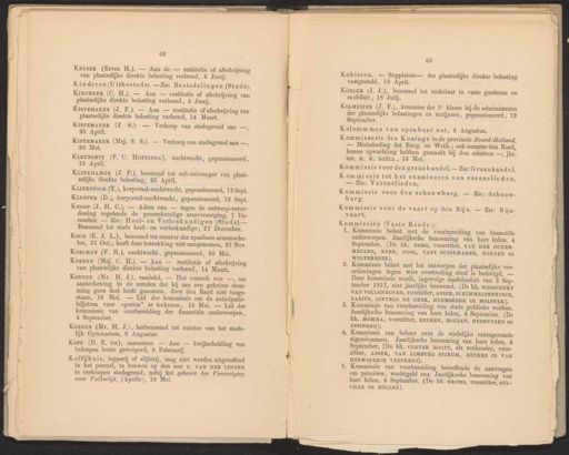 62 Keyser (Erven H.). — Aan de — restitutie of afschrijving van plaatselijke direkte belasting verleend, 6 Junij. Kinderen (Uitbestede). —Zie: Bestedelingen (Stads). Kocn (E. J. L.), benoemd tot curator der openbare armenscho- len, 31 Oct,; heeft deze betrekking niet aangenomen, 21 Nov. KoELMAN (F. H.), nachtwacht, gepensioneerd, 30 Mei, KoENEN (Mej. C. H.). — Aan — restitutie of afschrijving van plaatselijke direkte belasting verleend, 14 Maart, KOENEN (Mr. H. J.), herbenoemd tot curator van het stede- lijk Gymnasium, 8 Augustus. Koffijhuis, tapperij of slijterij, mag niet worden uitgeoefend in het perceel, te bouwen op den aan T. VAN DER LINDEN te verkoopen stadsgrond, nabij het gebouw der Pereeniging voor Volksvlijt, (Apollo), 16 Mei. 63 Kohieren. -— Suppletoir— der plaatselijke direkte belasting vastgesteld, 18 April. KoLMEIJER (J. F.), kommies der 1° klasse bij de administratie der plaatselijke belastingen en accijnsen, gepensioneerd, 12 September. Kommissie voorden graanhandel.— Zie: Graanhandel. Kommissie tot het examineren van varenslieden., — Zie: Varenslieden, Kommissie voor den schou wburg. — Zie: Schouw- burg. Kommissiën (Vaste Raads-]: KIRCHNER (C. H.). — Aan — restitutie of afschrijving van plaatselijke direkte belasting verleend, 6 Junij. KoOENEN (Mr. H. J), raadslid, — Het verzoek van —, Om aanteekening in de notulen dat hij aan een geheime stem- ming geen deel heeft genomen, door den Raad niet toege- staan, 16 Mei. — Lid der kommissie om de anticipatie- biljetten voor gezien” te teekenen, 16 Mei, — Lid der kommissie van voorbereiding der financiële onderwerpen , 4 September, Korr (D. E. DE), aannemer. — Aan — kwijtschelding van beloopen boete geweigerd, 8 Februarij. KönLER (J. J.), benoemd tot makelaar in vaste goederen en mobilair, 18 Julij. Kolommmen van openbaar nut, 8 Augustus, Kommissie voor de vaart op den Rijn. — Zie: Riijn- vaart, 1. Kommissie belast met de voorbereiding van financiële KIsTEMAKER (J. F.). — Aan — restitutie of afschrijving van plaatselijke direkte belasting verleend, 14 Maart. Kommissaris des Konings inde provincie Noord-Holland. — Mededeeling dat Burg. en Weth. ; ook namens den Raad, hunne opwachting hebben gemaakt bij den nieuwen —, jhr, mr, H. H, ROËLL;, 16 Mei, onderwerpen. Jaarlijksche benoeming van hare leden, 4 September, (De hh. BERG, voorzitter, VAN DER OUDER- MEULEN, KEER, COOL, CATS BUSSEMAKER, KOENEN en WOLTERBEEK). Kommissie belast met het ontwerpen der plaatselijke ‘ver- ordeningen tegen wier overtreding straf is bedreigd. — Deze kommissie wordt, ingevolge raadsbesluit van 3 Sep- tember 1857, niet jaarlijks benoemd. (De hh. MEsscHERT VAN VOLLENHOVEN, voorzitter, ASSER, SCHIMMELPENNINCK, FABIUS, LINTELO DE GEER, HEEMSKERK en MOLSTER). KIsTEMAKER (J. S.). — Verkoop van stadsgrond aan —, 25 April. ‚ Kommissie van voorbereiding van stads publieke werken. Jaarlijksche benoeming van hare leden, 4 September. (De hh. MOMM4, voorzitter, BEUKER, BOELEN, HESHUYSEN en INSINGER). KIsTEMAKER (Mej. S. S.). — Verkoop van stadsgrond aan —, 30 Mei, Kommissie van beheer over de stedelijke rentegevende eigendommen. Jaarlijksche benoeming van hare leden, 4 September. (De hh. CORVER HOOFT, als wethouder, voor- zitter, ASSER, VAN LIMBURG STIRUM, BEUKER En VAN HEEMSKERCK VEECKENS). KLEYNsMIT (P. C. HorTINGA), nachtwacht, gepensioneerd, 18 April. Kommissie van voorbereiding betreffende de aanvragen om pensioen, wachtgeld enz. Jaarlijksche benoeming van hare leden, 4 September. (De hh, BROMS, voorzitter, GÜL- CHER en MÜLLER). KLINKHAMER (J. P.), benoemd tot sub-ontvanger van plaat- selijke direkte belasting; 25 April. KLINKSPOOR (T.), korporaal-nachtwacht, gepensioneerd, 12 Sept. KLUPPER (D.), korporaal-nachtwacht, gepensioneerd, 12 Sept. Knoor (J. H. C.), — Adres van — tegen de ontwerp-veror- dening regelende de geneeskundige armverzorging, 7 De- cember. — Zie: Heel- en Verloskundigen (Stads).— Benoemd tot stads heel- en verloskundige, 27 December.