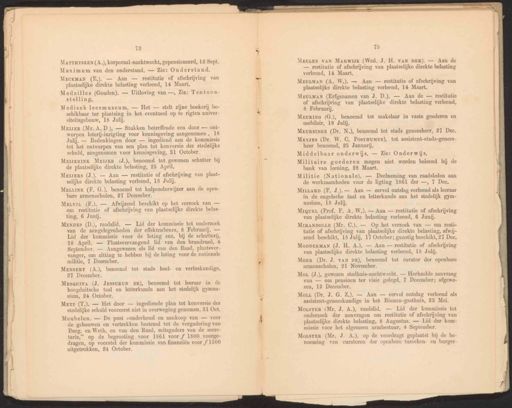 MATTHYszEN (A.), korporaal-nachtwacht, gepensioneerd, 12 Sept. Maximum van den onderstand. — Zie: Onderstand. Medisch leesmuseum. — Het — stelt zijne boekerij be- schikbaar ter plaatsing in het eventueel op te rigten univer- siteitsgebouw, 18 Julij. MEIJERINK MEIsEr (J.), benoemd tot gewonen schatter bij de plaatselijke direkte belasting, 25 April, MeuviL (F.). — Afwijzend beschikt op het verzoek van — om restitutie of afschrijving van plaatselijke direkte belas- ting, 6 Junij. Merz (T.). — Het door — ingediende plan tot konversie der stedelijke schuld vooreerst niet in overweging genomen, 31 Oct. Meubelen. — De post zonderhoud en aankoop van — voor de gebouwen en vertrekken bestemd tot de vergadering van Burg. en Weth. en van den Raad, mitsgaders van de secre- tarie,” op de begrooting voor 1861 voor f 1800 voorge- dragen, op voorstel der kommissie van financiën voor f 1500 uitgetrokken, 24 October. MEULEN vaN Marwijk (Wed. J. H. VAN DER). — Aan de — restitutie of afschrijving van plaatselijke direkte belasting verleend, 14 Maart, MeuLMAN (Erfgenamen van J. D.). — Aan de — restitutie of afschrijving van plaatselijke direkte belasting verleend, 8 Februarij. MEURSINGE (Dr. N.), benoemd tot stads geneesheer, 27 Dec. Mevses (Dr. W. C. Postauuus), tot assistent-stads-genees- heer benoemd, 25 Januarij. Middelbaar onderwijs. — Zie: Onderwijs. Militaire goederen mogen niet worden beleend bij de bank van leening, 28 Maart. Militie (Nationale). — Deelneming van raadsleden aan de werkzaamheden voor de ligting 1861 der —, 7 Dec, MiLLarD (F. J.). — Aan — eervol ontslag verleend als leeraar in de engelsche taal en letterkunde aan het stedelijk gym- nasium, 18 Julij. Miquet (Prof, F. A. W.). — Aan — restitutie of afschrijving van plaatselijke direkte belasting verleend, 6 Junij. MzckMaN (E.). — Aan — restitutie of afschrijving van plaatselijke direkte belasting verleend, 14 Maart, Meiser (Mr. A.D ). — Stukken betreffende een door — ont- worpen loterij-inrigting voor kennisgeving aangenomen , 18 Julij. — Bedenkingen door — ingediend aan de kommissie tot het ontwerpen van een plan tot konversie der stedelijke schuld, aangenomen voor kennisgeving, 31 October. Meyers (J.). — Aan — restitutie of afschrijving van plaat- selijke direkte belasting verleend, 18 Julij. MenDes (D.), raadslid. — Lid der kommissie tot onderzoek van de aangelegenheden der effektenbeurs, 8 Februari. — Lid der kommissie voor de loting enz. bij de schutterij, 18 April. — Plaatsvervangend lid van den brandraad, 4 September. — Aangewezen als lid van den Raad, plaatsver- vanger, om zitting te hebben bij de loting voor de nationale militie, 7 December. MgEuLMAN (A. W.). — Aan — restitutie of afschrijving van plaatselijke direkte belasting verleend, 14 Maart, MeurING (G.), benoemd tot makelaar in vaste goederen en mobilair, 18 Julij. MIRANDOLLE (Mr. C.). — Op het verzoek van — om resti- tutie of afschrijving van plaatselijke direkte belasting, afwij- zend beschikt, 18 Julij, 17 October; gunstig beschikt, 27 Dee, Medailles (Gouden). — Uitloving van —, Zie: Tentoon- stelling. MeiiiNK (F. G.), benoemd tot hulponderwijzer aan de open bare armenscholen, 27 December. MENSERT (A.), benoemd tot stads heel- en verloskundige, 27 December. MoDpDERMAN (J. H. A.). — Aan — restitutie of afschrijving van plaatselijke direkte belasting verleend, 18 Julij. MesauITa (J. JEssuRuN DE), benoemd tot leeraar in de hoogduitsche taal en letterkunde aan het stedelijk gymna- sium, 24 October. Morr (Dr. J. vAN DE), benoemd tot curator der openbare armenscholen, 21 November. MoL (J.), gewezen stadhuis-nachtwacht. — Herhaalde aanvraag van — om pensioen ter visie gelegd, 7 December; afgewe- zen, 12 December. Mous (Dr. J. G. Z.). — Aan — eervol ontslag verleend als assistent-geneeskundige in het Binnen-gasthuis, 23 Mei. MoLsTER (Mr. J. A.), raadslid. — Lid der kommissie tot onderzoek der aanvragen om restitutie of afschrijving van plaatselijke direkte belasting, 8 Augustus. — Lid der kom- missie voor het algemeen armbestuur, 4 September. MoisTER (Mr. J. A.), op de voordragt geplaatst bij de be- noeming van curatoren der openbare tusschen- en burger