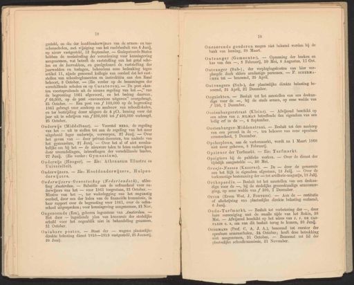 DEL 18 gesteld, en die der hoofdonderwijzers van de armen- en tus- schenscholen, met wijziging van het raadsbesluit van 6 Junij, op nieuw vastgesteld, 12 September. — Gedeputeerde Staten hebben de mededeeling der verordening voor kennisgeving aangenomen, wat betreft de vaststelling van het getal scho- len en de leervakken, en goedgekeurd de vaststelling der jaarwedden en toelagen, behoudens eene bedenking tegen artikel 11, zijnde genoemd kollegie van oordeel dat het vast- stellen van schoolreglementen en instruktiën aan den Raad behoort, 8 October. — (Zie verder op de benamingen der verschillende scholen en op Curatoren). — De post skos- ten voortspruitende uit de nieuwe regeling van het —,” van de begrooting 1861 afgevoerd, en het bedrag daarvan, f 60,000, op de post zonvoorziene uitgaven” overgebragt, 95 October. — Een post van f 100,000 op de begrooting 1861 gebragt voor aankoop en aanbouw van schoollokalen, en ter bestrijding dezer uitgave de 4 pCt. leening voor dat jaar uit te schrijven van f300,000 tot f 400,000 verhoogd, 25 October. Onderwijs (Middelbaar). — Voorstel BERG, de regeling van het — uit te stellen tot aan de regeling van het meer uitgebreid lager onderwijs, verworpen, 27 Junij. — Over het geven van — door privaat-docenten, ten nadeele van het gymnasium, 27 Junij. — Over het al of niet noodza- kelijke om bij het — de nieuwere talen te laten onderwijzen door vreemdelingen, inboorlingen der verschillende landen, 27 Junij. (Zie verder: Gymnasium). Ongenoemde (Een), geboren ingezetene van Amsterdam. — Het door — ingediende plan van konversie der stedelijke schuld voor het oogenblik niet in behandeling genomen, 31 October. : 19 Onroerende goederen mogen niet beleend worden bij de bank van leening, 28 Maart. Dn’ Ontvanger (Gemeente-). — Opneming der boeken en kas van den —, 8 Februarij, 30 Mei, 8 Augustus, 17 Oct. Ontvanger (Sub-), der verplegingskosten van hier ver- pleegde doch elders armlastige personen, — F. SCHERMA- cur tot — benoemd, 25 April. Ontvangers (Sub-), der plaatselijke direkte belasting be- noemd, 25 April, 27 December. Oogziekten. — Besluit tot het aanstellen van een deskun- dige voor de —, bij de stads armen, op eene wedde van f 150, 7 December. Oostenburgerstraat (Kleine). — Afwijzend beschikt op een adres van J. HILMAN betreffende den eigendom van een ledig erf in de —, 4 September. Oostenburger-Middenstraat. — Besluit tot den aankoop van een perceel in de —, ten behoeve van eene openbare armenschool, 7 December. Opzigters bij de publieke werken. — Over de dienst der tijdelijk aangestelde —, 30 Mei. OupeMaAns (Prof. C. A. J. A), benoemd tot curator der openbare armenscholen, 24 October; heeft deze betrekking niet aangenomen, 31 October. — Benoemd tot lid der plaatselijke schoolkommissie, 21 November. Onderwijs (Hooger). — Zie: Athenaeum Illustre en Universiteit. Oninbare posten. — Staat der — wegens plaatselijke direkte belasting dienst 1858—1859 vastgesteld, 25 Januarij, 20 Junij Opsleeploon, aan de varkenmarkt, wordt na 1 Maart 1860 niet meer geheven, 8 Februarij. Oranje-Nassau (Kazerne). — De — door de gemeente aan het Rijk in eigendom afgestaan, 18 Julij. — Over de toekomstige bestemming der — tot artillerie-magazijn, 18 Julij. Onderwijzers. — Zie: Hootdonderwijzers, Hulpon- derwijzers. Opziener der Turfmarkt. — Zie: Turfmarkt. Orthopaedie. — Besluit tot het aanstellen van een deskun- dige voor de —, bij de stedelijke geneeskundige armverzor- ging, op eene wedde van f 300, 7 December. Onderwiijjzers- Genootschap (Nederlandsch), afdee- ling Amsterdam. — Subsidie aan de oefenschool voor on- derwijzers van het — voor 1861 toegestaan, 25 October. — Missive van het —, ter wederlegging van het ongunstig oordeel, door een der leden van de financiële kommissie, in haar rapport over de begrooting voor 1861, over de oefen- school uitgesproken ; voor kennisgeving aangenomen, 21 Nov, Orrrr (Erven Wed. J. FORTENS). — Aan de — restitutie of afschrijving van plaatselijke direkte belasting verleend; 6 Junij. Oude-Turfmarkt. — Besluit tot verbetering der —, door hare vereeniging met de smalle zijde van het Rokin, 30 Mei. — Afwijzend beschikt op het adres van J. J. DE CAS- PARIS c.s. om van dit besluit terug te komen, 20 Junij.