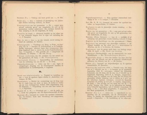 dee 84 PouwELs (P.). — Verkoop van stads grond aan —, 16 Mei. PovEL (A.). — Aan — restitutie of afschrijving van plaatse- lijke direkte belasting verleend, 14 Maart. Praeceptoren aan het gymnasium. — De — mogen geen privaat onderwijs geven aan jongelieden die niet op het gymnasium worden onderwezen; den overigen leeraren bij deze inrigting is dit wel toegestaan, 27 Junij. Premiën bij brand. — Afwijzend beschikt op het adres van K. RIS, houdende klagten over de wijze van verdeeling der —, 1 December. PriL (A. DE). — Aan —, op zijn verzoek, eervol ontslag ver- leend als makelaar, 81 October. Prinsengracht. — Voordragt van Burg. en Weth, tot dem- ping van de tusschen de Leidschestraat en de Leidsche- vracht, verworpen; adressen tegen deze voorgenomen dem- ping ingediend door G. cruYs cz. en het Purperhoedenveem, enz, 8 Augustus. — Een gedeelte der — aangewezen als turfmarkt, 17 October. — Zie ook: Brug. Lin Raad van administratie, — Voorstel tot instelling van een — over de openbare lagere scholen te Amsterdam, ver- worpen, 23 Mei, 85 Rapenburgerstraat. — Eene openbare armenschool voor- loopig in de — te vestigen, 7 December. Ras (Mr. H. W. G.), benoemd tot curator der openbare tus- schen- en burgerscholen, 17 October. Reclames in zake de plaatselijke direkte belasting. — Zie: Belasting. REEVENs (Erven GEORGE). — Aan de — restitutie of af- schrijving van plaatselijke direkte belasting verleend, 18 Julij. Reglement voor de groote stads bank van leening vastge- steld, 18 April. — Zie: Bank van leening. Reglement (Huishoudelijk), voor de administratie der stads- bestedelingen. — Zie: Bestedelingen (Stads-). REINrs (O.), benoemd tot hulponderwijzer op de openbare armenscholen, 27 December. Privaat onderwijs, een der oorzaken van het verval van het gymnasium, 27 Junij. — Zie: Praeceptoren. Raampoort. — Besluit tot vernieuwing van de brug voor de —; vaste brug van steen en ijzer; de kosten te vinden uit de voor buitengewone werken 1860 uitgetrokken som, 29 Februarij. — Verpachting van een stuk land buiten de —, 4 September. Rector van het gymnasium. — De — mag geen privaat onder- wijs geven aan jongelieden die niet op het gymnasium wor- den onderwezen, 27 Junij. Register op de handelingen van den gemeenteraad, 7 Maart, Regterlijke magt. — Over het betalen van huur door het Rijk voor het gebruik van aan de gemeente toebehoorende gebouwen ten behoeve van de —, 24 October. Rekening der stad over 1859. — Voorstel coor, het batig slot ad f 220,000 van de — te brengen op de suppletoire begrooting 1860 B, verworpen; voorstel der financiëele kommissie, van dit batig slot de som van f 163,000 op de suppletoire begrooting 1860 B te brengen, aangenomen; voorstel COOL, in verband met dit batig slot het bedrag der plaatselijke direkte belasting vast te stellen op 3 pCt. van het belastbaar kapitaal, verworpen; voorstel der financiële kommissie dit bedrag op 3.3 pCt. te bepalen, aangenomen, 20 Junij. — Ten gevolge van het batig slot van de — de 4 pCts. leening voor 1860, op de begrooting ten bedrage van f 200,000 ingetrokken, met f 100,000 verminderd, 20 Junij. — De — den Raad aangeboden, 8 Augustus; door den Raad goedgekeurd, 17 October. Provinciale Staten. — Zamenstelling der stembureaux voor de verkiezing van een lid der —, 27 Junij. RaGuI (F. A. N.). — Overdragt aan — van de pacht van J. SEYM van grasgewas aan den Spaarndammerdijk, 23 Mei. Registers van ontvangst voor plaatselijke middelen. — Af- wijzend beschikt op het adres van J. J. WEEVERINGH te Haarlem, om de — te leveren, 24 October. RENDORP (S.), c.s. — Adres van —, verzoekende de ver- plaatsing van de vischmarkt, van de Nieuwemarkt naar elders; in handen der kommissie voor de publieke werken gesteld, 4 September, — De beschikking op het adres aan- Purperhoedenveem. — Adres van het — enz. tegen de voorgedragen demping van de Prinsengracht tusschen de Leidschestraat en Leidschegracht, 8 Augustus. RanusEn (H.), benoemd tot curator der openbare armenscho- len, 17 October; heeft deze betrekking niet aangenomen, 24 October,
