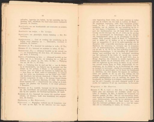 eline — 86 gehouden, ingevolge het besluit, bij het vaststellen der be- grooting 1861, betreffende den bouw eener nieuwe vischmarkt genomen, 25 October. Resiliatie van een huurkontrakt met STEYLING en LUESKE, 4 September, Restitutie van accijns. — Zie: Accijns. Restitutie van plaatselijke direkte belasting. — Zie: Be- lasting. Reukwateren. — Over de werking der verordening op de heffing eener belasting op —, chemicaliën, vernissen en polituren, 25 October. REURHOTF (J. W.), benoemd tot makelaar in wolle, 27 Dec. RIBBERS (C. J.), benoemd tot makelaar in tabak, 27 Dez. RiETsNijDER (H.), — Afwijzend beschikt op het verzoek van —, om kwijtschelding der door hem, als aannemer, beloo pen boete, 8 Februarij. RIJNDERS (J. G.), raadslid, benoemd tot lid der kommissie om den kontrôleurs der personele belasting behulpzaam te zijn bij het opmaken der beschrijvingsbiljetten, 25 April. 87 toire begrooting dienst 1860, ten einde pensioen te verlee- nen aan de weduwe van den bode H, JANSEN, 21 Maart. — De suppletoire begrooting 1860 dezer kommissie goedge- keurd, 16 Mei. — Besluit tot het doen drukken voor de raadsleden van de stukken die met betrekking tot de Ringvaart. — Zie: Haarlem, Rinsum (C. W. A. vaN). — Een door — den Raad aange- boden plan van konversie der stedelijke schuld voor de leden te drukken, 16 Mei; in handen der kommissie van financiën gesteld, 30 Mei. Het tot niet-aanneming advise- rend rapport der kommissie van financiën in handen gesteld eener raadskommissie, benoemd tot het ontwerpen van een konversie-plan, 18 Julij. — De Raad besluit het, sedert door den ontwerper gewijzigd, plan van — voor het oogen- blik niet in behandeling te nemen, 81 October, Riijden (Verordening op het). — Afwijzend beschikt op het adres van W. A. WILLING, tot wijziging der —, (bij den koetsier een jongen op den bok), 16 Mei, — Wijziging van art. 48 der —, 20 Junij. RIJNDERS (J. G.), benoemd tot curator der openbare armen” scholen, 17 October; heeft deze betrekking niet aangeno- men, 24 October. ter visie liggen, 4 September. — Overeenkomstig het rap- port der raadskommissie van 29 Junij 1859 (zie tweede vervolg van het Overzigt, blz. 87, n°. 6/75), en ten gevolge van de aanmerkingen en bedenkingen van den minister van binnenlandsche zaken op de verordening van 292 De- cember 1858 gemaakt, besluit de Raad: 1°, verordeningen vast te stellen op de hefling en op de invordering van kaai- en waaggelden; 2°. de in de raadsvergadering van 22 December 1858 vastgestelde verordening van politie voor de Rijnhaven tot herziening te verwijzen aan de kommissie voor de strafverordeningen, bepaaldelijk: «. tot herziening van de artt. 4, 12, 13 en 56, naar aanleiding van bestaande belasting-verordeningen; %. tot aanvulling der politie-veror- dening, naar aanleiding van de te verwachten intrekking van het reglement B van 1840; 39°. terwijl dan, overeen- komstig ’s ministers missive van 16 April 1859, door de Hooge Regering zou behooren te worden ingetrokken het koninklijk besluit van 16 Februarij 1840, voor zoo veel be- treft het reglement op het lossen en laden; en op ’s voorzit- ters voorstel worden Burg. en Weth. uitgenoodigd; de ver- ordeningen op de heffing en op de invordering van waag- en kaaigeld te ontwerpen ‚ daarbij in overweging te nemen de wenschen en opmerkingen van de kamer van koophandel en fabrieken, (in wier handen het rapport der raadskom- missie was gesteld en die op een laag bedrag van het waaggeld aandringt), en tevens het gevoelen der bovenge- noemde raadskommissie over de meening der kamer van koophandel en fabrieken in te winnen; voorts gevolg te geven aan het sub % bepaalde, ten einde daarmede gereed te zijn zoodra het reglement B zal zijn ingetrokken, 14 November. Rijk. — Verhuring door de stad aan het — van de lokalen op de Rundermarkt, ten behoeve van de perceptie van den accijns op het geslagt, 7 Maart. — De ontworpen voor- waarden voor den afstand van kazernen en stallen aan het — door Burg. en Weth. nader te onderzoeken, in verband met het adres van direkteuren van het Paleis voor Volks- vlijt betreffende het bolwerk Ouderkerk, 7 Maart; die voor- waarden vastgesteld, 18 Julij. — De kazerne Oranje-Nassau aan het — in eigendom afgestaan, 18 Julij. De overeen- komst tusschen het — (departement van oorlog) en de stad, wegens het plaatsen van kazernen, is tot stand gekomen, 7 December. Rijnhaven. — Zie: Rijnvaart, Riijnvaart. — Magtiging verleend aan de kommissie voor de vaart op den Rijn, tot het inleveren van cene supple-