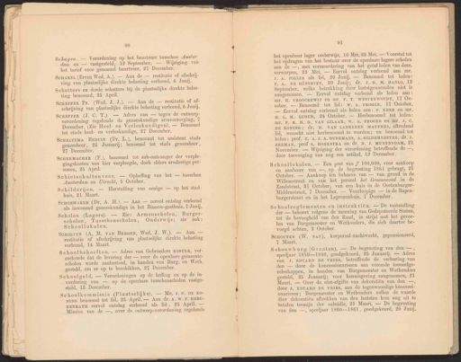 Deere # j 90 Schagen. Verordening op het beurtveer tusschen Amster dam en — vastgesteld, 12 September. -— Wijziging van het tarief voor genoemd beurtveer, 27 December. ScuerMacHER (F.), benoemd tot sub-ontvanger der verplegingskosten van hier verpleegde, doch elders armlastige personen, 25 April. Missive van de —, over de ontwerp-verordening regelende 91 het openbaar lager onderwijs, 16 Mei, 28 Mei. — Voorstel tot het opdragen van het bestuur over de openbare lagere scholen aan de —, met vermeerdering van het getal leden van deze, verworpen, 28 Mei, — Eervol ontslag verleend aan mr. 7. A. JoLLEs als lid, 20 Junij. — Benoemd tot leden: Pp. A, DE GÍNESTET, 20 Junij; dr. J. G. M. HANLo, 12 September, welke betrekking door laatstgenoemden niet is aangenomen. — Eervol ontslag verleend als leden aan: mr, H. CROOCKEWIT eu mr. F. T. WESTERWOUDT, 17 Oetober. — Benoemd tot lid: w. a. FROGER, 17 Oetober. .— Eervol ontslag verleend als leden aan: P. KEER en mr, H. L. M. LUDEN, 24 October. — Herbenoemd tot leden: mr, F. R. H. G. VAN LILAAR, W. A. FROGER en Mr. J. C. DE KONING ; dr, D. VAN LANKEREN MATTHES, aftredend lid, wenscht niet herbenoemd te worden; en benoemd tot leden: prof. C. A.J. A. OUDEMANS, A, GILDEMEESTER, dr, J. ZEEMAN, prof S. HOEKSTRA en dr, D. J. MUNTENDAM, Q1 November, — Wijziging der verordening betreffende de —, door toevoeging van nog een artikel, 12 December. choollokalen. — Een post van f 100,000, voor aankoop en aanbouw van —, op de begrooting 1861 gebragt, 25 October. — Aankoop ten behoeve van — van grond in de Willemstraat en van het perceel Zet Groenewoud in de Zandstraat, 81 October; van een huis in de OostenburgerMiddenstraat, 7 December. — Voorloopige — in de Rapenburgerstraat en in het Leprozenhuis, 7 December. Schoolreglementen en instruktiën. — De vaststelling der — behoort volgens de meening van Gedeputeerde Staten, tot de bevoegheid van den Raad, in strijd met het gevoelen van Burgemeester en Wethouders, die zich daartoe bevoegd achten, 3 October. ScHourEN (W. van), korporaal-nachtwacht, gepensioneerd, 7 Maart. ScaaxeL (Erven Wed. A.). — Aan de — restitutie of afschrijving van plaatselijke direkte belasting verleend, 6 Junij. Schatters en derde schatters bij de plaatselijke direkte belasSchietschuitenveer. — Ophefing van het — tusschen Amsterdam en Utrecht, 5 October. Schouwburg (Grooten). — De begrooting van den —, speeljaar 1859—1860, goedgekeurd, 25 Januarij. — Adres van 7. EDUARD DE VRIES, betreffende de verhuring van den — door de koncessionarissen aan vreemde tooneelgezelschappen, in handen van Burgemeester en Wethouders gesteld, 25 Januarij; voor kennisgeving aangenomen, 21 Maart. — Over de niet-afgifte van dekoratiën van den —, door J. EDUARD DE VRIES, aan de tegenwoordige koncessionarissen; Burgemeester en Wethouders zullen de waarde dier dekoratiën aftrekken van den laatsten hem nog uit te betalen termijn der subsidie, 21 Maart. — De begrooting van den —, speeljaar 1860—1861, goedgekeurd, 20 Junij, ting benoemd, 25 April. Schilderijen. — Herstelling van eenige — op het stadhuis, 21 Maart. Scarrrer Pz. (Wed. J. J.). — Aan de — restitutie of afschrijving van plaatselijke direkte belasting verleend, 6 Junij. ScHorMaAKER (Dr. A. H.). — Aan — eervol ontslag verleend als inwonend geneeskundige in het Binnen-gasthuis, 7 Junij. ScHErrER (J. C. T.) — Adres van — tegen de ontwerpverordening regelende de geneeskundige armverzorging, 7 December. (Zie Heel- en Verloskundigen). — Benoemd tot stads heel- en verloskundige, 27 December. Scholen (Lagere). — Zie: Armenscholen, Burgerscholen, Tusschenscholen, Onderwijs; zie ook: Schoollokalen. ScHrLTEMa Bepum (Dr. L.), benoemd tot assistent stads geneesheer, 25 Januarij; benoemd tot stads geneesheer, 27 December, SCHOLTEN (A, M. van BerGex, Wed. J. W.). — Aan — restitutie of afschrijving van plaatselijke direkte belasting verleend, 14 Maart. Schoolbehoeften. — Adres van Gebroeders KOSTER, verzoekende dat de levering der — voor de openbare gemeentescholen worde aanbesteed, in handen van Burg. en Weth. gesteld, om er op te beschikken, 27 December. Schoolgeld. — Verordeningen op de heffing en op de invordering van — op de openbare tusschenscholen vastgesteld, 12 December. Schoolkommissie (Plaatselijke). — Mr. J.C. DE KONING benoemd tot lid, 25 April. — Aan dr. 4. W.F. HERCKENRATH eervol ontslag verleend als lid, 25 April. —