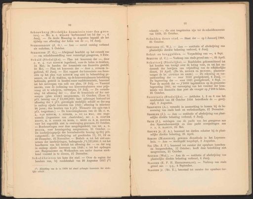 IE ee Dese 92 Schouwburg (Stedelijke kommissie voor den grooten). — Mr. B. 7. MÜLLER herbenoemd tot lid der —, 6 Junij. — De derde Maandag in Augustus bepaald als het tijdstip van aftreding der leden van de —, 16 Junij. SCHREDERHOFF (J. G.). — Aan — eeryol ontslag verleend als makelaar, 5 October. ScaREUDER (F. G.). — Afwijzend beschikt op het verzoek van — om schadeloosstelling voor vernietigd grasgewas, 8 Febr. Schuldbrieven ten laste der stad. — Over de regten der houders van, bij raadsbesluit van 26 Augustus 1857 (*) (*) Afsluiting van de in 1828 tot stand gebragte konversie der stedelijke schuld. 93 erkende —, die niet toegetreden zijn tot de schuldkonversie van 1828, 25 October. Schulden dezer stad. — Staat der — op 1 Januarij 1860, 25 October. ScuurkEr (C. W.). — Aan — restitutie of afschrijving van plaatselijke direkte belasiing verleend, 6 Junij. Schut- en bruggelden. — Verpachting van —, 4 Sept. Scuurre (J. C.). — Verkoop van stads grond aan —, 25 April. Schutterij (Stedelijke). — Raadsleden gekommitteerd tot het houden van toezigt over de loting voor, en tot het onderzoek der bewijzen van vrijstelling van de schutterlijke dienst, 18 April. (De hh. BICKER en MENDES; Pplaatsvervanger de hr. LINTELO DE GEER). — De rekening en verantwoording der — over 1859 goedgekeurd, 6 Junij. — De begrooting der — voor 1861 goedgekeurd, 4 Sept. — Voor de muziek der — f 3000 ingetrokken op de gemeentebegrooting 1861, na verwerping van het voorstel der kommissie van financiën deze post als vroeger op f 300 te laten, 25 October. Secretarie (Stedelijke). — Artikelen 1, 2 en 6 van het raadsbesluit van 22 October 1856 betreffende de — gewijzigd, 8 Augustus. SmssELER (J.). — Aan — restitutie of afschrijving van plaatselijke direkte belasting verleend, 6 Junij. Seym (J.), ontslagen van de pacht van het grasgewas aan den Spaarndammerdijk en deze pacht overgedragen aan F. A. N. RAGUIN, 23 Mei, SteuwE jr. (J. A.), benoemd tot derden schatter bij de plaatselijke direkte belasting, 25 April. Srmons (MARRETJE), gewezen dienstbode in het Leprozenhuis, — Aan — wachtgeld toegelegd, 8 Augustus. Six (Jhr, J. P.), benoemd tot curator der openbare tusschenen burgerscholen, 17 October; heeft deze betrekking niet aangenomen, 31 October. Schuld (Stedelijke). — Plan tot konversie der —, door c. W. A. VAN RINSUM ingediend, voor de leden te drukken, 16 Mei; in handen der kommissie van financiën gesteld, 80 Mei. — Plan tot konversie der — door J. DINGER ingediend, 27 Junij. — Het rapport der kommissie van financiën op het plan vaN RINSUM nog niet in behandeling genomen, en al de stukken, op de konversieplannen betrekking hebbende, gesteld in handen eener raadskommissie, benoemd tot het ontwerpen van zulk een plan, 18 Julij. — Voorstel BROMS, voor de indiening van konversieplannen eene prijsvraag uit te schrijven, verworpen, 18 Juli. — De verordening tot aflossing der —, door de kommissie ad Zoe ontworpen (plan KEER) aangenomen, 31 October. (Eene 3: pCt. leening van f 18,000,000; hare opbrengst bestemd tot aflossing der 5 pCt. gevestigde stedelijke schuld en der nog in omloop zijnde losrenten van 1845; aflossing in minstens 96 jaren; den houders van 5 pCt. Thesaurie een agio van 5 pCt. toegestaan.) — De konversieplannen van de hh; €.w. A. VAN RINSUM, J. DINGER, A. DE LA MAl, een ongenoemde (ingezetene van Amsterdam), mr. J. R. CORVER HOOFT, H. B. COHEN DE BOER, T. METZ en N. M. BOSDIJK voor het oogenblik niet in overweging genomen, 31 October. — Beschouwingen over deze aangelegenheid, van mr. A. D. MEIJER, voor kennisgeving aangenomen, 31 October. — De inschrijvingsprijs der bovenbedoelde leening op 88 pCt. vastgesteld; de inschrijving zal geschieden 17, 18, 19 en 90 December, 21 November. — Besluit: a. tot het niet aannemen der inschrijvingen, bedragende ‚f5,727,600; ù. tot het handhaven van het besluit tot aflossing der — en der nog in omloop zijnde losrenten van 1845; c. tot bet opdragen aan Burgemeester en Wethouders een nader daartoe strekkend voorstel in te dienen, 27 December. SEIGNETTE (A.), verzoekt in aanmerking te komen bij de benoeming van stads heel- en verloskundigen, 27 December. Sjoukes (Wed.). — Aan de — restitutie of afschrijving van plaatselijke direkte belasting verleend, 6 Junij. SracGaek (E. P. H. Heukensrepr). — Verkoop van stads grond aan — q.q., 4 September. SLAGHEK jr. (Mr. E.), benoemd tot curator der openbare tus-